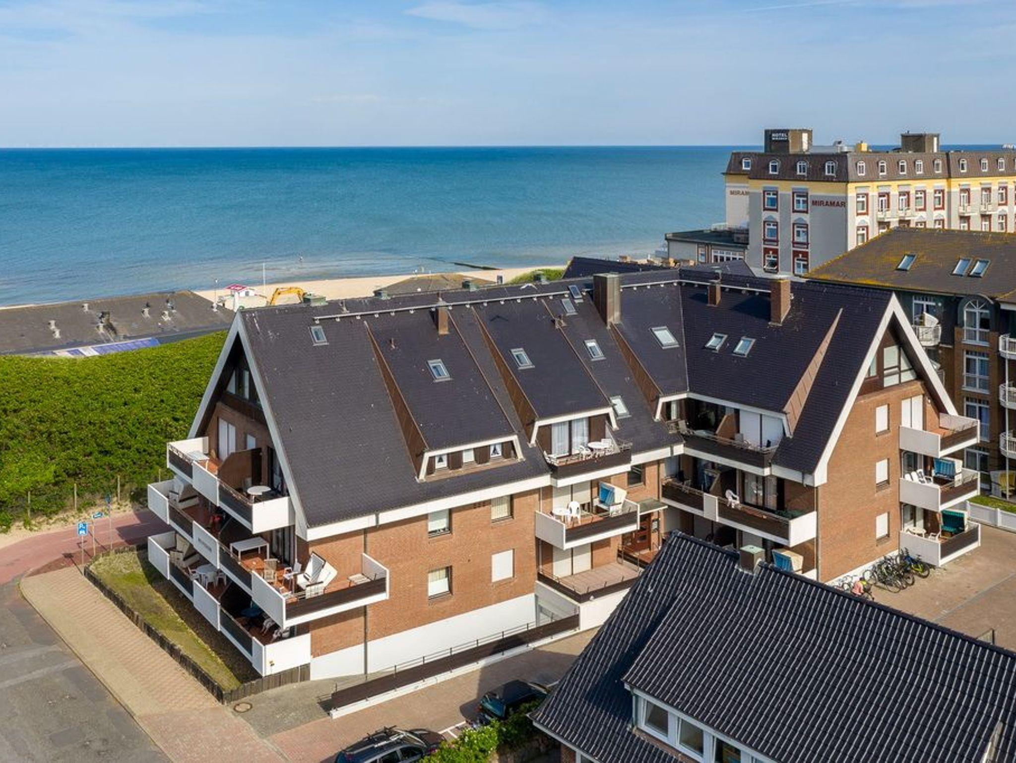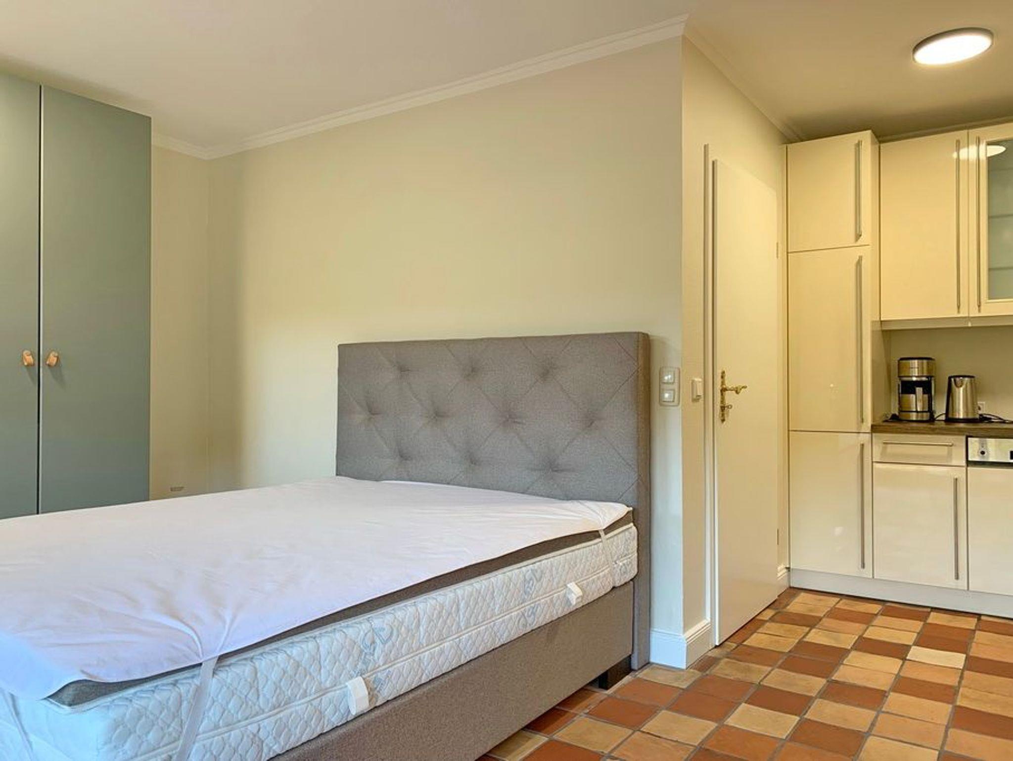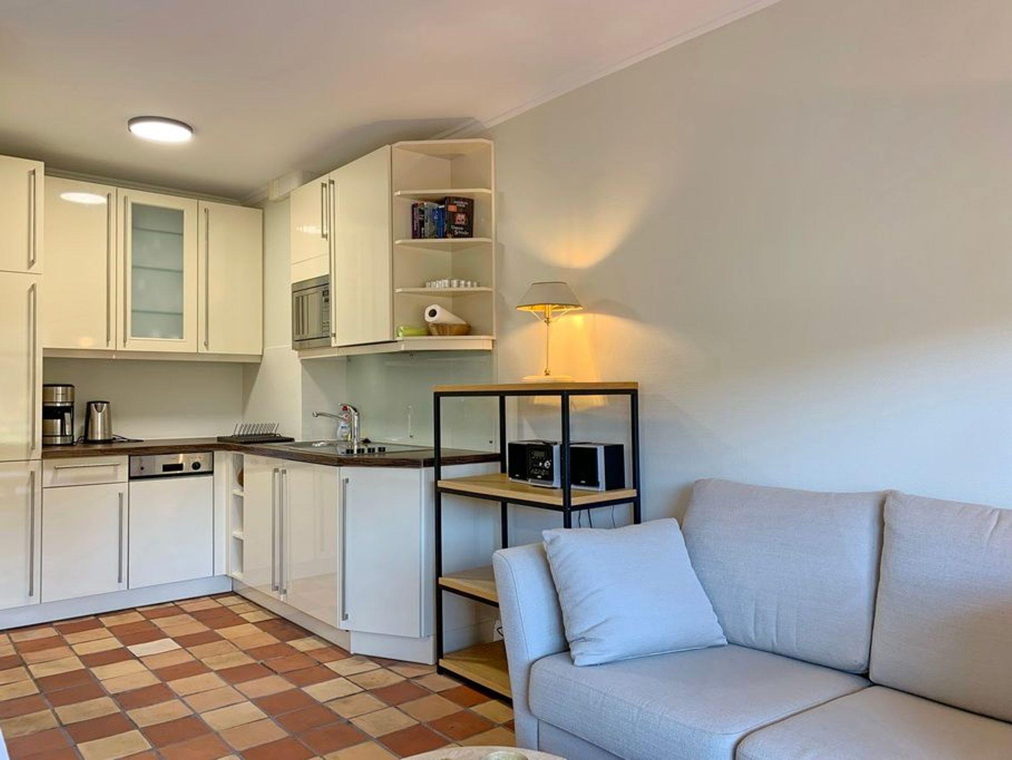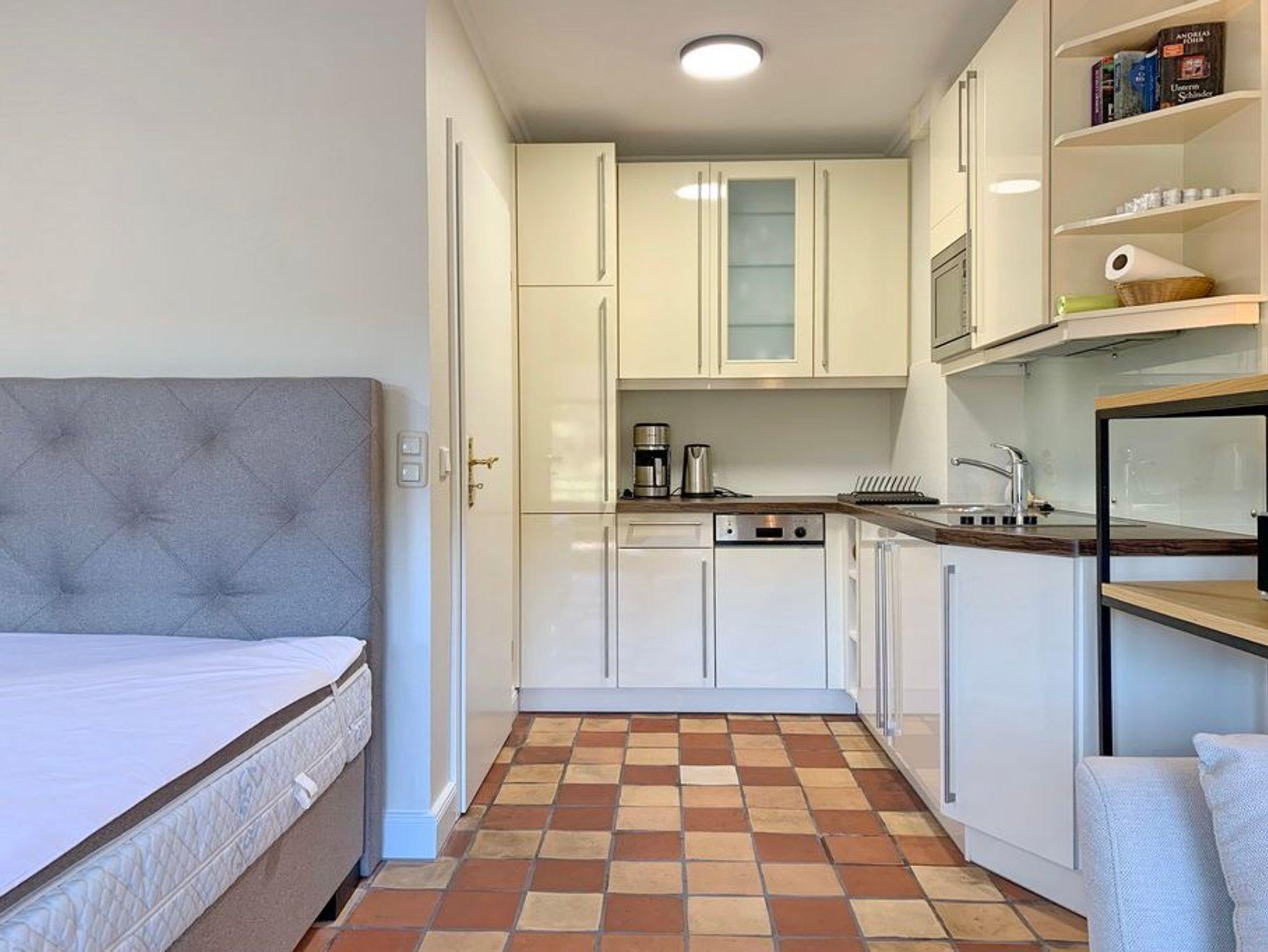 Schickes 1-Zimmer-Apartment mit Westbalkon und Strandkorb im Hochparterre des Haus Belvedere, ca. 38m², Nichtraucher. Wohn- und Schlafzimmer mit Boxspringbett (160x200), Kleiderschrank (1m), 2-Sitzer-Sofa und Hocker, Essplatz für 2 Personen, TV, Radio, offene Küche mit Geschirrspüler, Mikrowelle und 4-Platten-Ceranherd, Duschbad/WC. Die Wohnung ist komplett gefliest. Garagenstellplatz Nr. 2. Tierhaltung ist nicht gestattet. Bettwäsche und Handtücher sind zur Anreise aufgezogen!