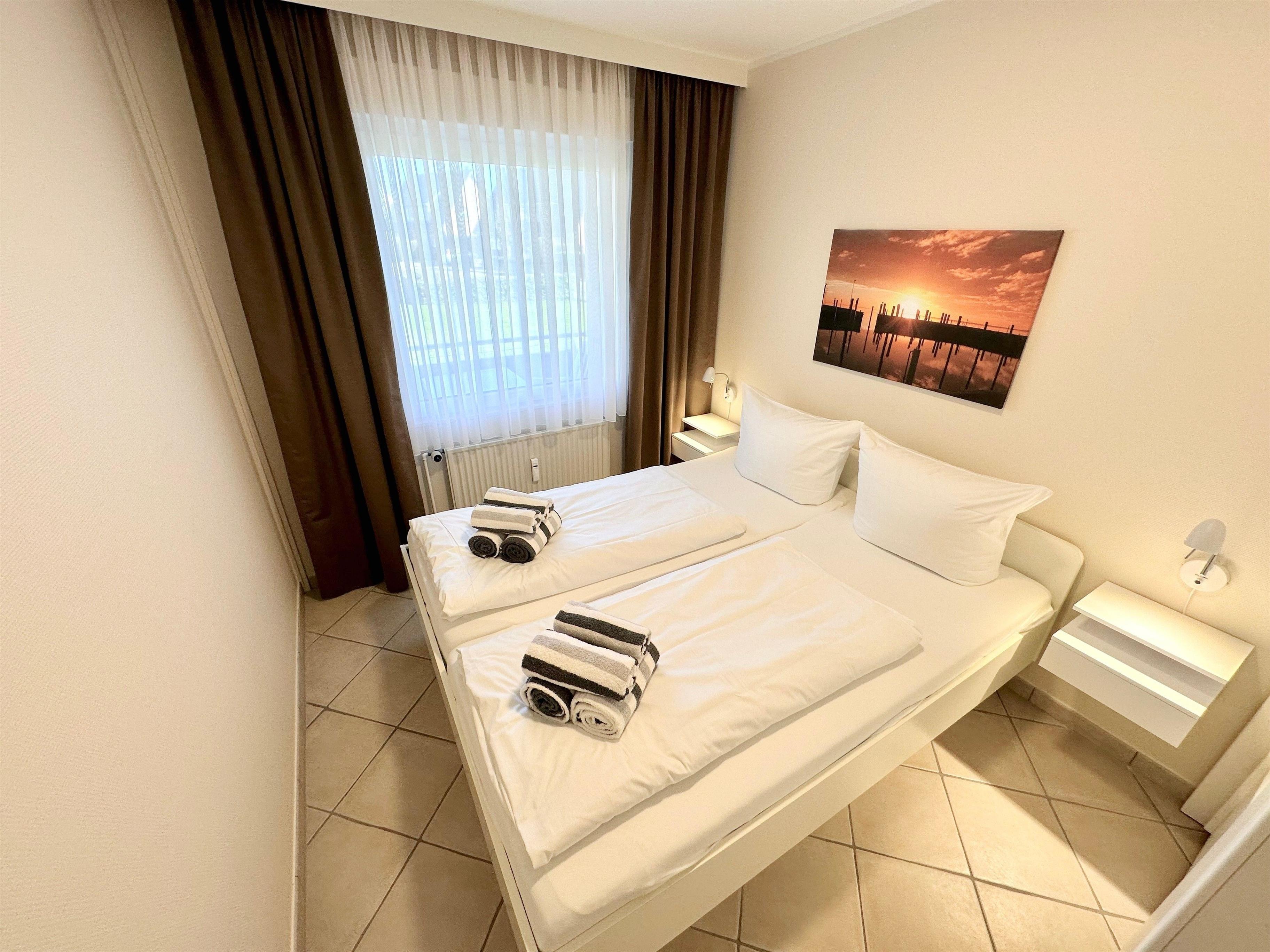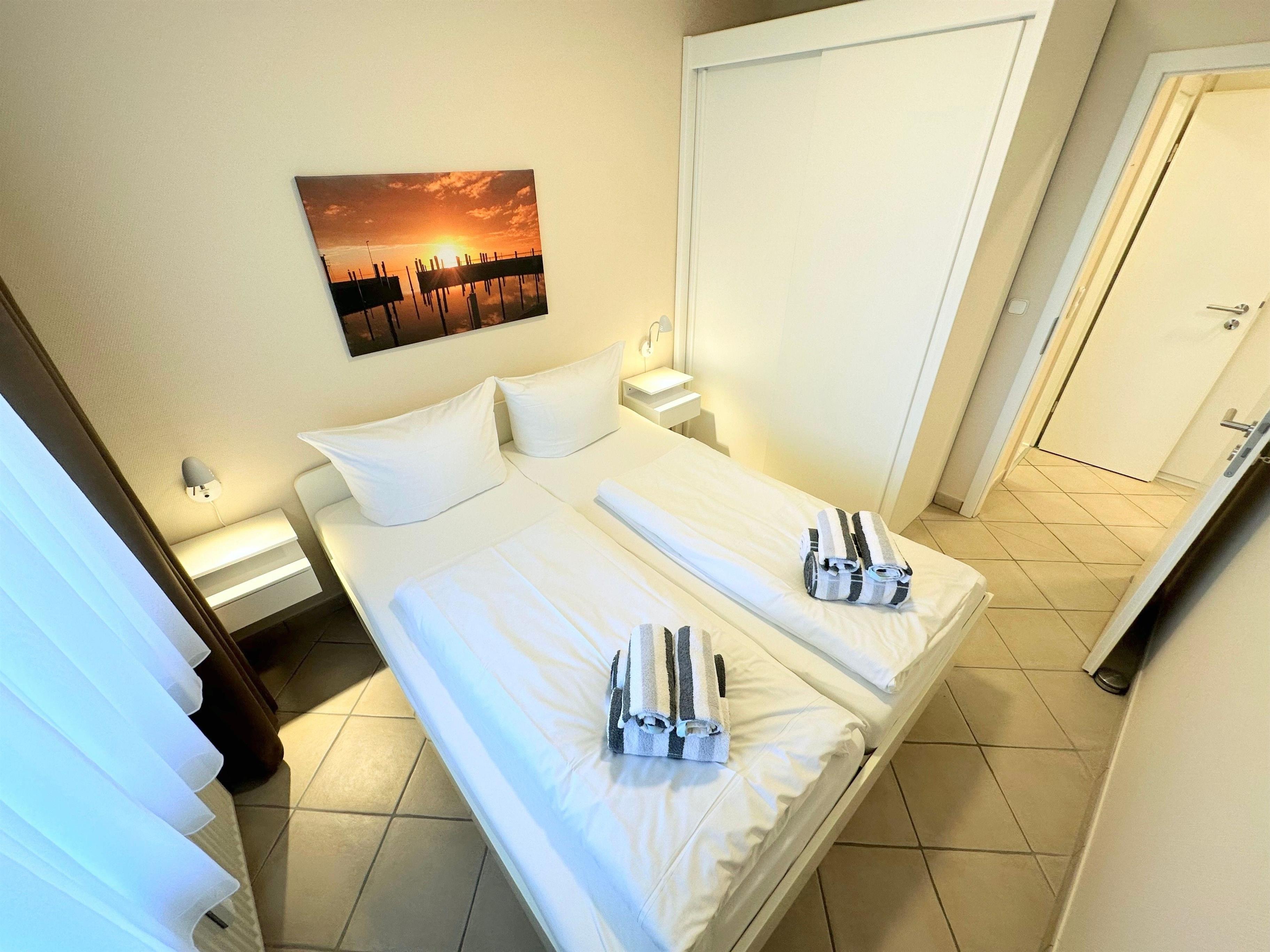 Die moderne Küche ist komplett ausgestattet mit einem Backofen, Mikrowelle, Cerankochfeld, Geschirrspüler und Kühlschrank – hier können Sie ganz nach Belieben kochen und sich verwöhnen lassen. Das Schlafzimmer bietet ein gemütliches Doppelbett (160 x 200 cm) mit getrennten Matratzen für einen erholsamen Schlaf. Das Duschbad mit WC rundet das komfortable Ambiente ab.
