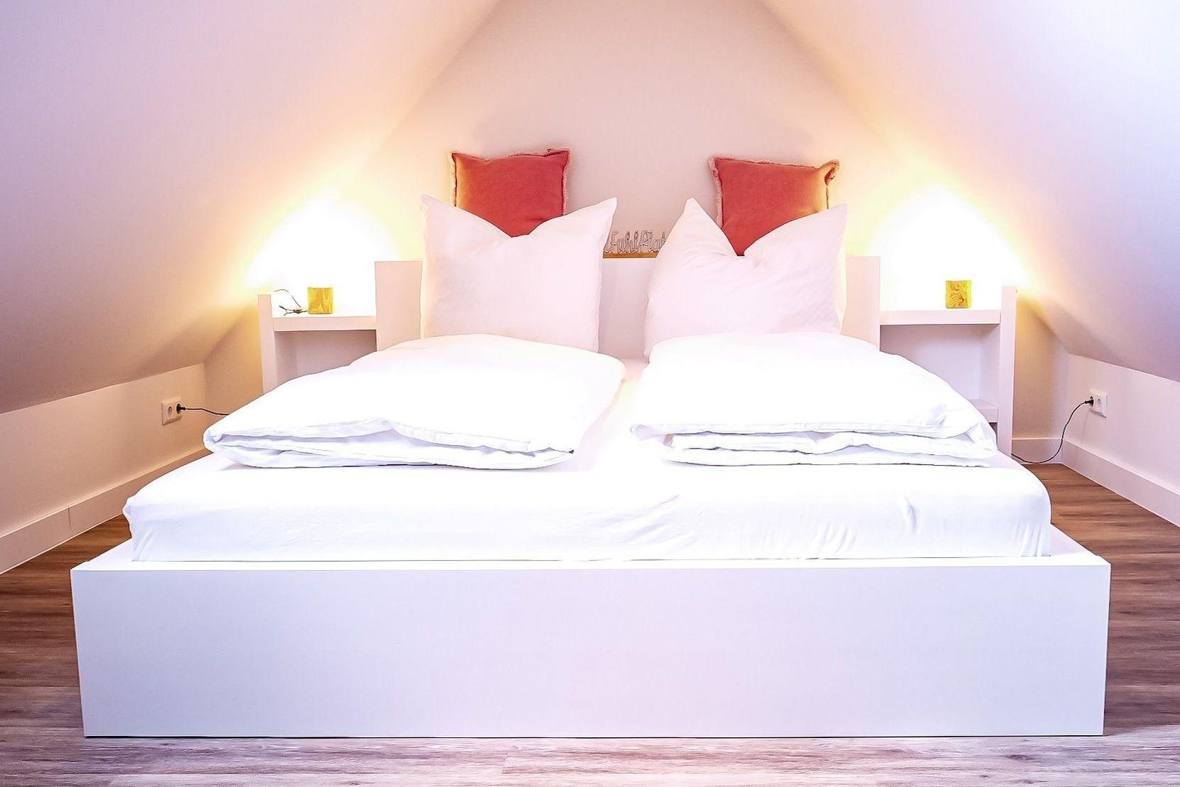 Ihr Apartment verfügt über einen Wohnraum, welcher über eine kleine, gut ausgestattete Küchenzeile für den täglichen Bedarf, einen TV und eine Sitzecke verfügt. Vom Wohnraum gelangen Sie über eine offene Treppe auf den Spitzboden, der zum Schlafzimmer ausgebaut wurde und Sie mit frischer Bettwäsche begrüßt (Bett 160x200cm). Im Duschbad mit Fußbodenheizung erwartet Sie reichlich Platz für Ihre Utensilien und frische Handtücher.