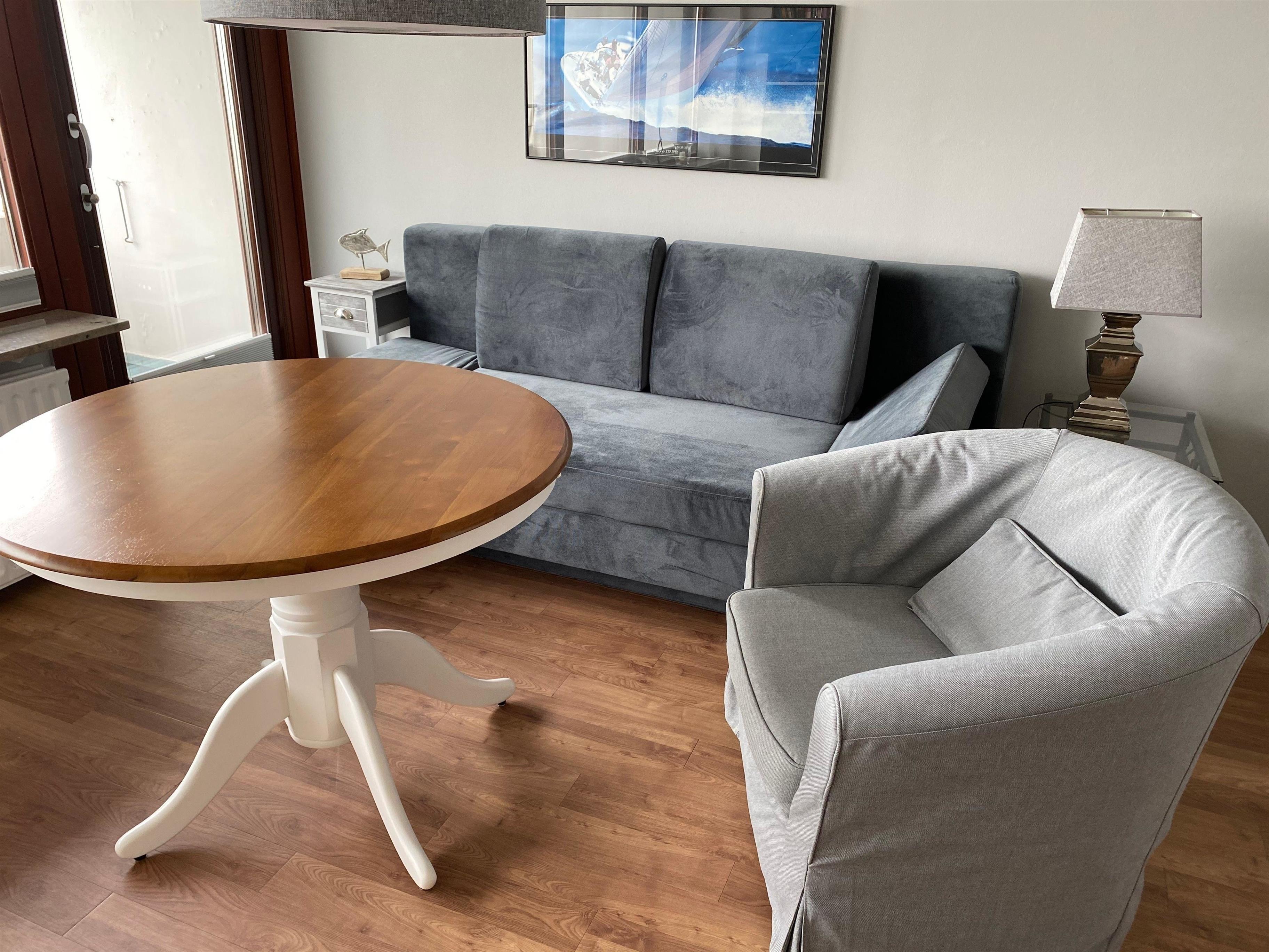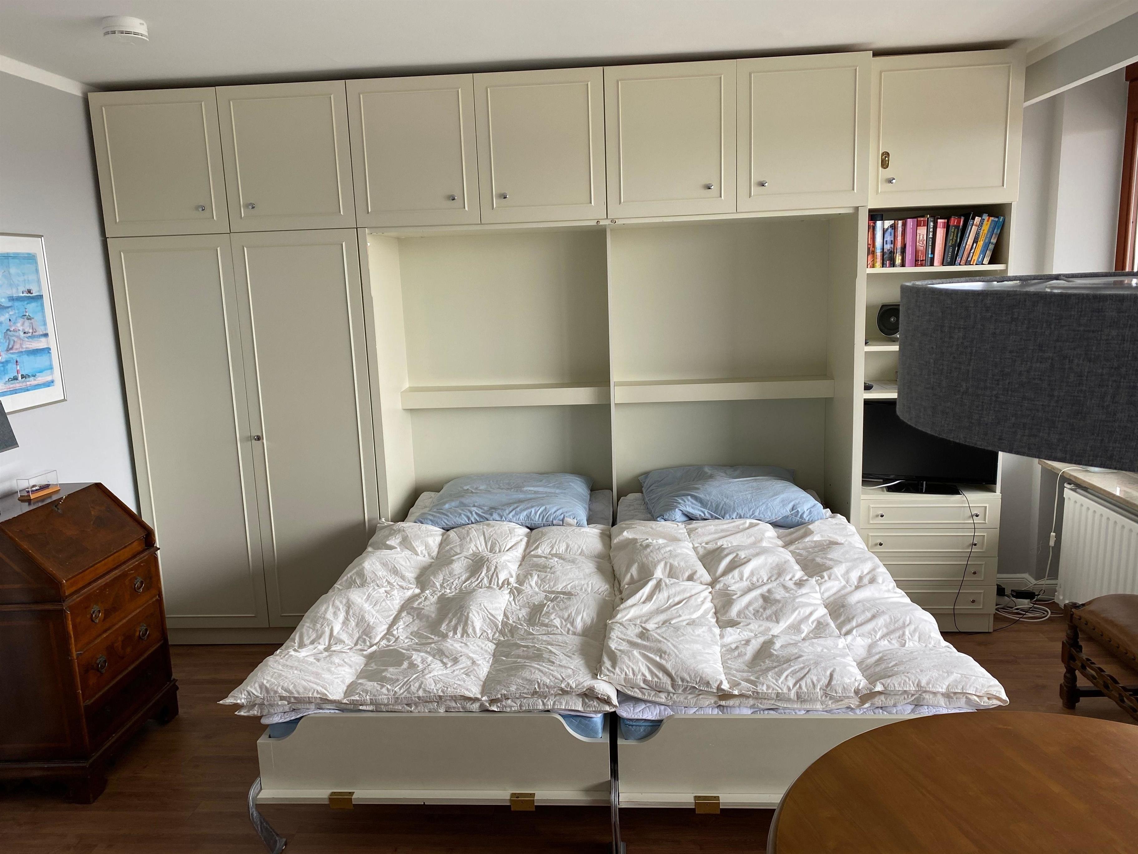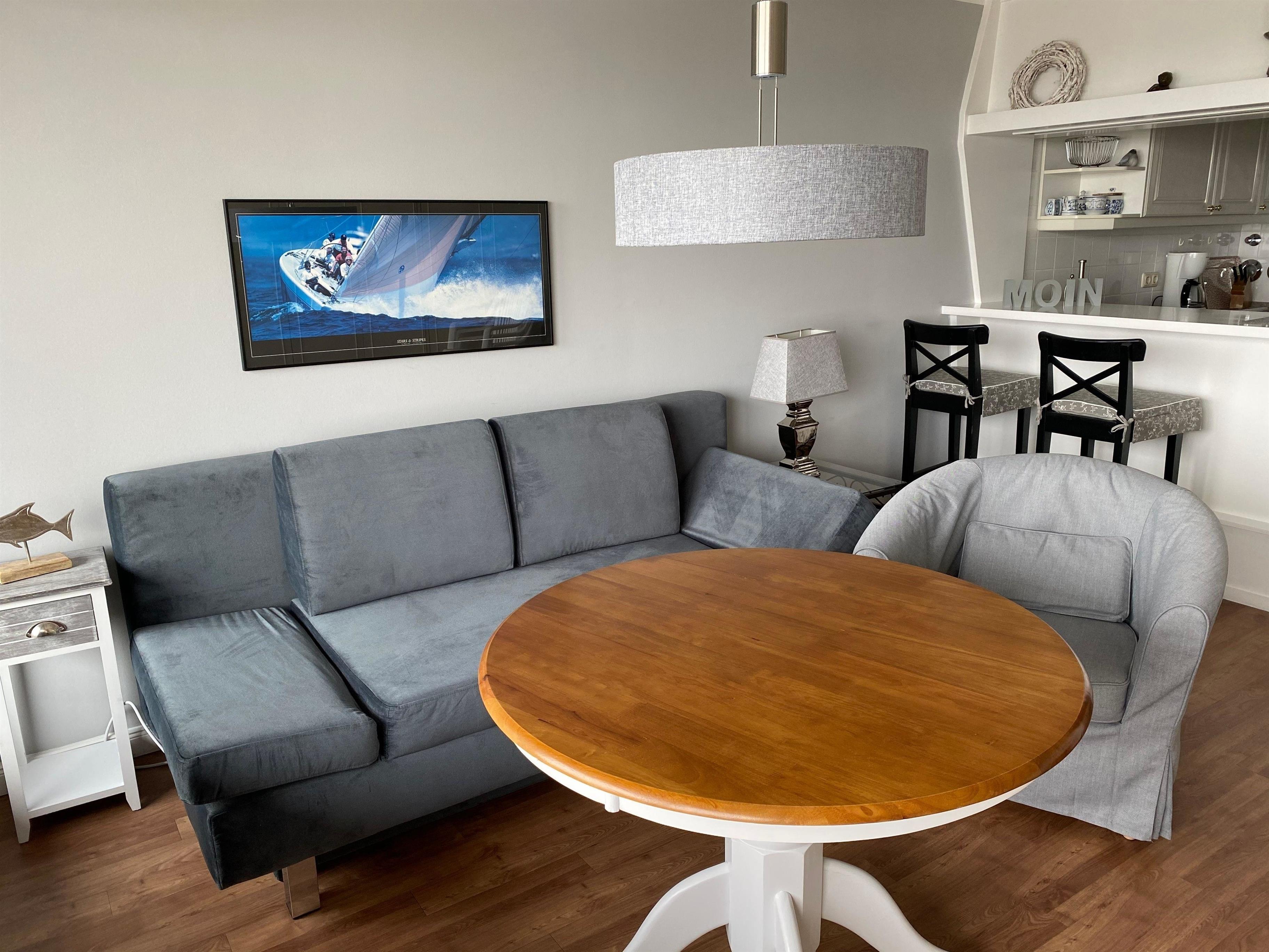 Die maritim und gemütlich eingerichtete 1-Zimmer-Wohnung verfügt über einen großzügigen Ostbalkon, perfekt geeignet für ein sonniges und windgeschütztes Frühstück. Es sind 3 Balkonstühle (mit Sitzauflagen) sowie ein Tisch vorhanden. Die Betten im Wohnbereich können aus einer Schrankwand einzeln ausgeklappt werden und ergeben zusammen ein großes Doppelbett.