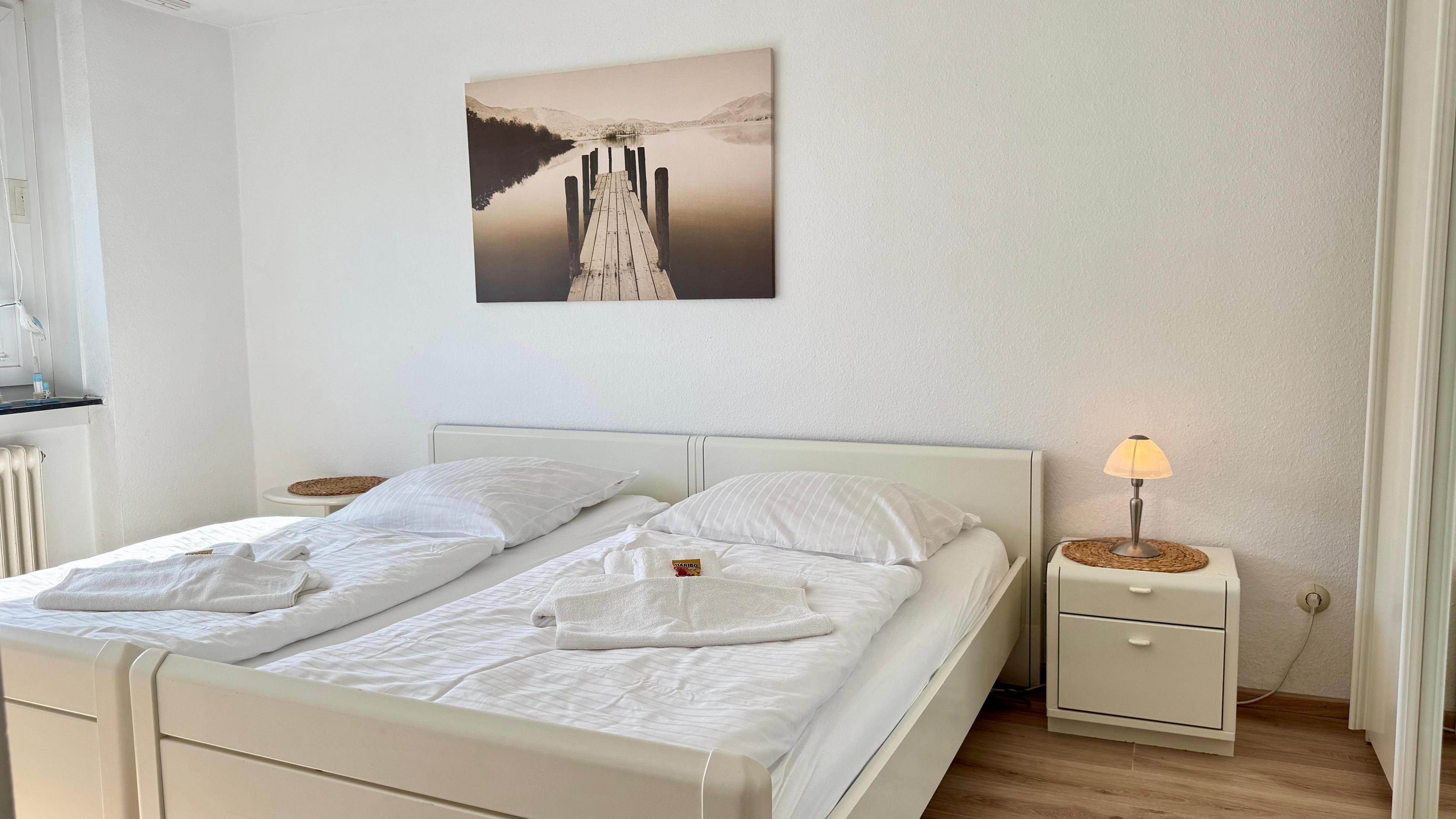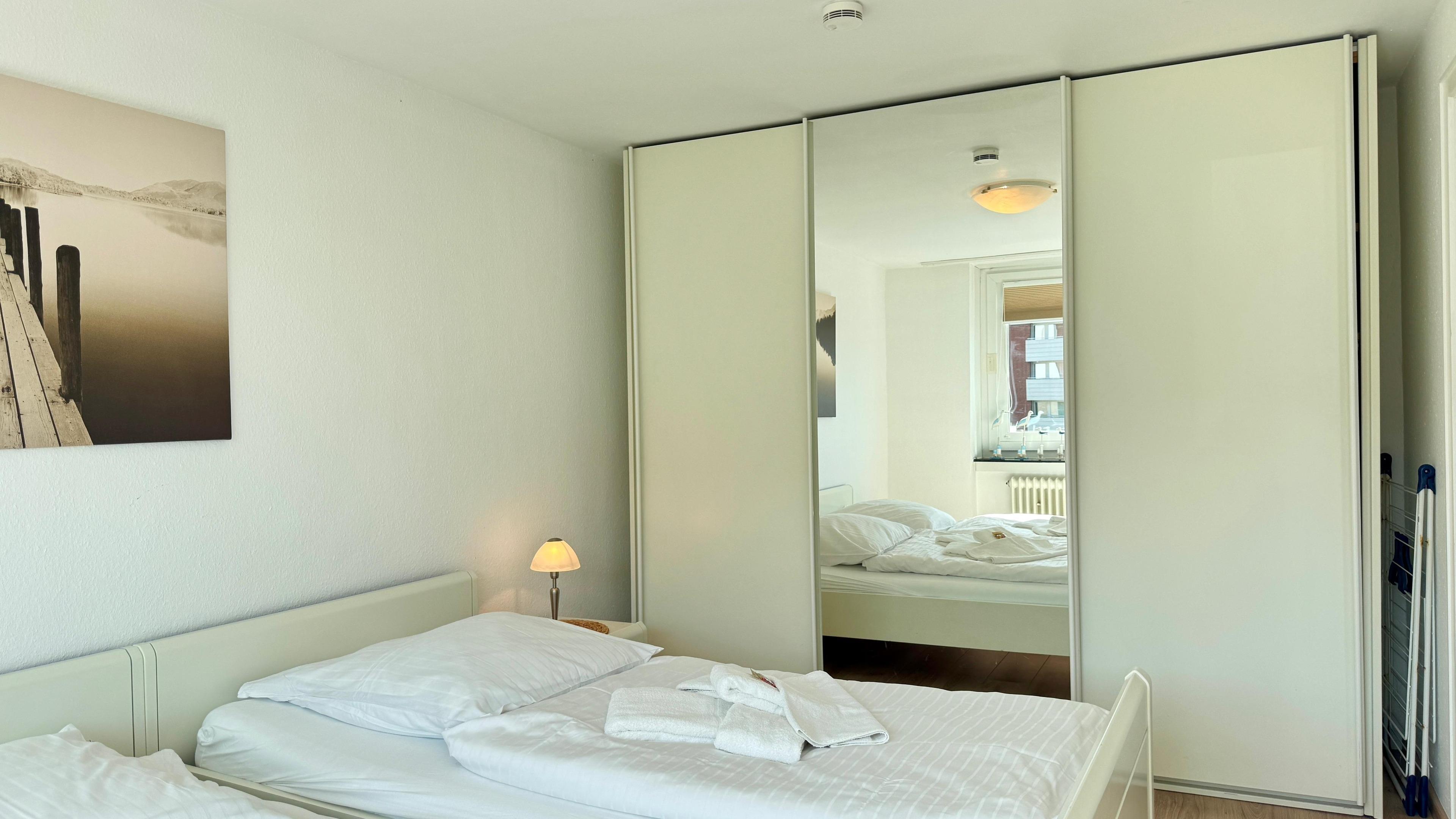 Das Schlafzimmer ist mit einem Doppelbett (bzw. auf Wunsch zwei Einzelbetten), Nachttischen und einem dreitürigen Schrank mit Schiebetüren und integriertem Spiegel ausgestattet.