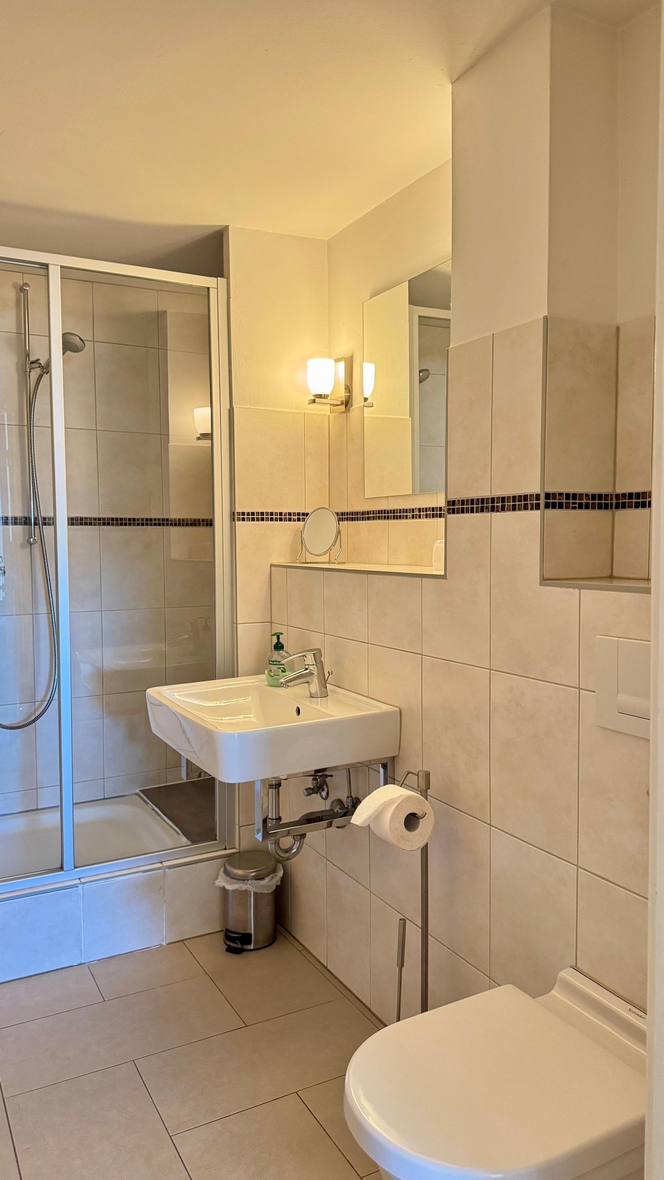 In dem Bad befindet sich eine großzügige Dusche, Waschtisch, WC und ein beheizter Handtuchhalter.