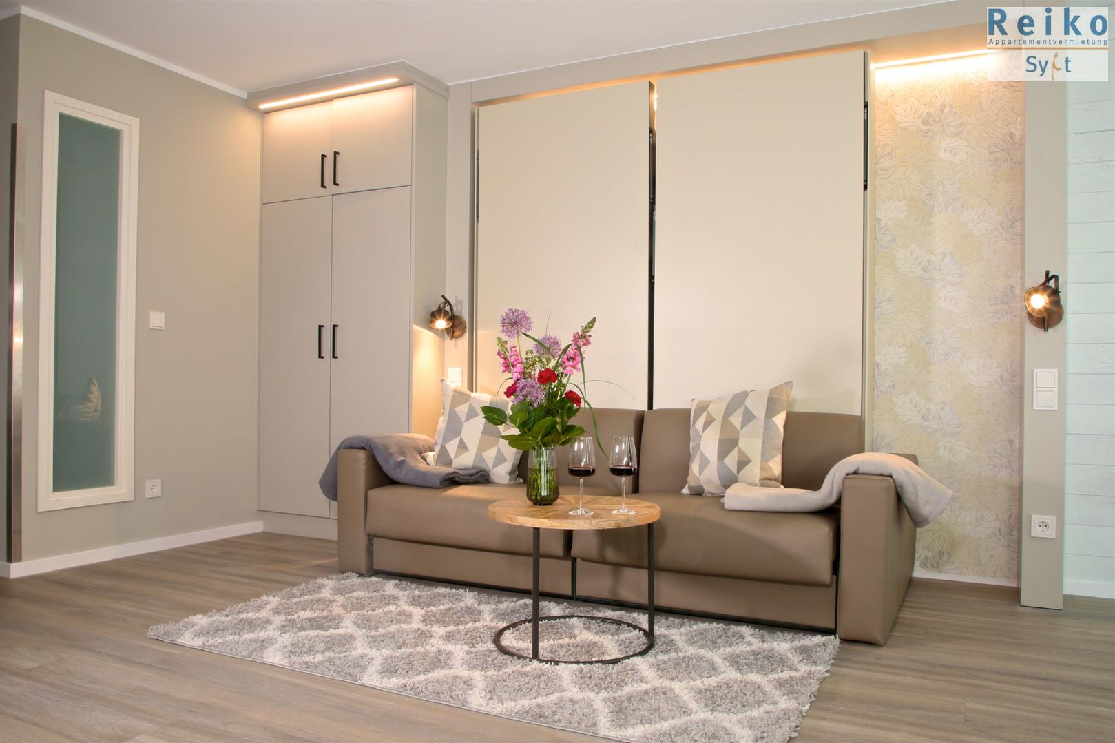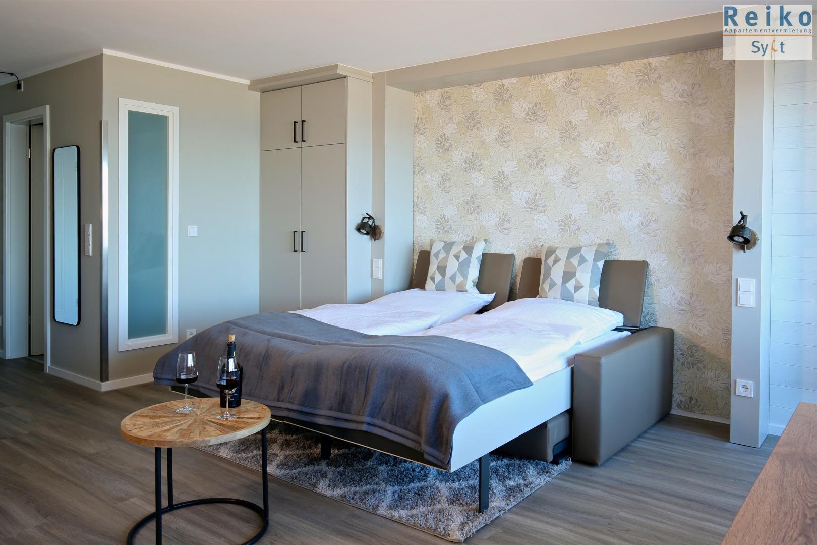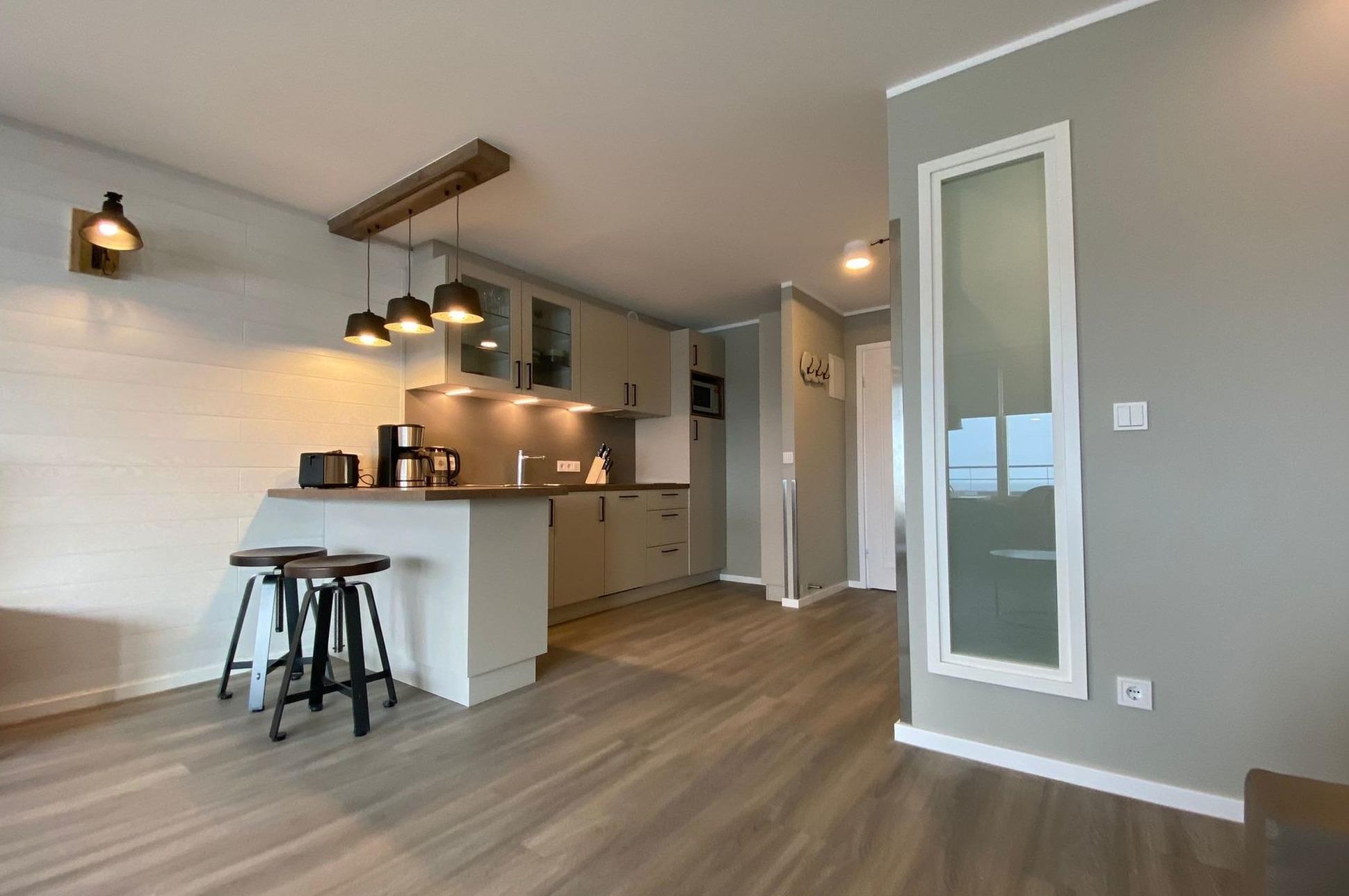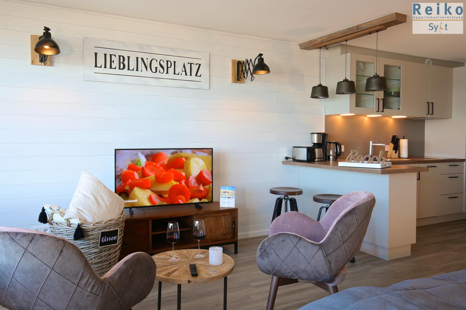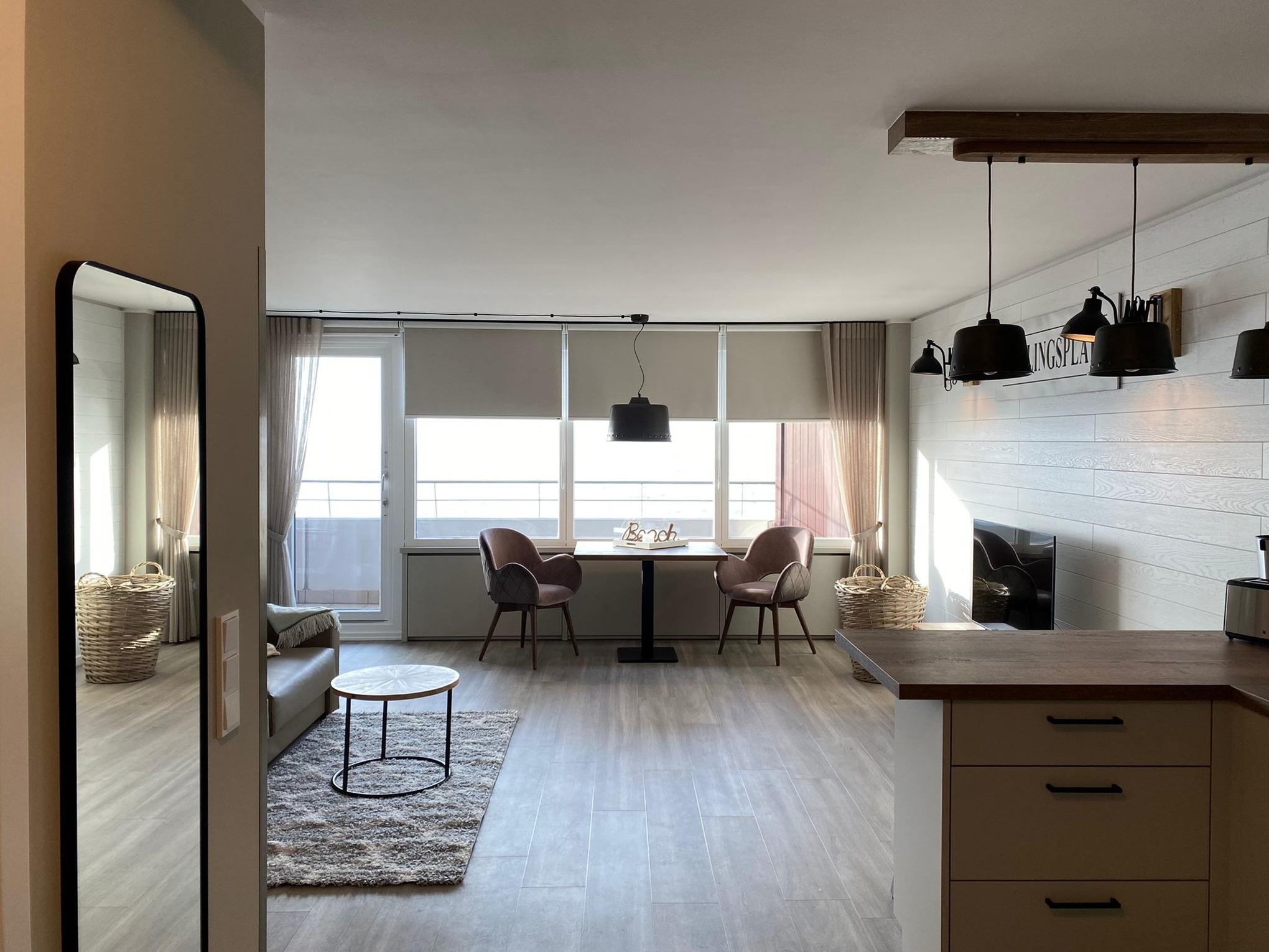 Im Wohn/Schlafraum befindet sich eine Sofa-Schlafkombination mit einzeln ausklappbaren Betten mit je 80x200 cm großen Matratzen sowie ein angeschlossener Essbreich mit zwei bequemen Sesseln am Fenster mit Nordseeblick. Ein Interentanschluss mit WLAN (ohne Gewähr) steht Ihnen zur Verfügung und ein 48 Zoll Flachbild-TV rundet das Bild ab. Die offene Wohnküche ist optisch durch einen Tresen vom Wohnbereich abgetrennt und sehr gut ausgestattet mit einer Mikrowelle, Geschirrspüler und einem 2-Platten-Cerankochfeld. Das Duschbad ist eine Kombination aus Holzelementen, grauen Fliesen und weißen Sanitärobjekten und sorgen für eine moderne Atmosphäre.