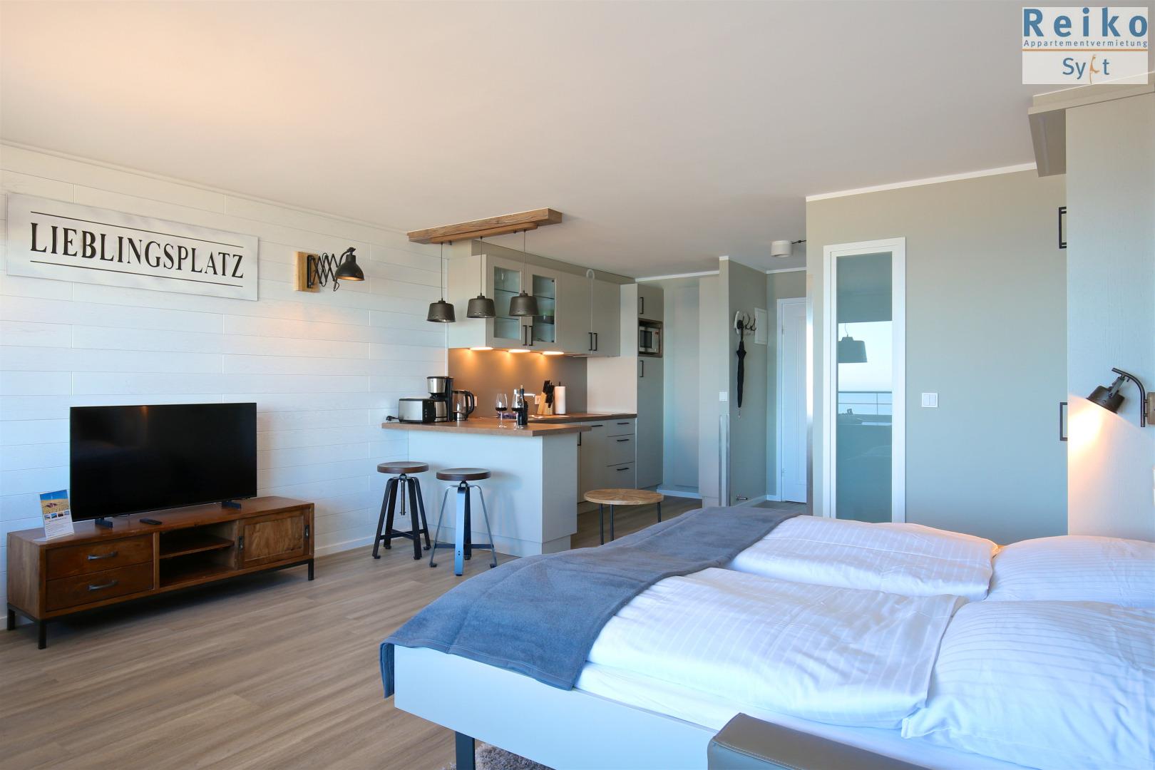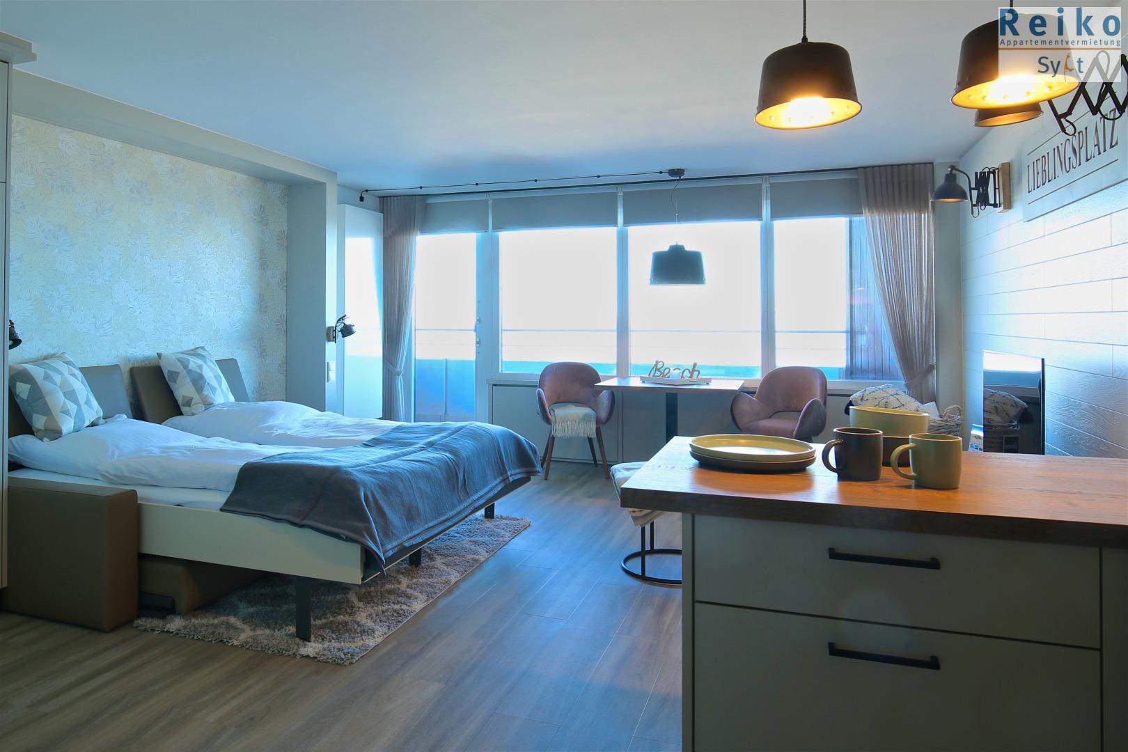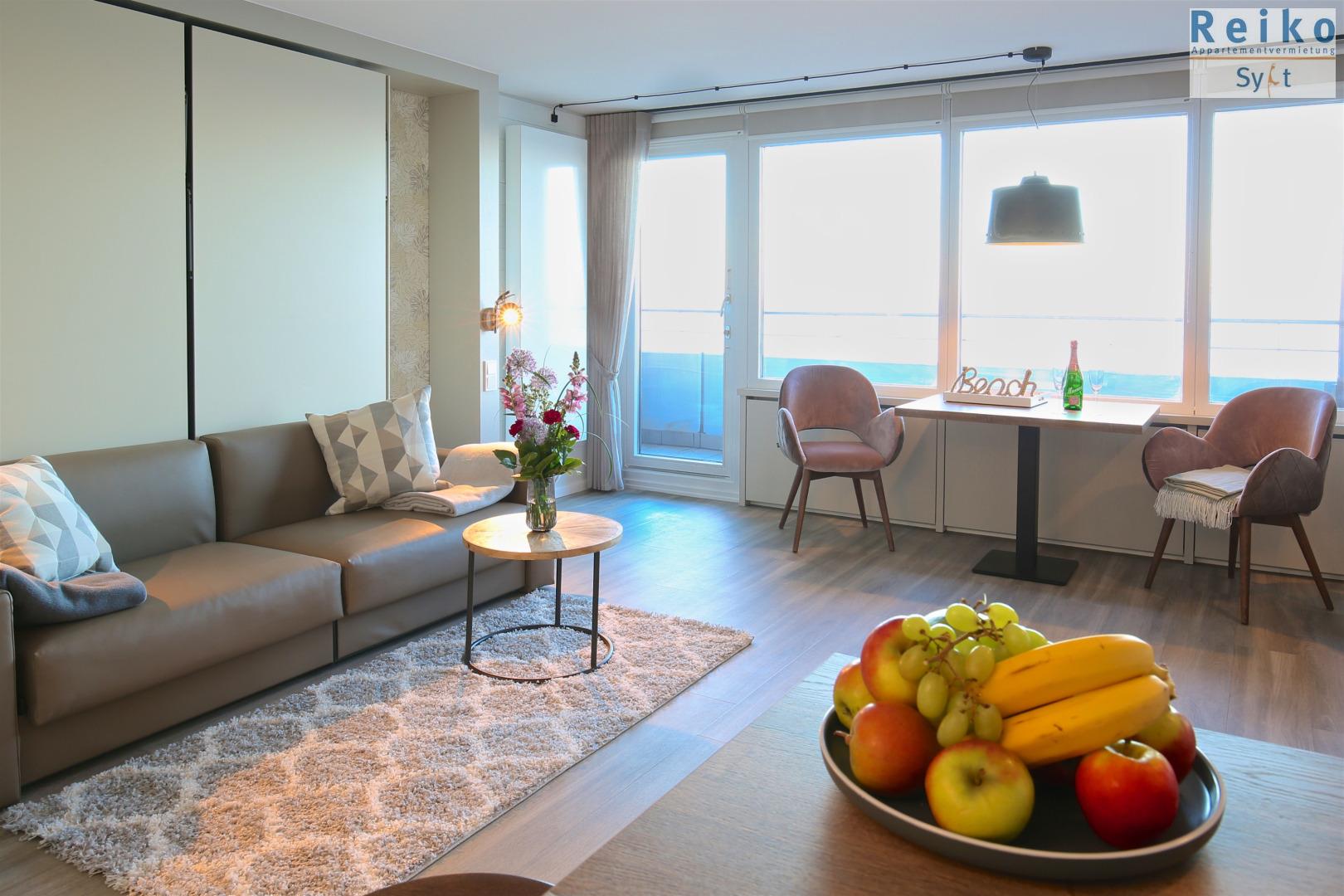 Moderne 1-Zimmer-Ferienwohnung mit Meerblick und Balkon in Westerland, perfekt für einen erholsamen Strandurlaub.
