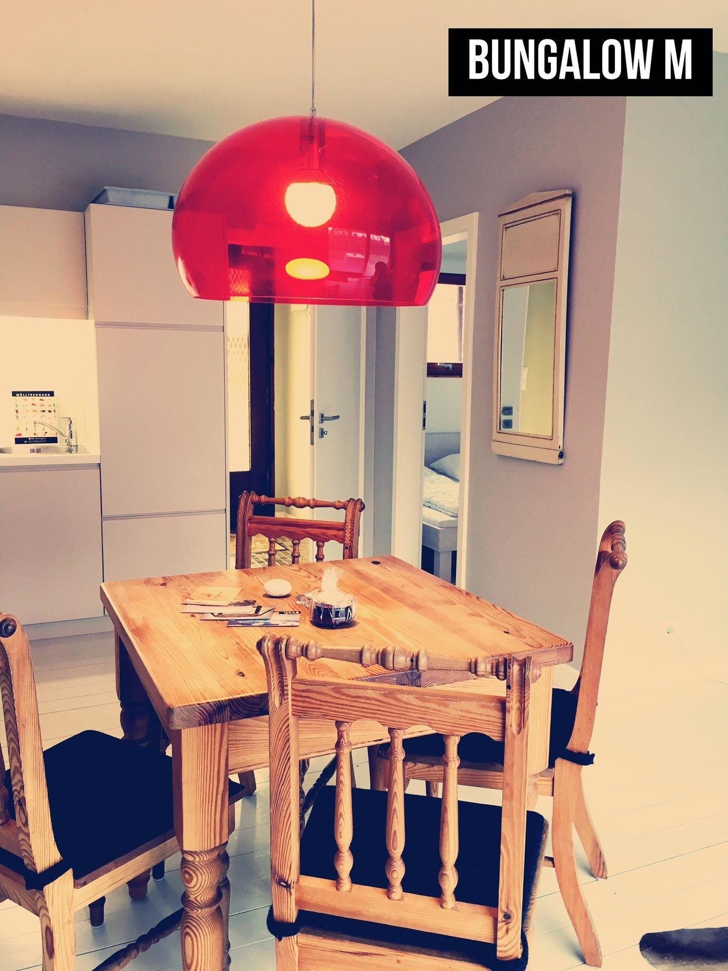 Der Bungalow M verfügt über ein Schlafzimmer mit Doppelbett (180 x 200) und einer Schlafcouch im Wohnzimmer. Er eignet sich optimal für zwei Personen, funktioniert aber auch mit 4 Personen. Er hat eine moderne offene Küche im Wohnzimmer, von hier kann man durch große Schiebefenster auf die Südterrasse und den Garten. Sie haben einen Parkplatz auf dem Grundstück..