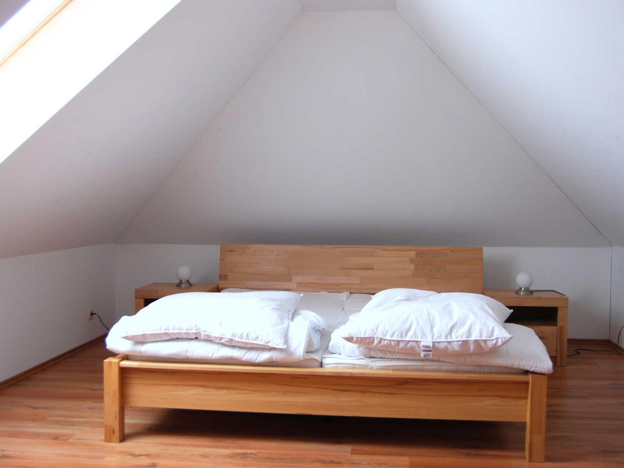 Die Ferienwohnung verfügt über zwei separate Schlafzimmer mit jeweils einem Doppelbett (2,00 x 1,80m, einzelnen 21cm dicken Komfort-Kaltschaum-Matratzen sowie sehr guten Lattenrosten). Ein Schlafzimmer befindet sich im Dachausbau und ist über eine offene Treppe vom Wohnzimmer aus zu erreichen. Es ist mit einem Highboard ausgestattet. Im zweiten Schlafzimmer befindet sich ein großer Kleiderschrank.