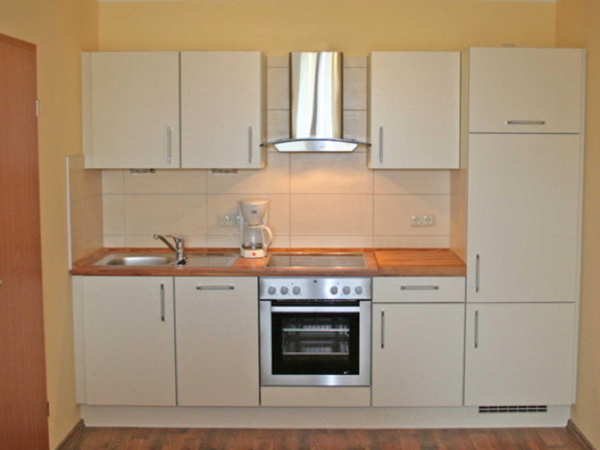 Die Küche (offen) ist mit AEG-Geräten ausgestattet: Geschirrspüler, Backofen, 4-Platten-Ceranfeld. Der große Kühlschrank mit Gefrierfach ist von Privileg. Die Küche ist weiterhin mit Toaster, Kaffeemaschine, Wasserkocher, Messerblock, Töpfe, Pfanne sowie ausreichend Geschirr und Besteck ausgestattet. Das Bad mit ebenerdiger Glasdusche, WC, Waschbecken und großem Spiegel ist inneliegend.