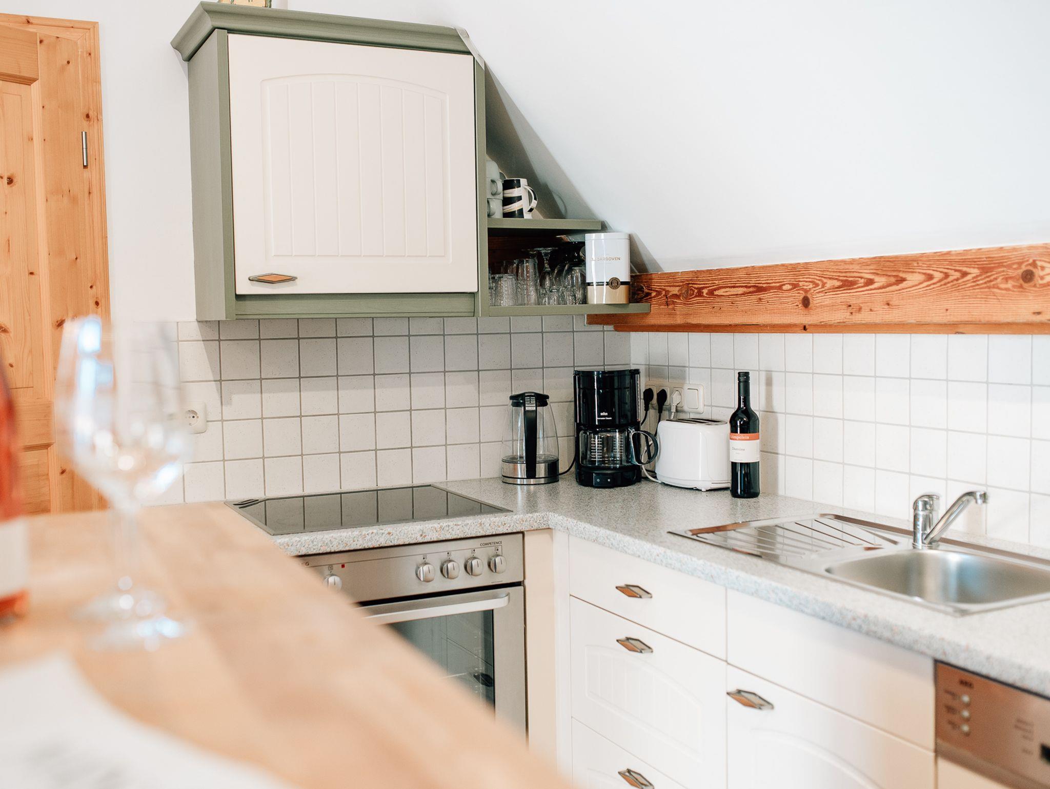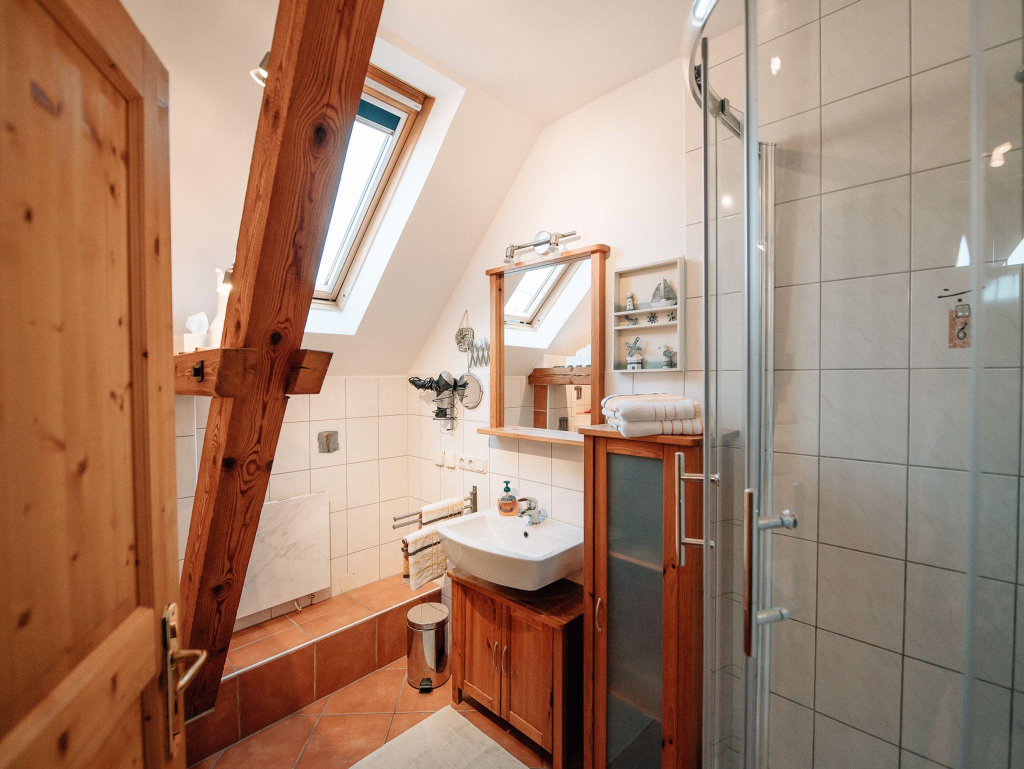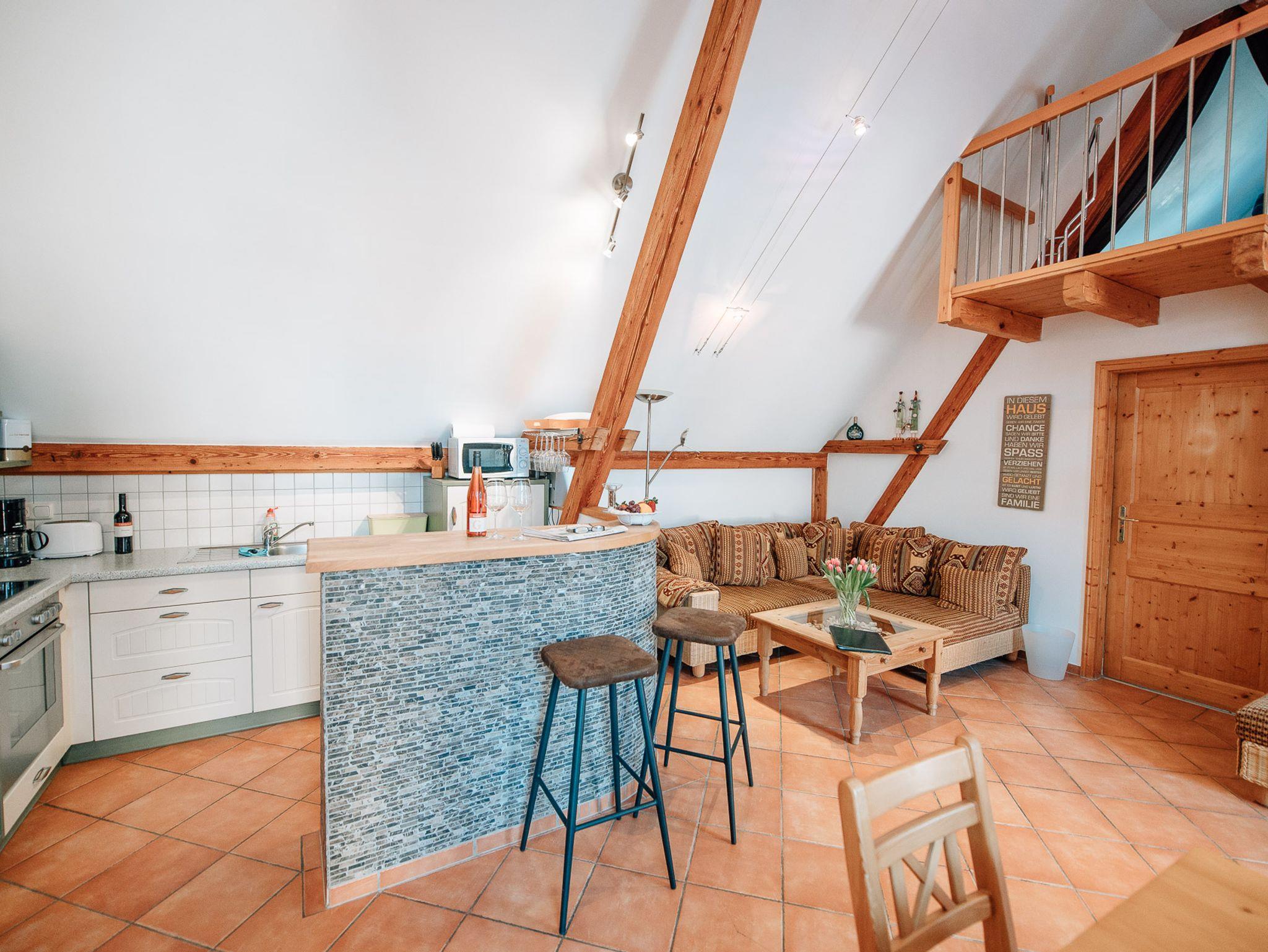 Zu der Ausstattung gehören mitunter: komplett ausgestattete Wohnküche mit Spülmaschine, ein Schlafzimmer mit Doppelbett, urige Schlafkoje unterm Dach mit zwei Einzelbetten, helles, freundliches Bad mit Dusche/ WC und Föhn. Alle Räume sind mit Fußbodenheizung ausgestattet. Die Bettwäsche wird gestellt, die Endreinigung ist im Preis enthalten.