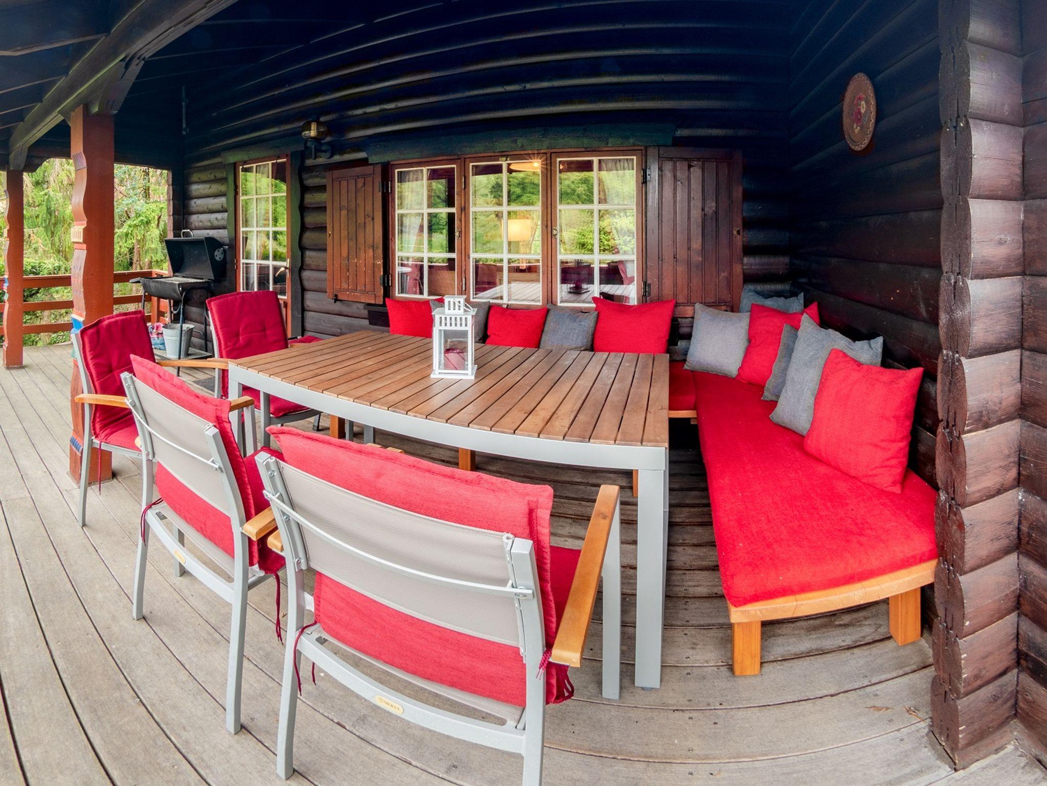 Auf der großen, überdachten Süd-West-Terrasse befinden sich Gartenmöbel mit Auflagen, Liegen und ein Weber-Holzkohlegrill. Eine große Sonnenliegewiese schließt sich gleich an der Terrasse an.