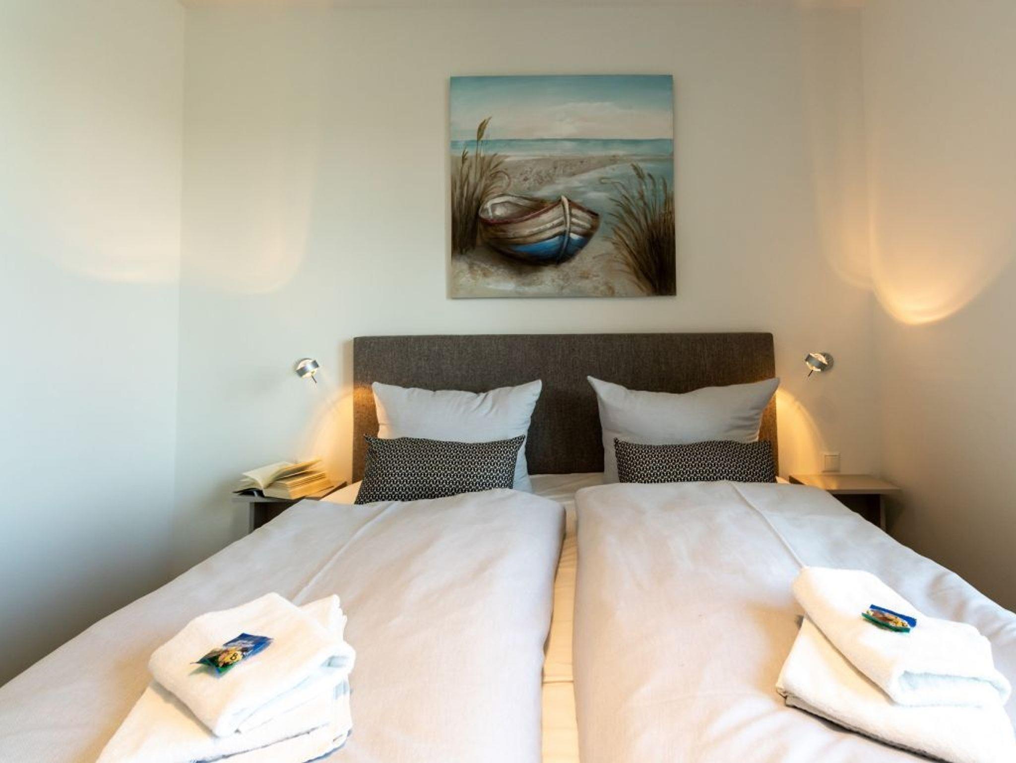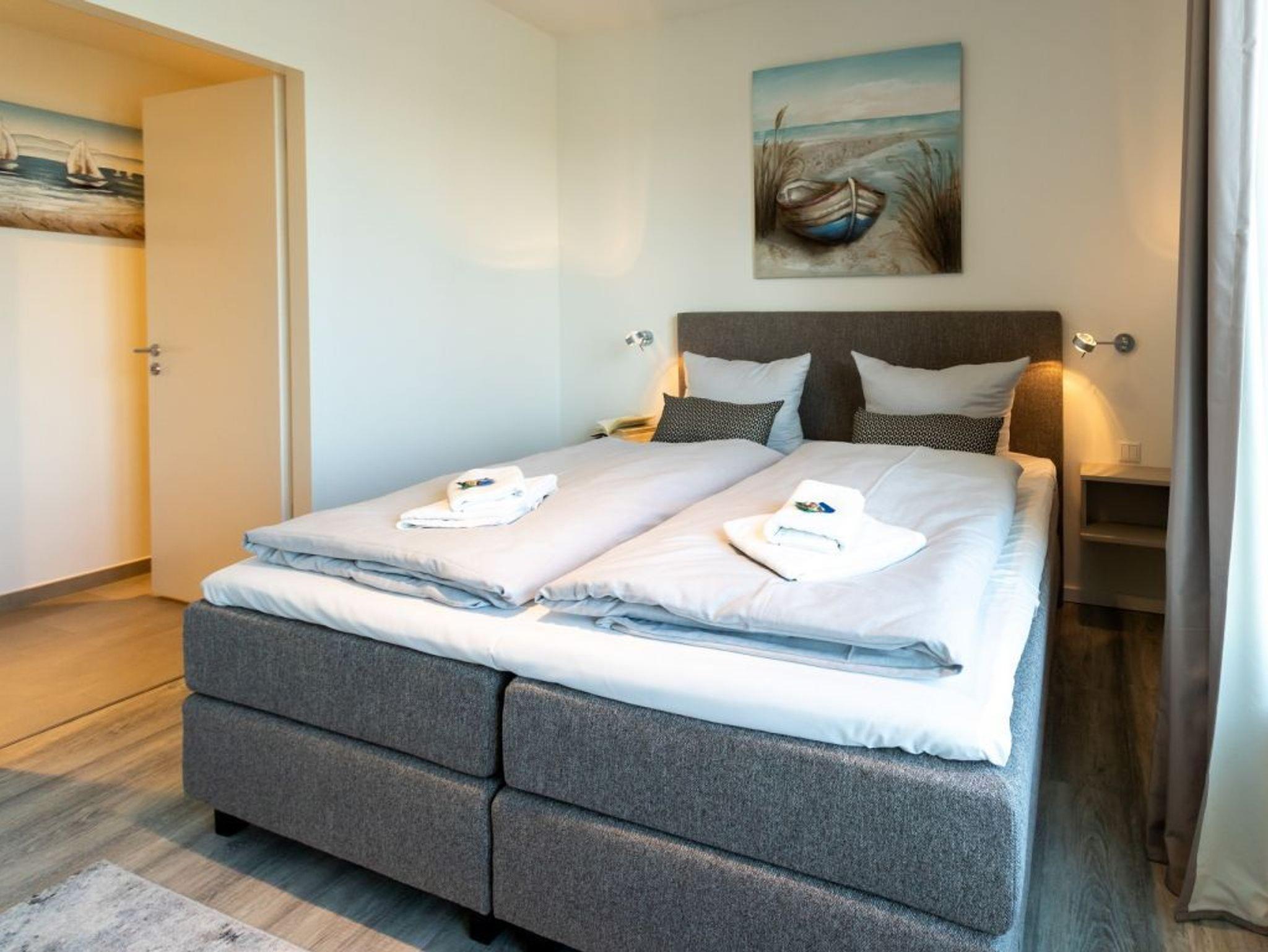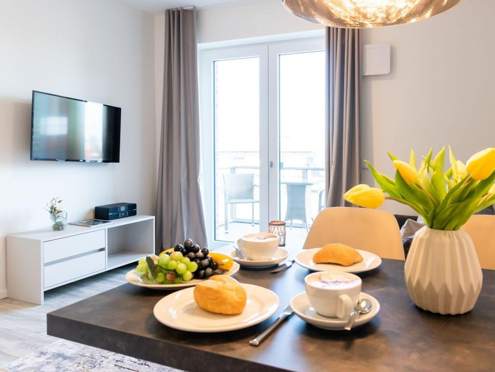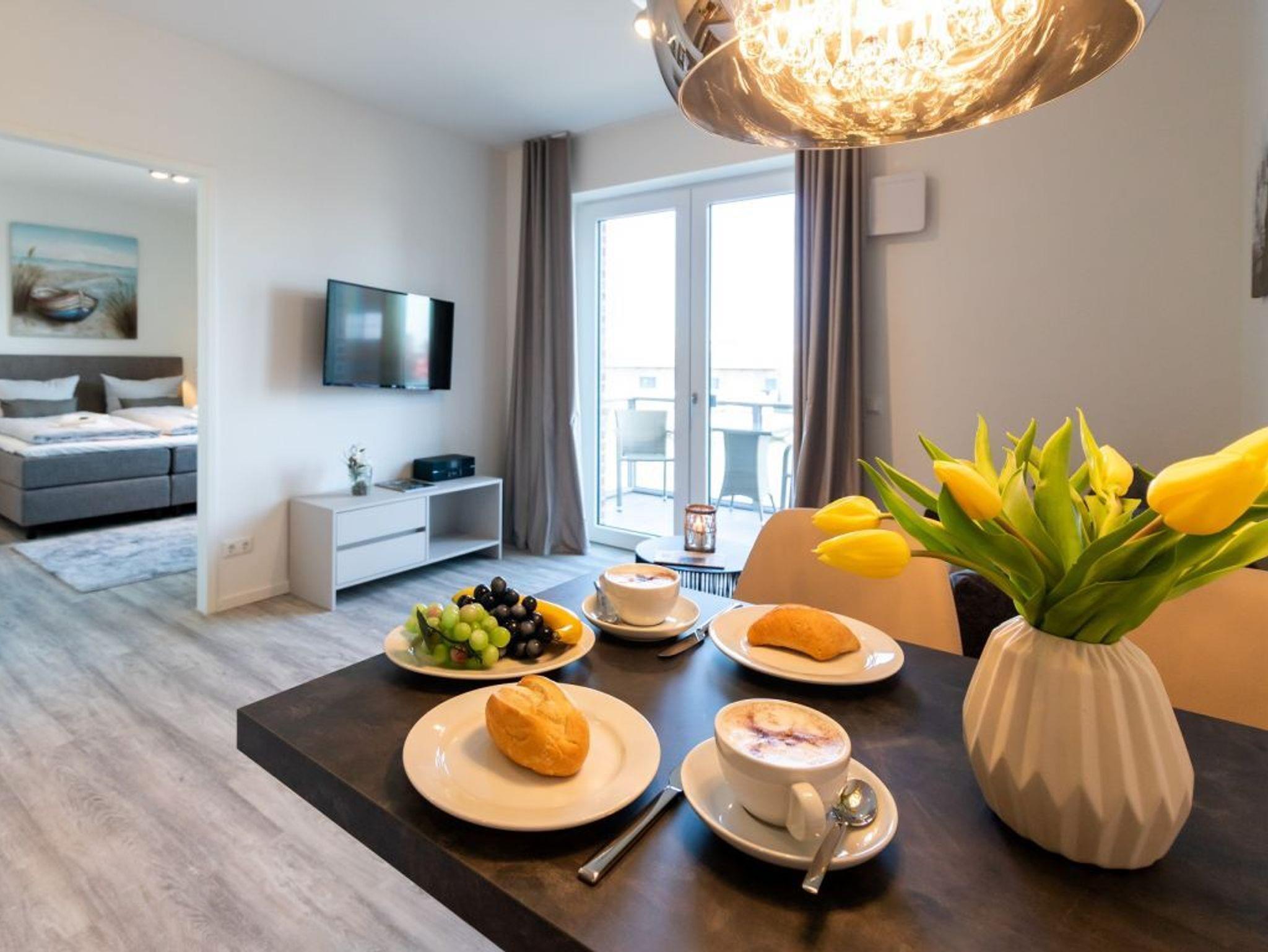 In den Wohnbereich ist eine offene Küchenzeile integriert, die technisch voll ausgestattet alles bietet, was für die Zubereitung von Urlaubsmahlzeiten benötigt wird. Ihre gemeinsamen Mahlzeiten können Sie gemütlich am Esstisch einnehmen. Für technische Unterhaltung sorgen ein TV-Gerät als Flachbildschirm mit Hotelmodus sowie Internet Radio. WLAN steht kostenfrei bereit. Geruhsame Nächte ermöglicht Ihnen ein separates Schlafzimmer mit Doppelbett und Garderobenschrank. Das innenliegende Komfort Badezimmer mit bodengleicher Dusche und Handtuchheizkörper lasst Sie gut in jeden Tag starten. Als inklusive Leistung sind bei Anreise die Betten für 2 Personen bereits für Sie bezogen und Hand/Duschtücher liegen bereit. Weitere Wäschepakete können kostenpflichtig zu gebucht werden. Bitte beachten Sie, dass es sich um eine Nichtraucherwohnung handelt. PKW-Stellplätze befinden sich kostenpflichtig im Parkhaus am Hafen in ca. 300 Meter.