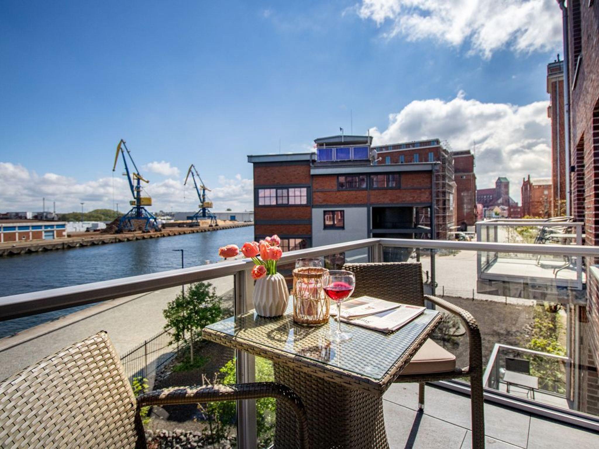 Luxuriöses 2-Zimmer-Appartement Hafenspitze 20 direkt am Alten Hafen von Wismar mit Balkon und Hafenblick.