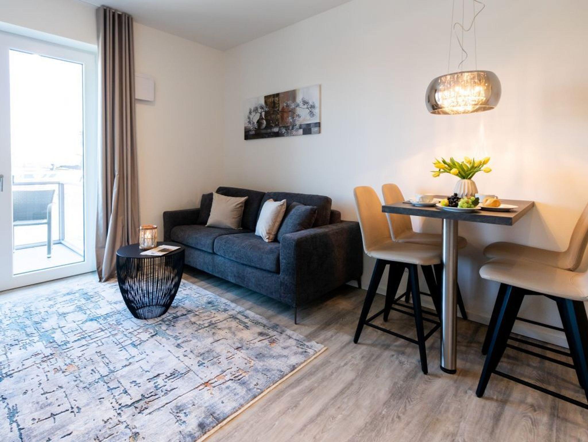 Sie verbringen Ihren Aufenthalt direkt am Hafenkai. In der 2. Etage erwartet Sie das moderne 2-Raum-Appartement Hafenspitze 20 mit einer Wohnfläche von 42qm und Balkon mit Hafenblick. Durch große Fenster fällt angenehmes Tageslicht in den schick möblierten Wohn-/Essbereich, wodurch dieser besonders einladend wirkt. Zugehörig ist ein saisonal möblierter Balkon in Richtung Holzhafen. Die geschmackvolle Ferienwohnung ist nahezu perfekt für eine Belegung mit 2 Personen, lässt aber durch das im Wohnraum vorhandene Schlafsofa eine Belegung mit bis zu 4 Personen zu.