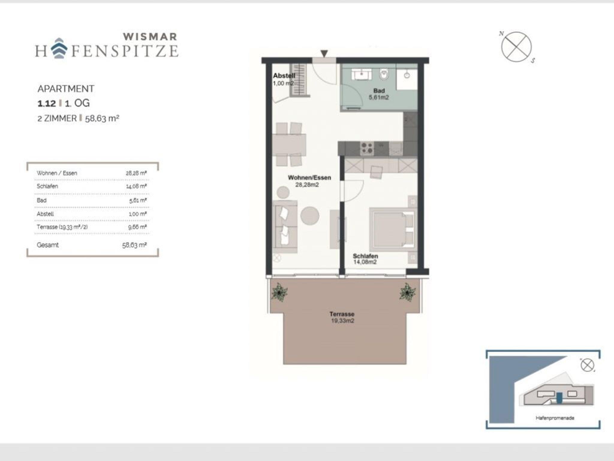 Luxuriöses 2-Zimmer-Appartement Hafenspitze 12 mit Hafenblick und Süd-West-Terrasse in Wismar.