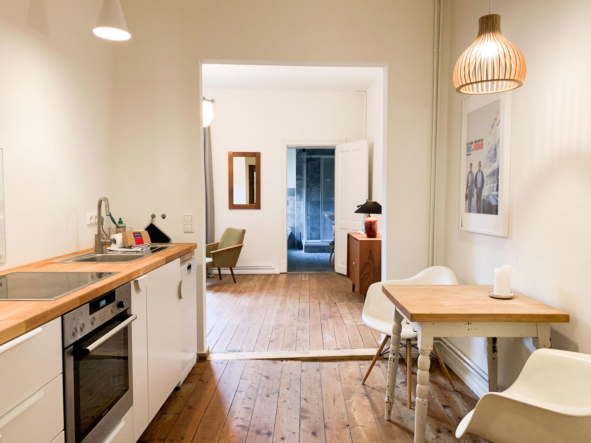 Bei der Einrichtung wurde bewusst auf 08/15 und Ikea Presspappe verzichtet: sämtliche Möbel sind aus Vollholz. Das Wohnzimmer ist (mit Ausnahme des Flachbildschirmes inklusive Netflix) im Mid Century Stil eingerichtet. Der Boden im Bad besteht aus Kieselsteinen, die Wandkacheln aus Schiefer. Die Küche ist klein aber extrem funktional und bietet Gästen dank des Brotbackautomaten die Möglichkeit, einfach und lecker ihr eigenes Brot zu backen. Natürlich haben Sie im ganzen Appartment Zugriff auf das kostenlose Gäste WLAN.