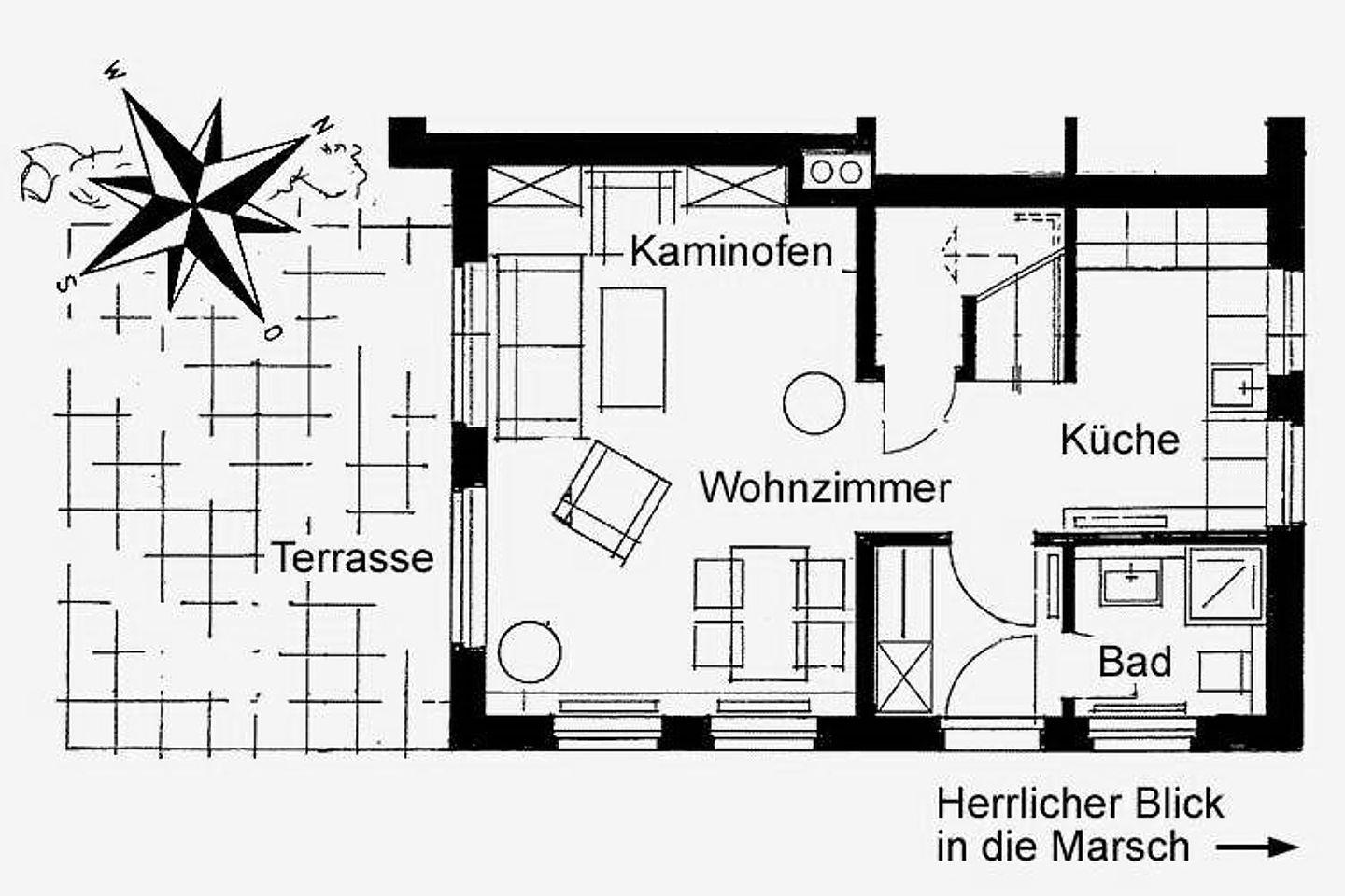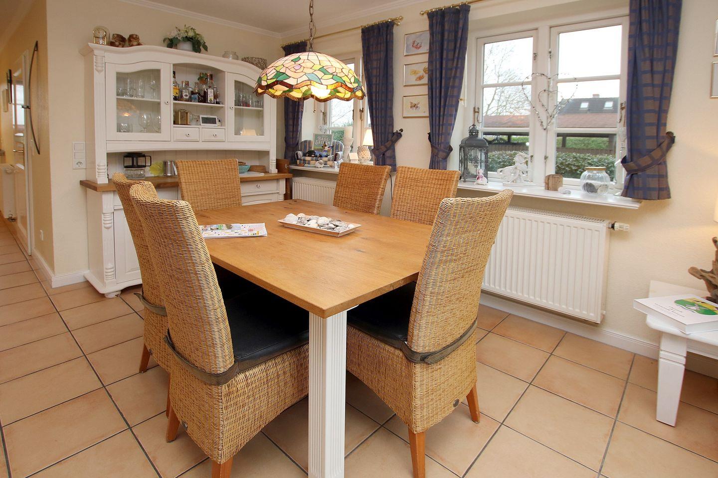 WOHNZIMMER: mit 2 x 2er Couch und 1 Hocker, Kaminofen. Separate KÜCHE: Komplett ausgestattet mit viel Komfort. Essplatz für 6 Personen. BAD 1 im EG: Dusche/WC. Eingangsflur. Im 1 OG befindet sich das BAD 2: Dusche/WC. SCHLAFZIMMER 1: Doppelbett und Kleiderschrank, TV. SCHLAFZIMMER 2 mit 2 Einzelbetten, TV. Die Haushälfte ist zur Marsch hin gelegen. Das Zentrum vom Wyk erreichen Sie in ca. 20 - 30 Min. Fußweg. Zum Strand sind es mit dem Fahrrad ca. 10 - 15 Minuten. Ein Bäcker ist in der Nachbarschaft. Die Haushälfte ist im EG mit Fliesen ausgelegt. Bettwäsche und Handtücher werden inklusive gestellt.