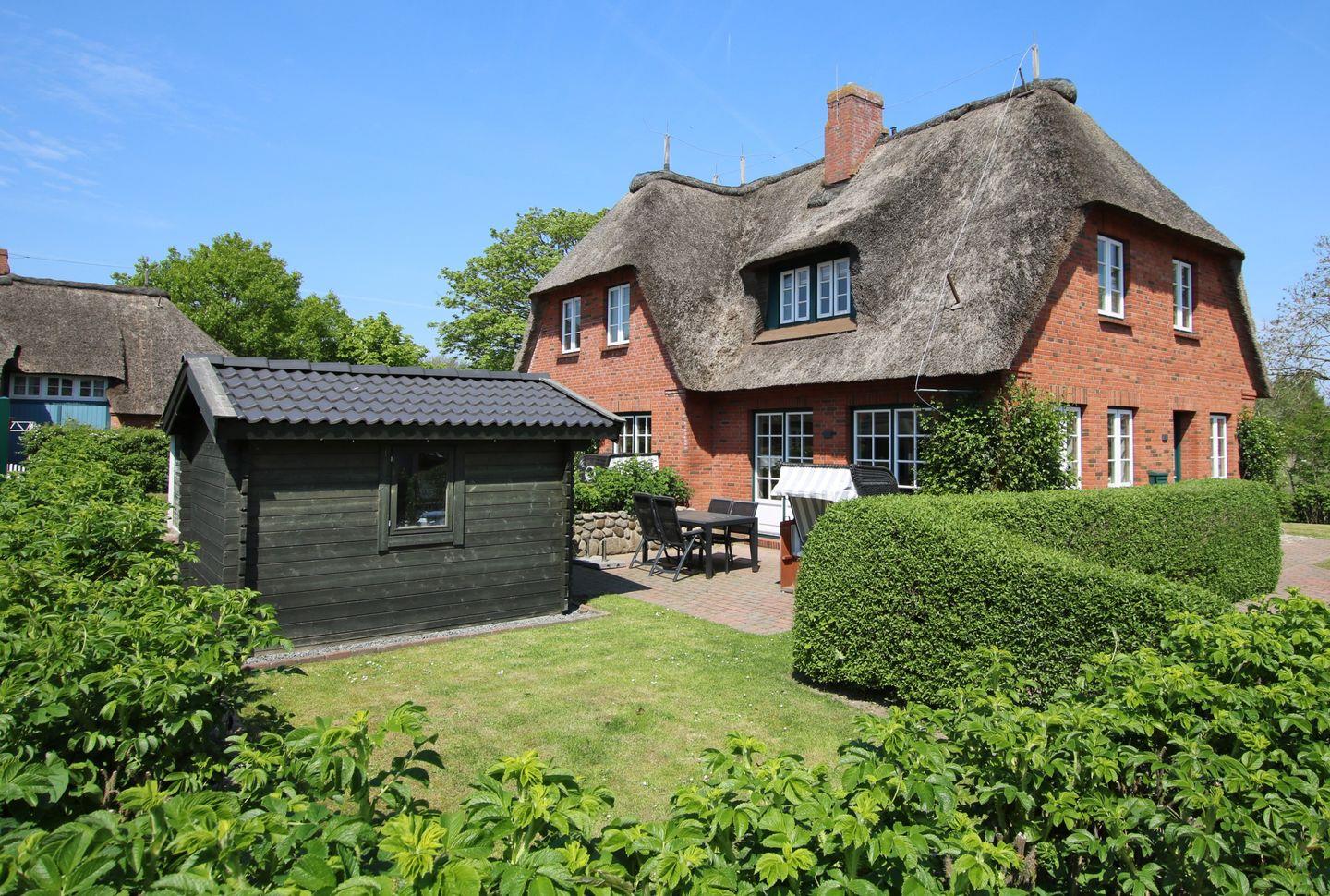 Gemütliche Doppelhaushälfte unter Reetdach in Wrixum mit Kamin, Terrasse und Garten für entspannte Ferien.