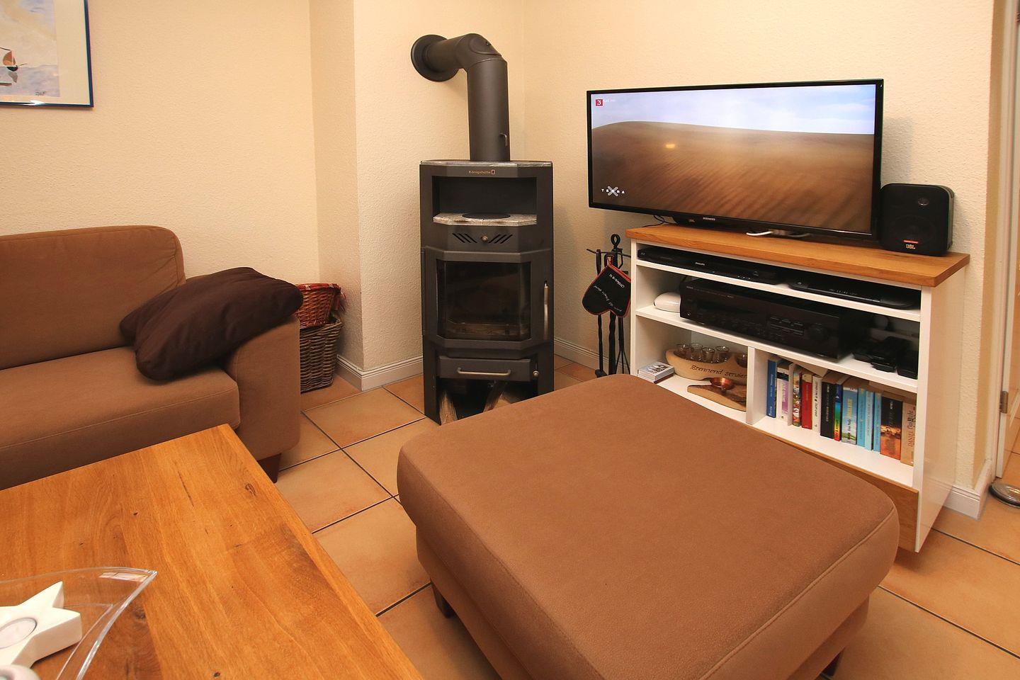 - Wohnzimmer mit 2 x 2er Couch, Kaminofen, Essplatz für 6 Personen