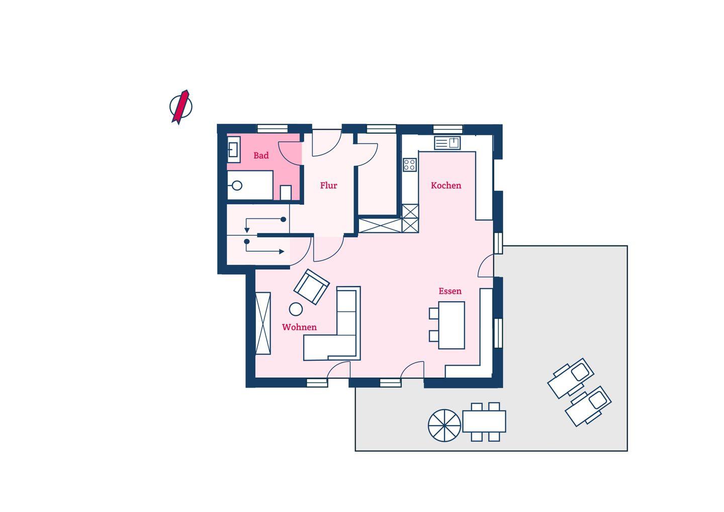 Im Erdgeschoss befinden sich der großzügige Wohn- und Essbereich mit offener Küche, sowie ein Duschbad und ein Hauswirtschaftsraum mit Waschmaschine und Trockner. Sowohl über den Wohnbereich als auch über die Küche gelangen Sie direkt auf die Terrasse und in den Garten. Der Kamin sorgt auch an kühleren Tagen für eine wohlige Atmosphäre.
