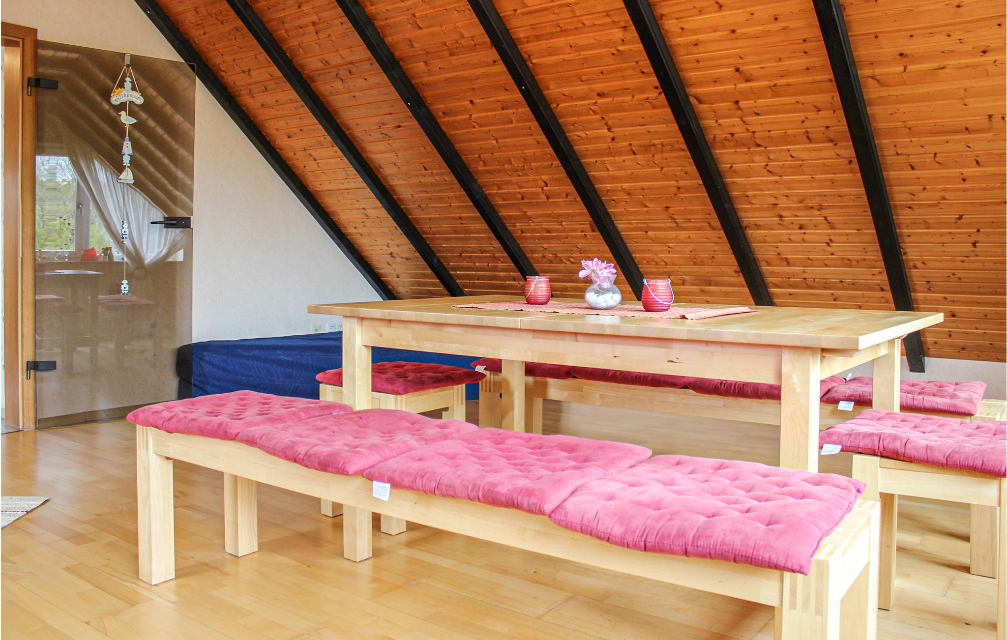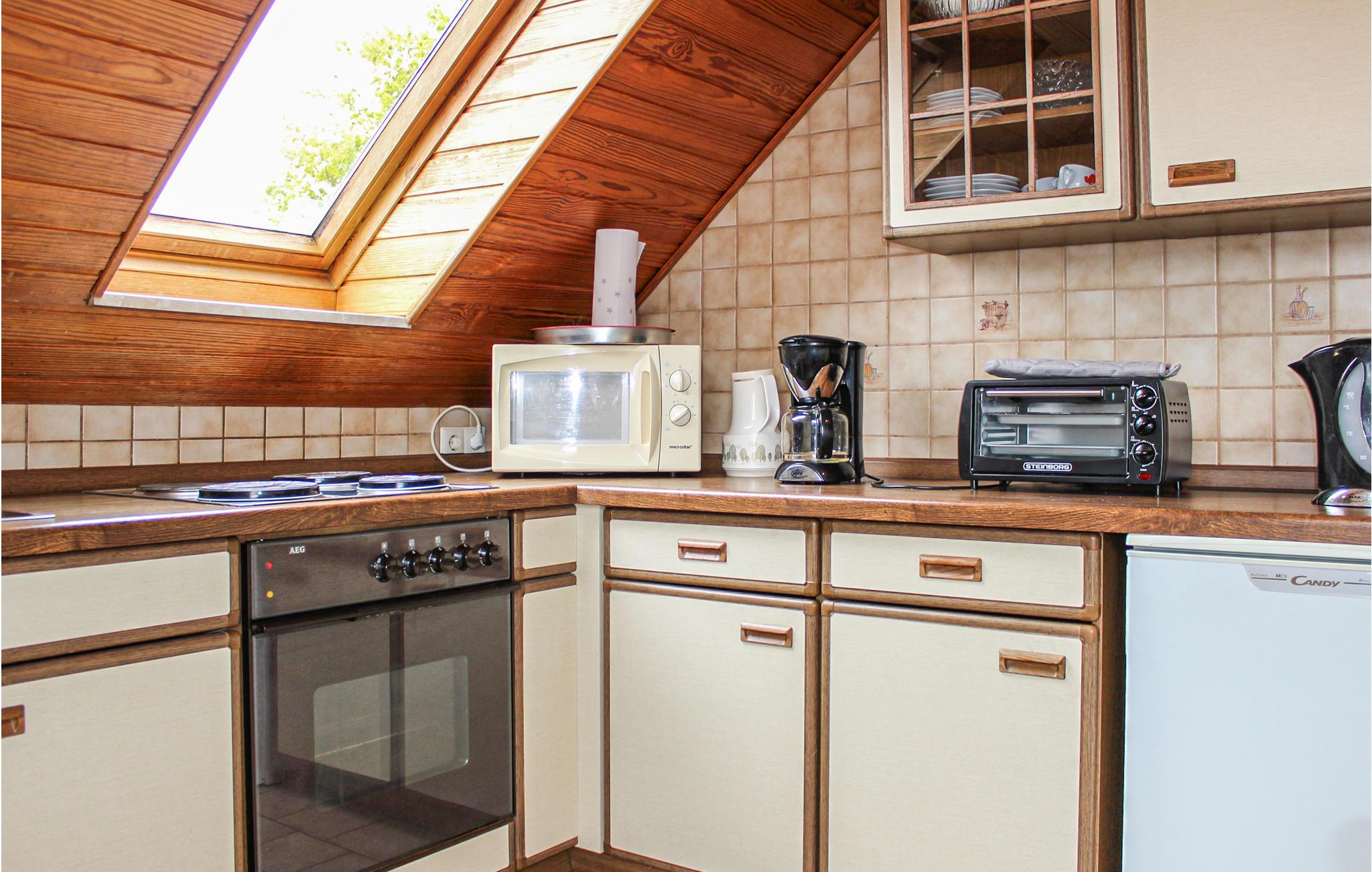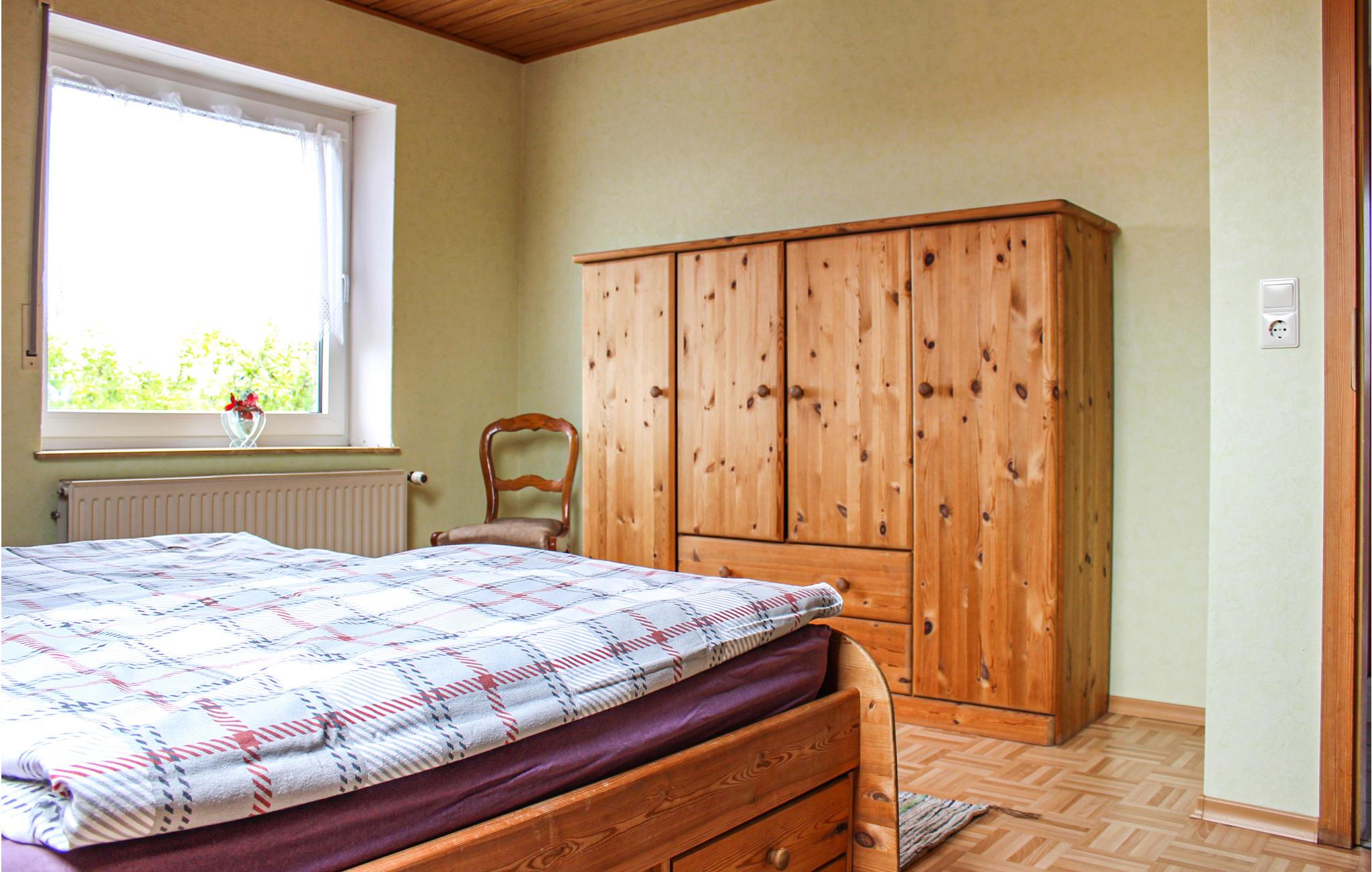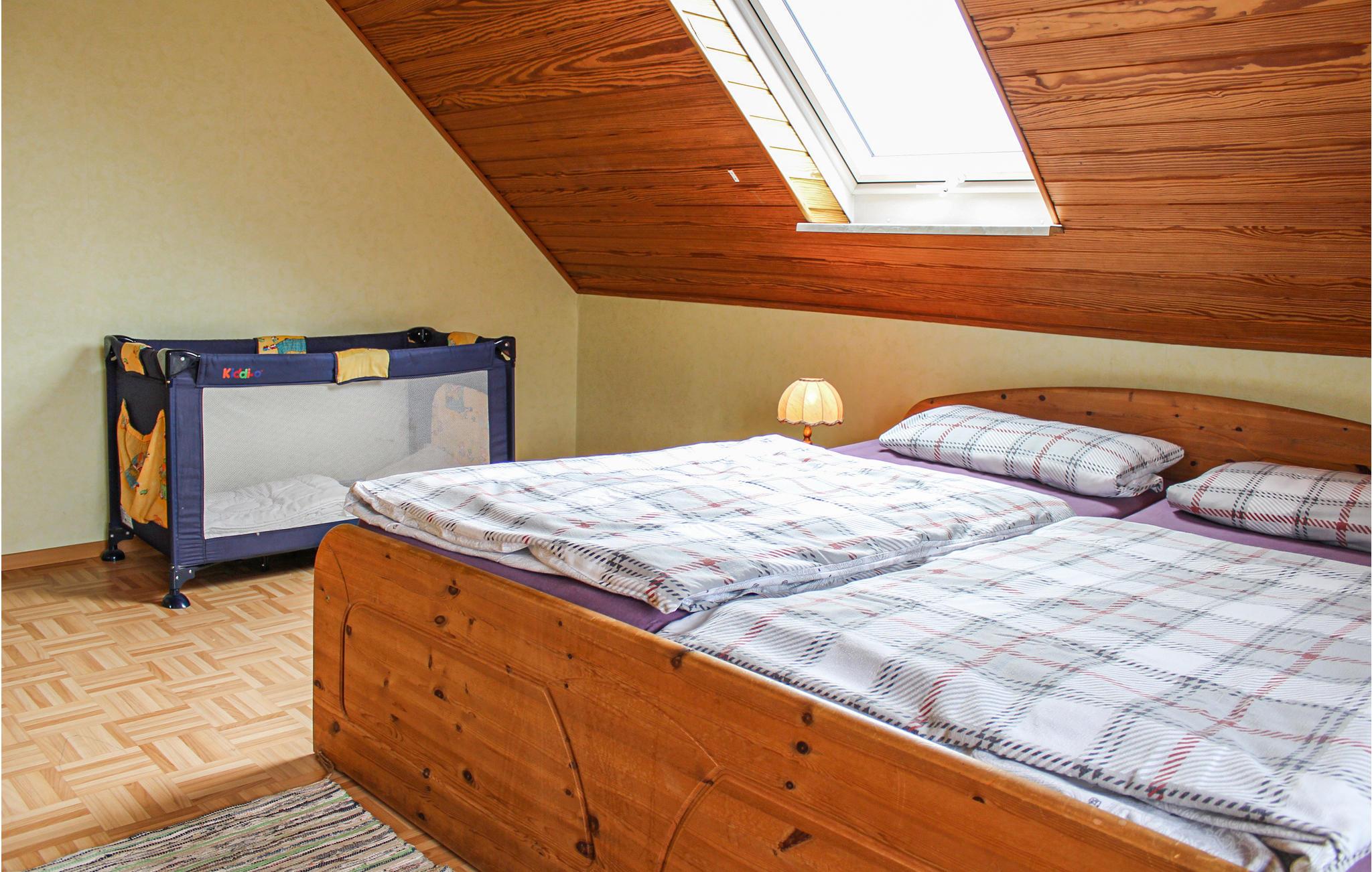 Die Wohnung befindet sich im 1. Obergeschoss des Wohnhauses und verfügt über Dachschrägen. Das Elternschlafzimmer ist mit einem Doppelbett sowie einem Babybett ausgestattet, im zweiten Schlafzimmer befindet sich ein Einzelbett. Im geräumigen Wohnraum sind bis zu vier weitere Schlafplätze vorhanden. Das Badezimmer ist mit Waschmaschine und Badewanne ausgestattet.