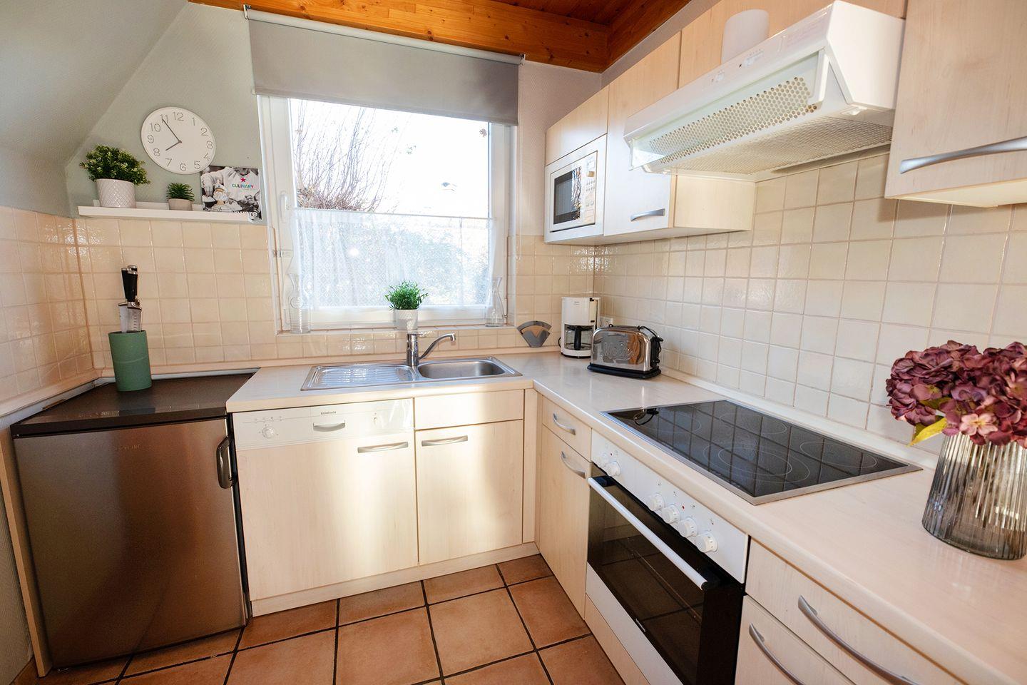 Platz für Familienzeit: Im Ferienhaus „Familie Buechler“ Ostertill 03 in Dorum-Neufeld wohnst du auf 61 m² mit bis zu vier Personen.Zwei Schlafzimmer mit Vinylboden, ein Bad mit Dusche und Wanne sowie ein zusätzliches WC machen den Aufenthalt angenehm. Die offene Küche ist mit Ceranfeld, Spülmaschine, Mikrowelle und vielem mehr komplett ausgestattet. Im Wohnbereich sorgen Kaminofen, sechs TVs, WLAN und Spiele für Komfort und Unterhaltung.