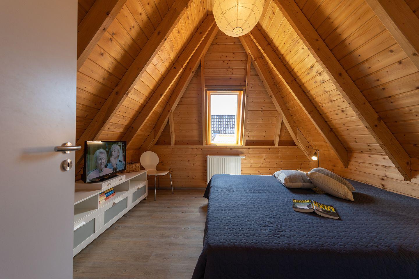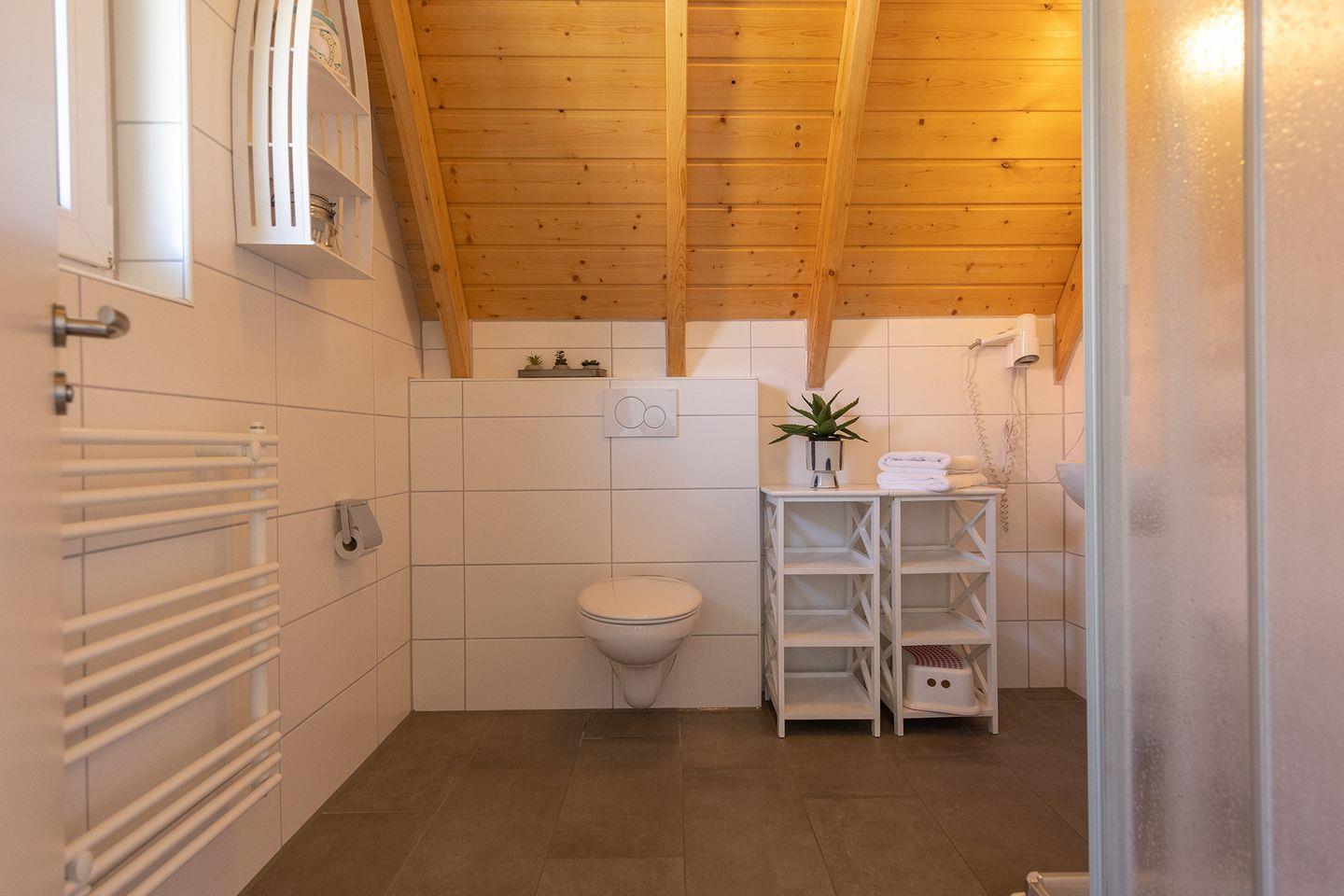 Oben wartet das Elternschlafzimmer mit Doppelbett, TV und Dockingstation, gegenüber spielen die Kinder im zweiten Zimmer. Ein Gäste-WC und ein großer Einbauschrank im Flur bieten zusätzlichen Komfort. Kinderstuhl und Reisebett sind ebenso da wie WLAN und eine E-Ladestation an der Rezeption – ein Detail, das unsere Gäste immer wieder positiv hervorheben.