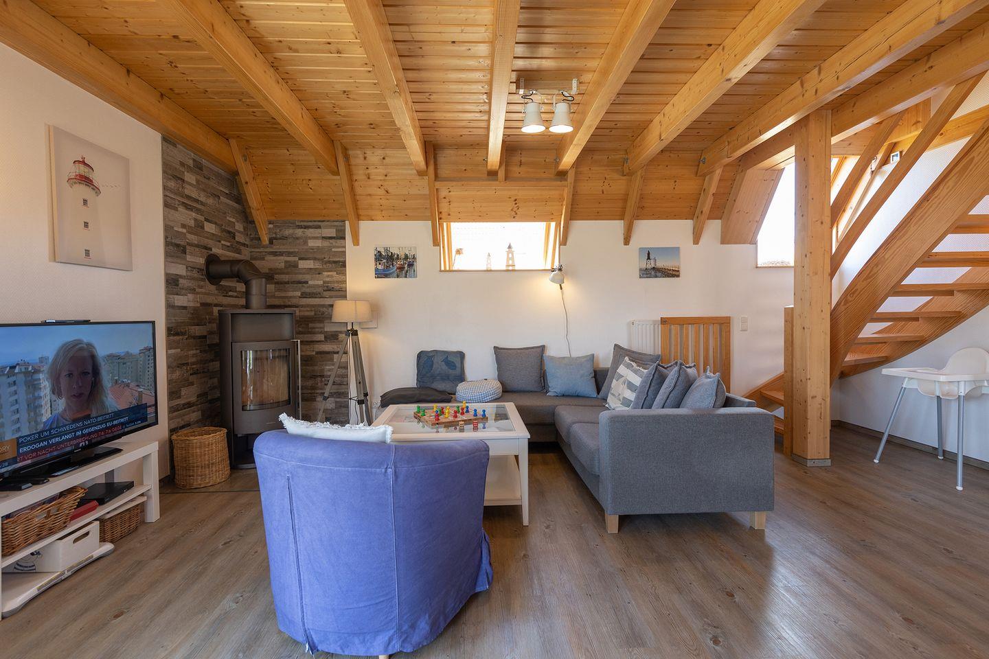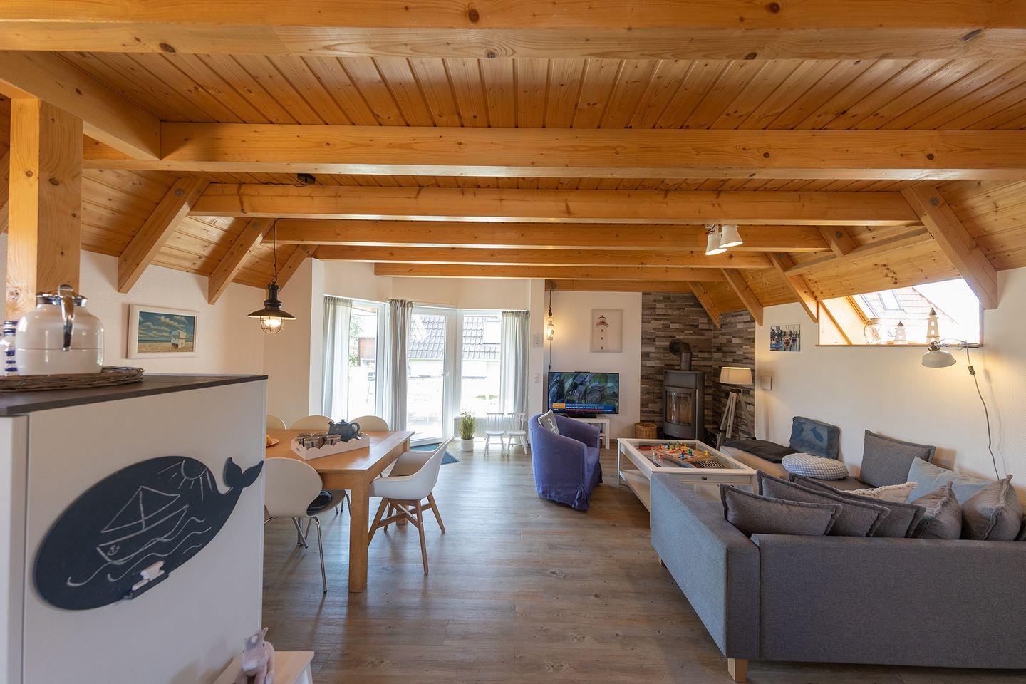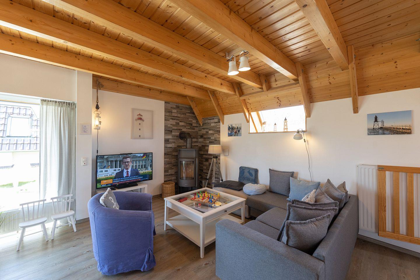 Wenn morgens die Sonne durch die Terrassentür blinzelt, schnappst du dir duftende Brötchen aus dem Ofen der Küche und setzt dich mit einem Kaffee ans Fenster. Das erste Ziel: der Deich, nur ein Katzensprung entfernt. Im Erdgeschoss verbindet der offene Wohn-Essbereich mit Kaminofen und einer komplett ausgestatteten Küche geselliges Kochen mit entspannten Lesestunden. Direkt nebenan liegt ein Schlafzimmer mit zwei Einzelbetten und Zugang zum Duschbad mit Waschmaschine.
