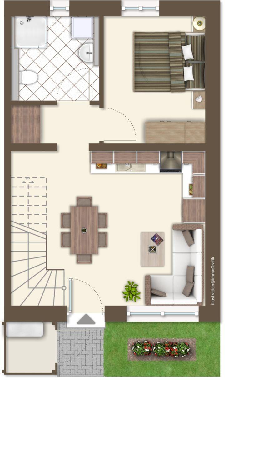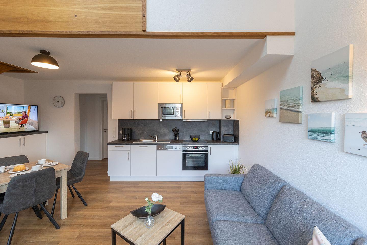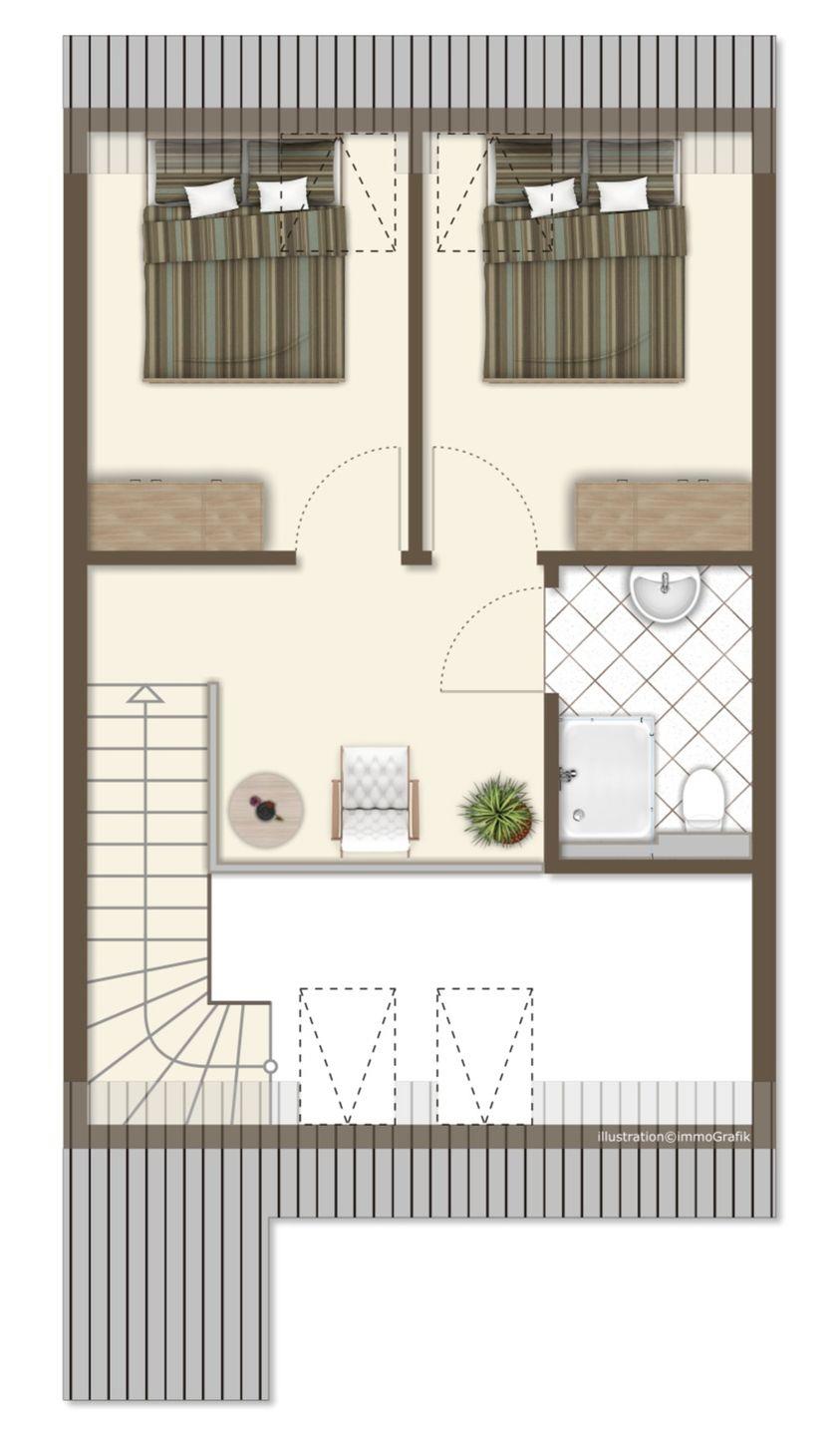 Im Erdgeschoss: ein heller Wohn-Essbereich mit gemütlicher Wohnlandschaft, offener Küche, Esstisch und Gäste-WC, sowie einem Schlafzimmer mit Doppelbett. Im Obergeschoss: zwei Schlafzimmer – mit Doppelbett sowie ein Duschbad. Alle Schlafräume können verdunkelt werden und sind mit Laminat ausgelegt. Fußbodenheizung und automatische Be- und Entlüftung sorgen für ein angenehmes Raumklima.
