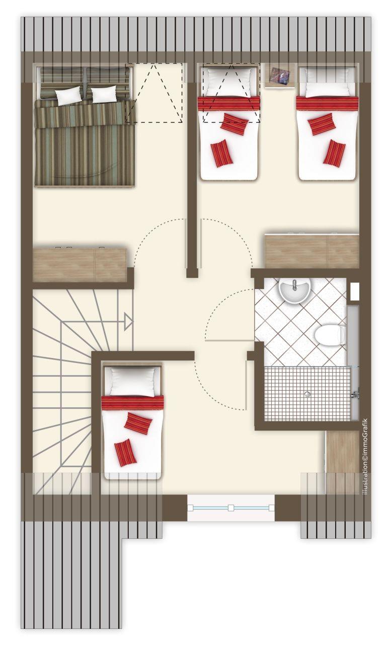 Im Erdgeschoss: ein heller Wohn-Essbereich mit gemütlicher Wohnlandschaft, offener Küche, Esstisch und Gäste-WC. Im Obergeschoss: drei Schlafzimmer – mit zwei Doppelbetten und einem Etagenbett – sowie ein Duschbad. Alle Schlafräume lassen sich verdunkeln und sind mit Laminat ausgelegt. Fußbodenheizung und automatische Be- und Entlüftung sorgen für ein angenehmes Raumklima.