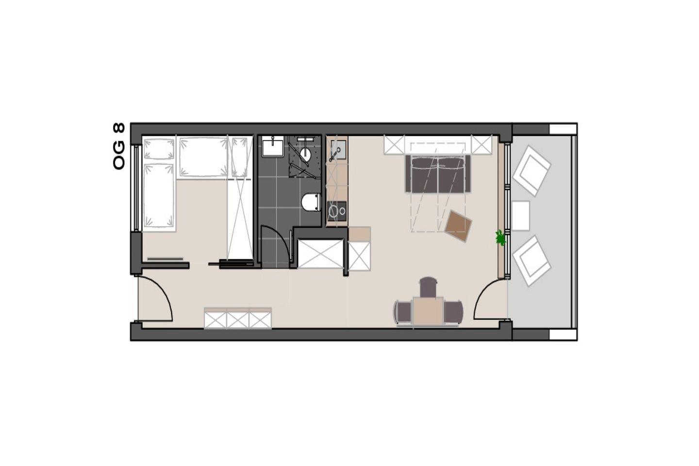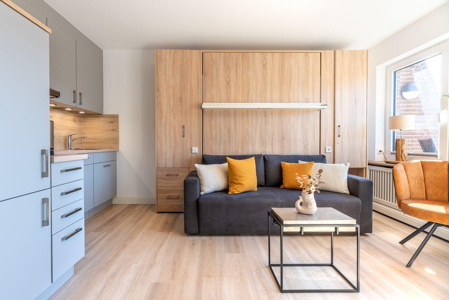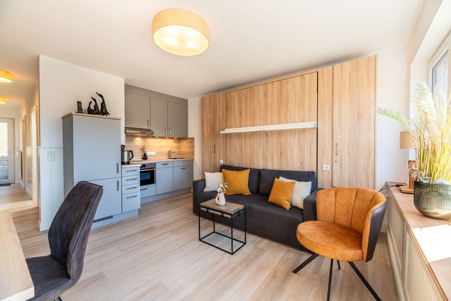 Offener Wohn- und Essbereich mit einer einladenden Sofaecke, einem Esstisch, einem gemütlichen Klappbett, einem Flachbildfernseher und einem Balkonzugang. Die moderne Küche ist ausgestattet mit Herd, Backofen, Geschirrspüler und weiteren Annehmlichkeiten.
