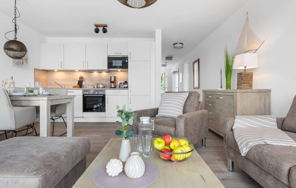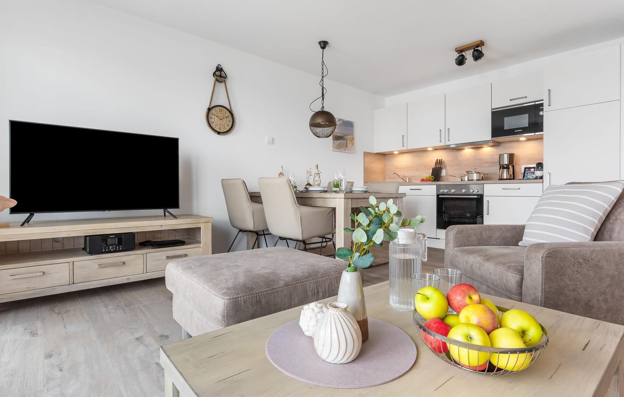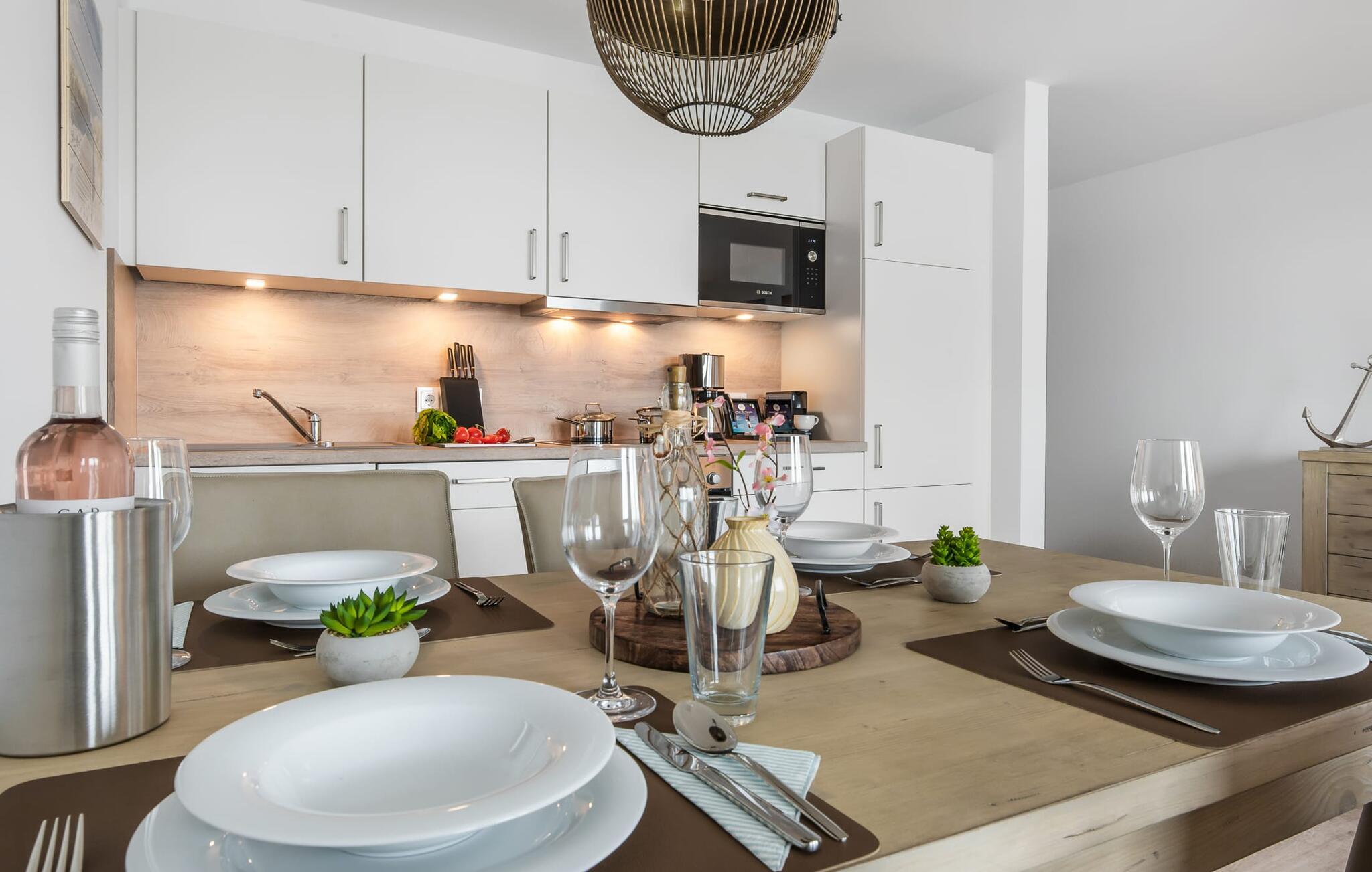 Die moderne Einrichtung der Wohnung überzeugt durch ihre moderne Einrichtung und die gelungene räumliche Verbindung der Küchenzeile zu dem exklusiven Wohnbereich, welche die komfortable Atmosphäre der ruhigen Umgebung hervor hebt. Die Küche mit Vollausstattung lässt keine Wünsche offenhier lassen sich köstliche Gerichte zaubern. Die fertigen Leckereien dann auf dem Balkon genießen oder einen geselligen Grillabend einläuten.