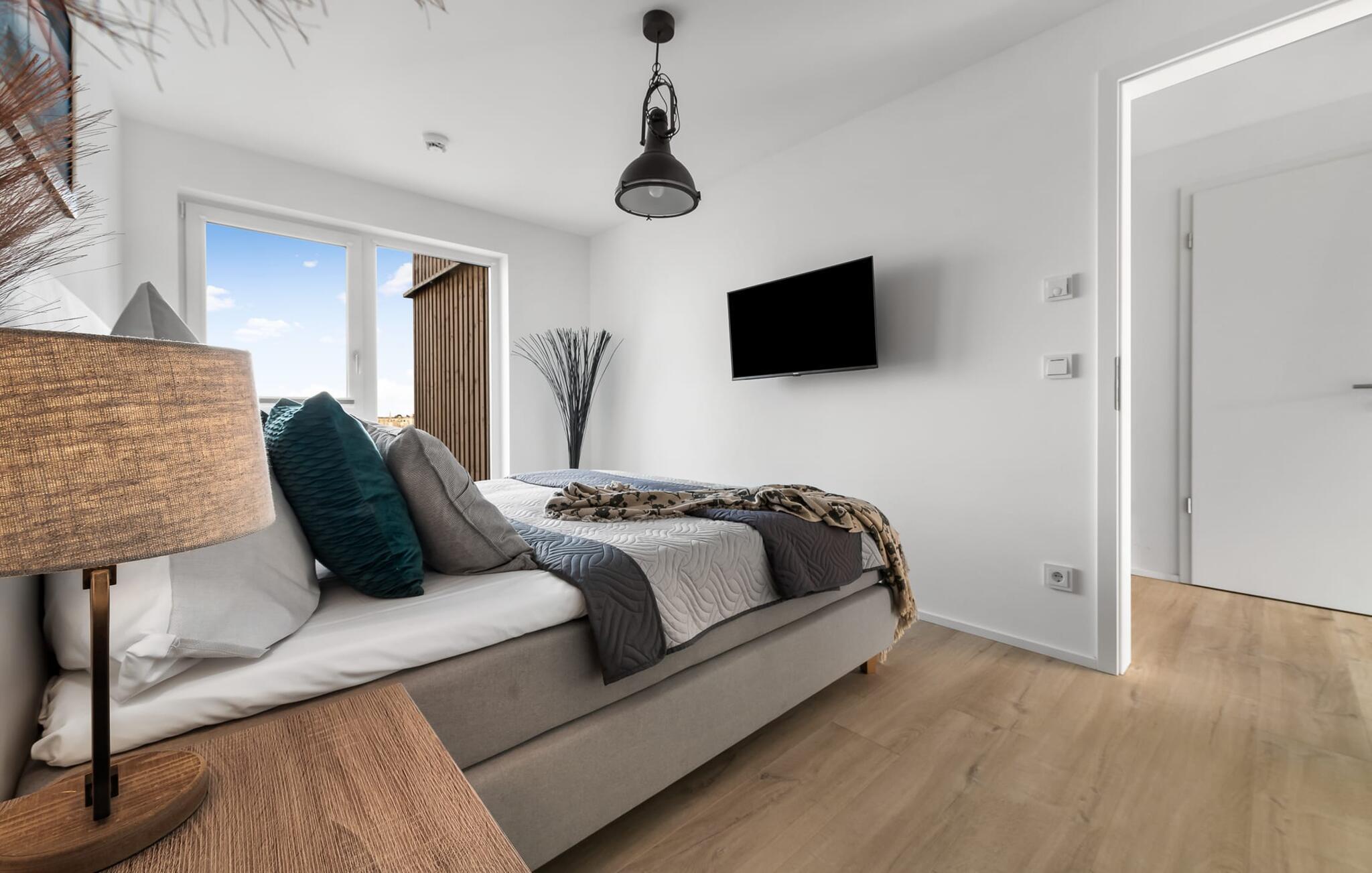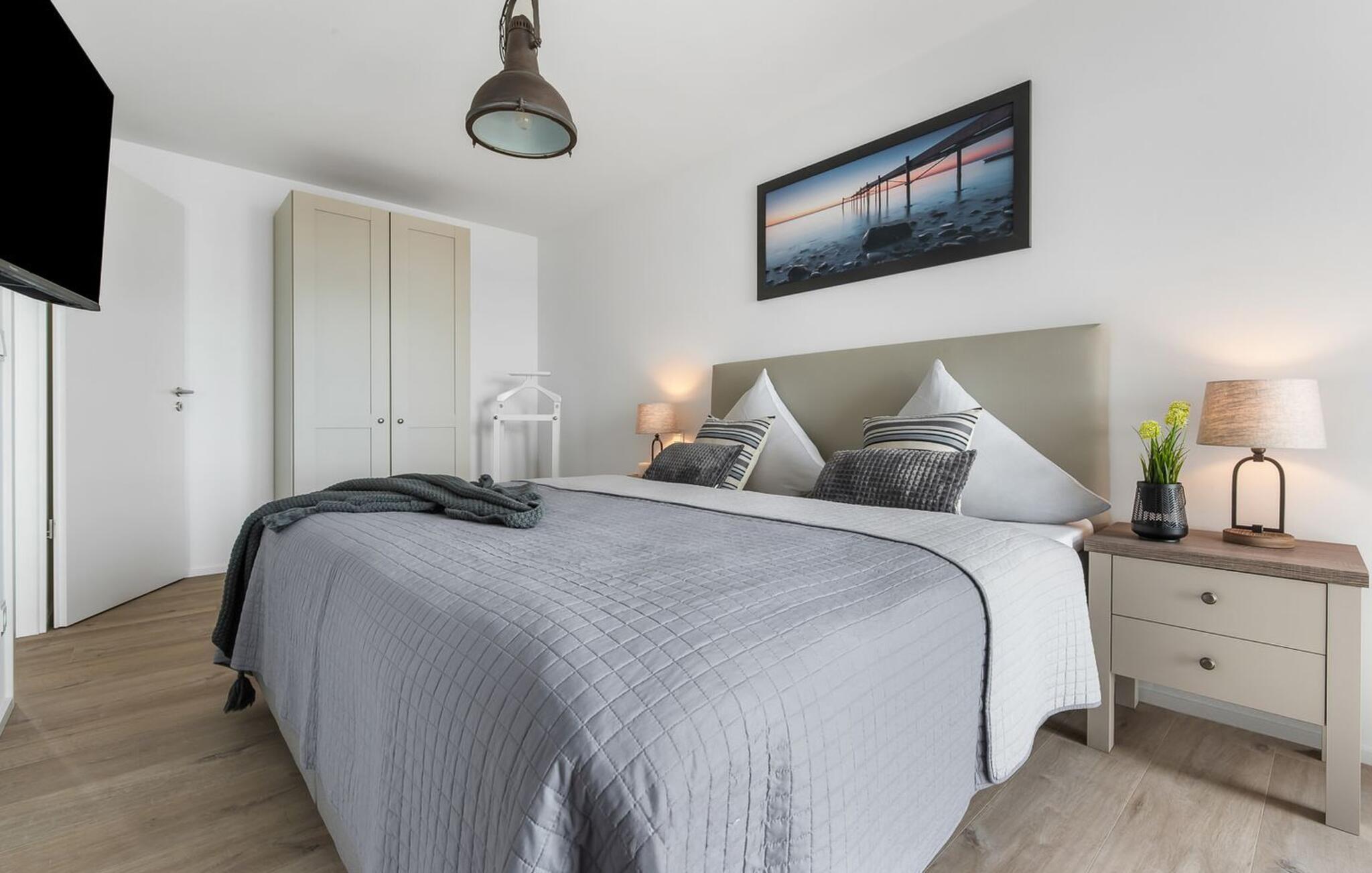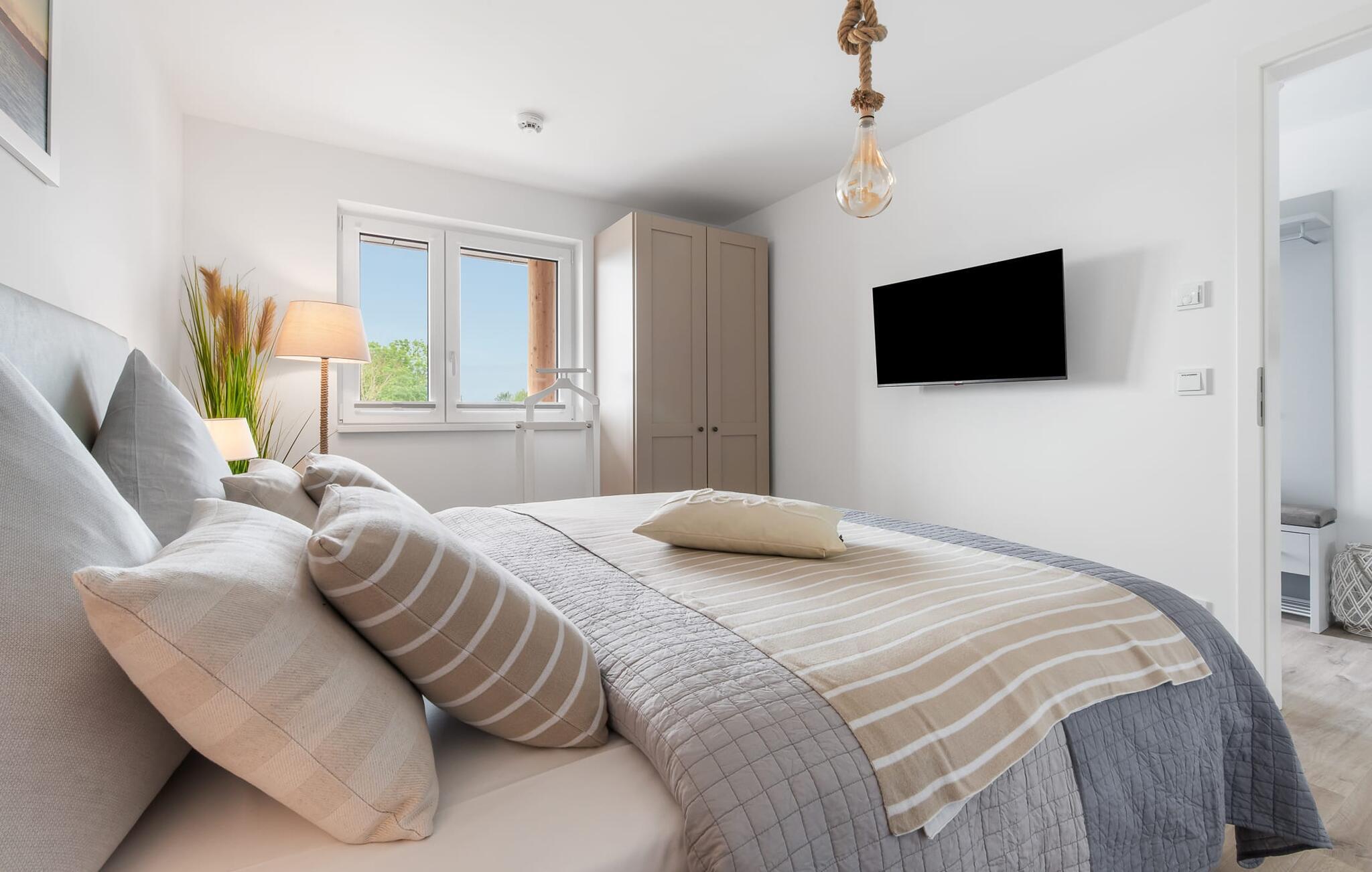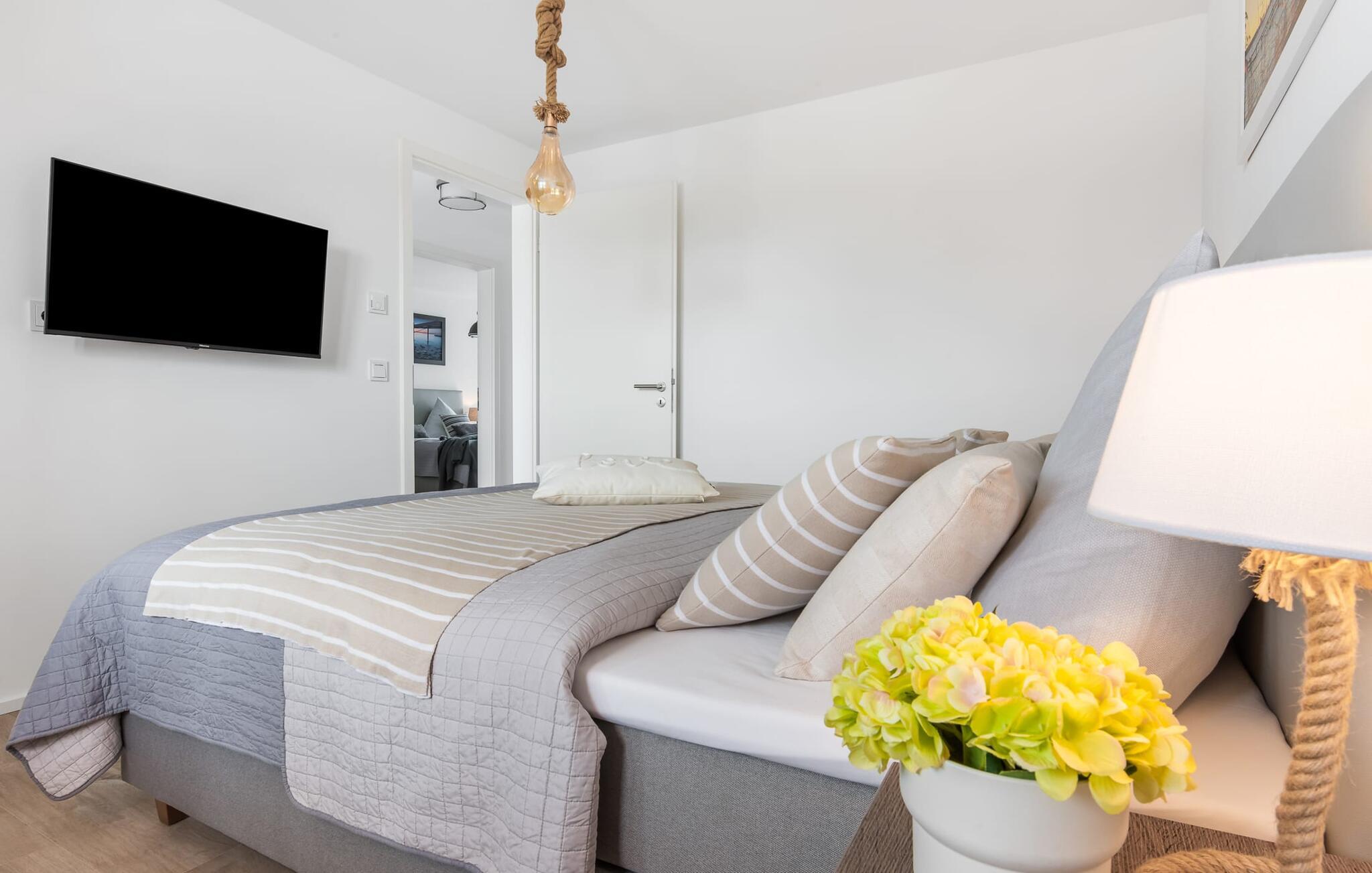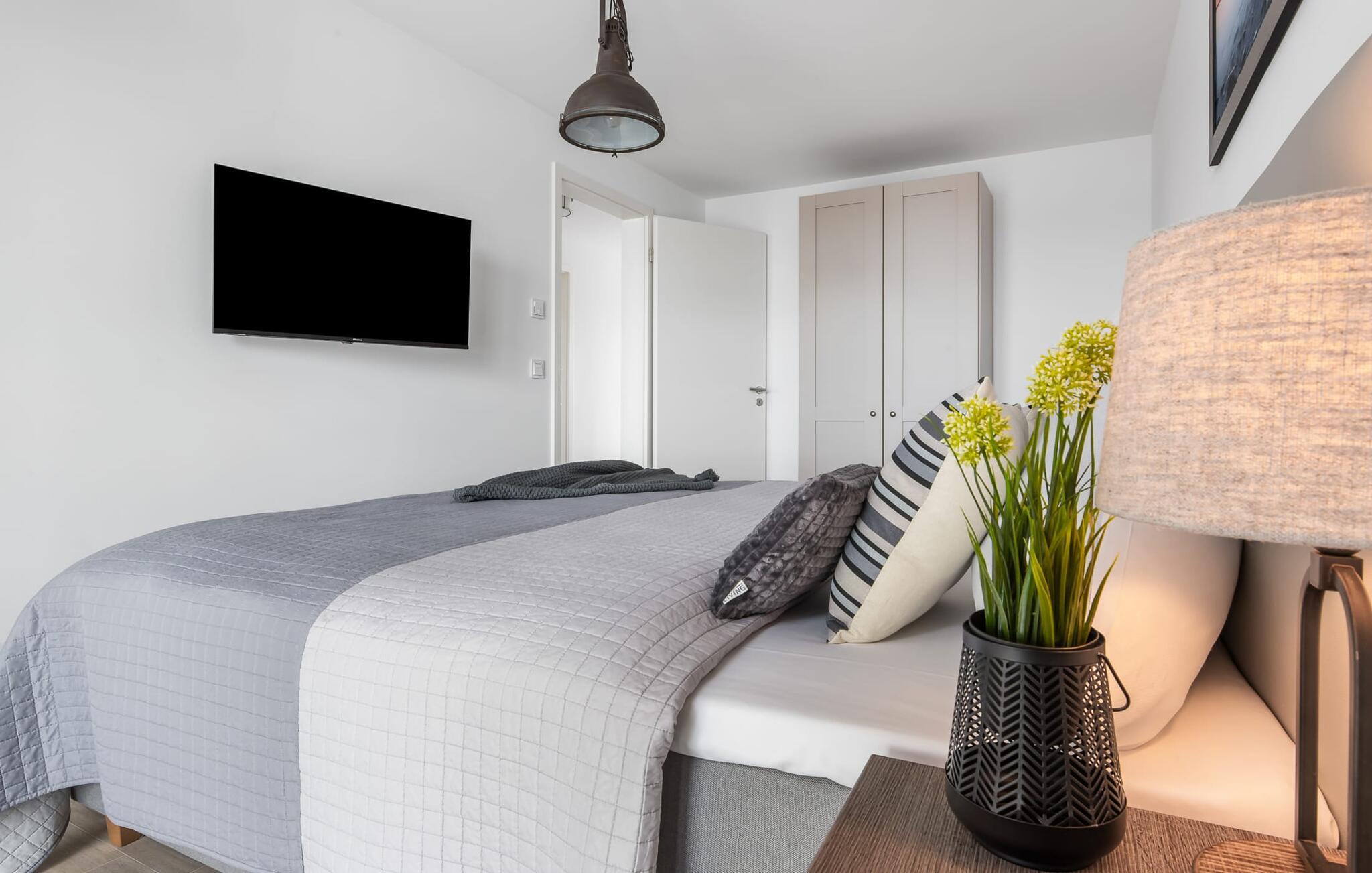 Die Ferienwohnung verfügt über zwei Schlafzimmer. Diese sind jeweils mit einem Doppelbett und einem Fernseher ausgestattet.