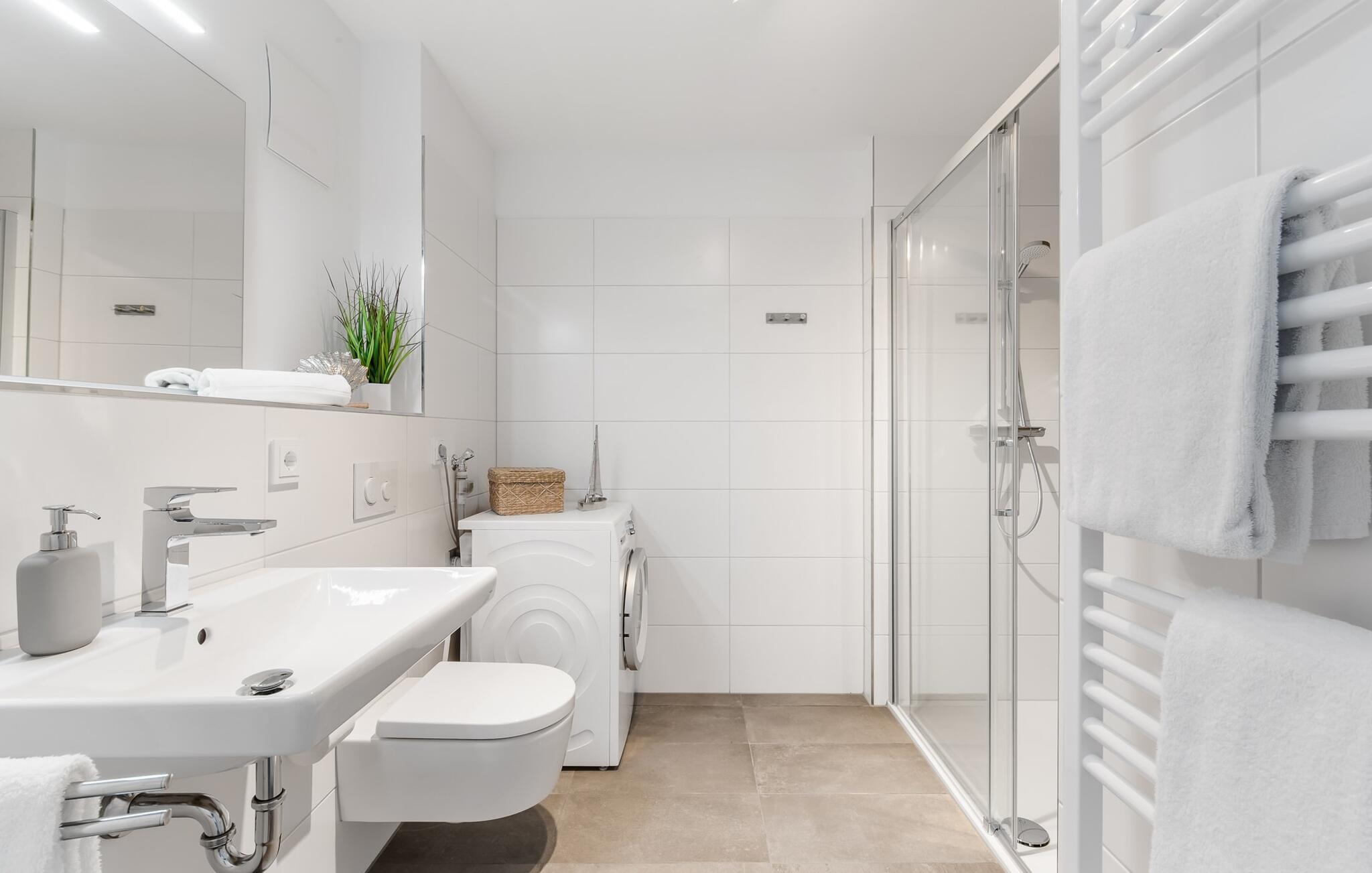 Im Badezimmer befindet sich eine moderne, bodengleiche Dusche, ein Waschtisch mit Unterschrank und ein großer Spiegel.