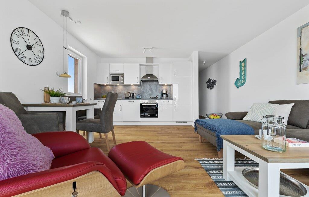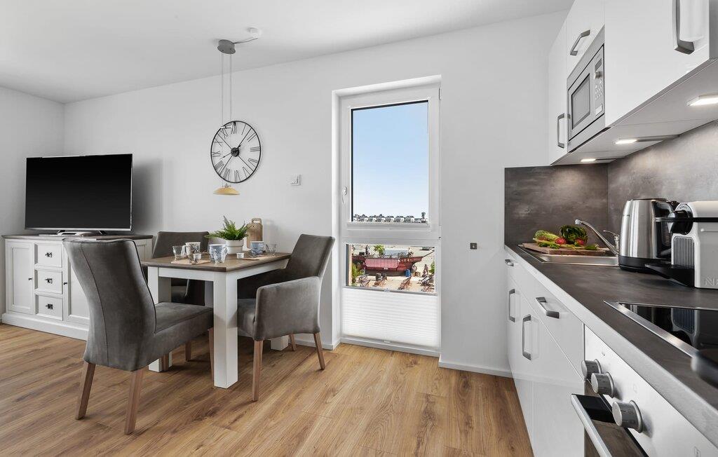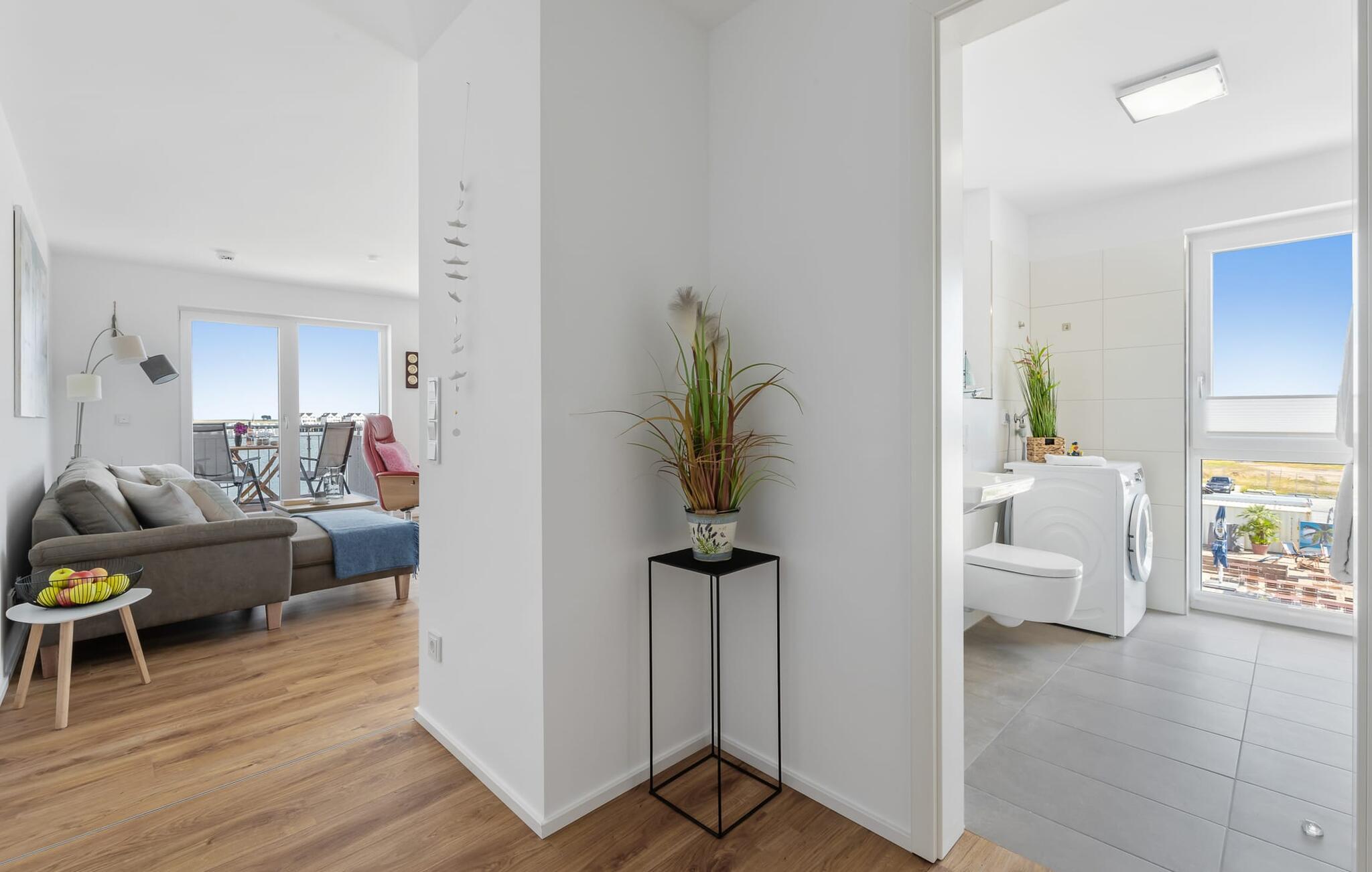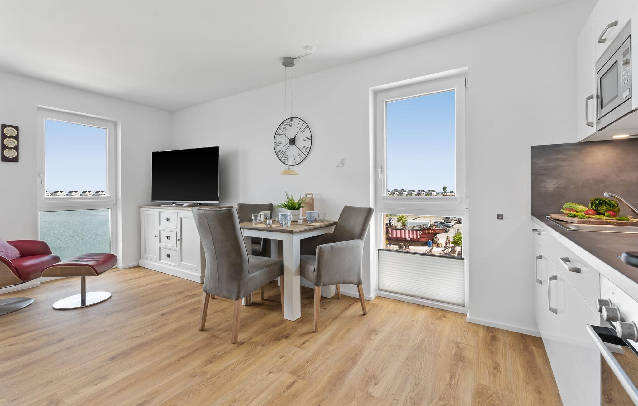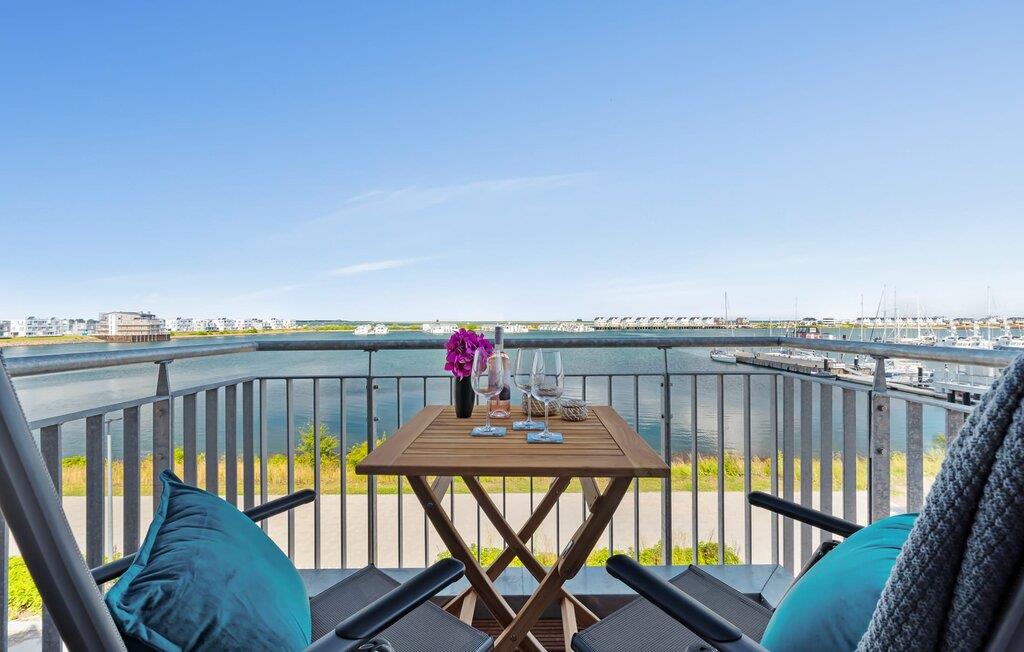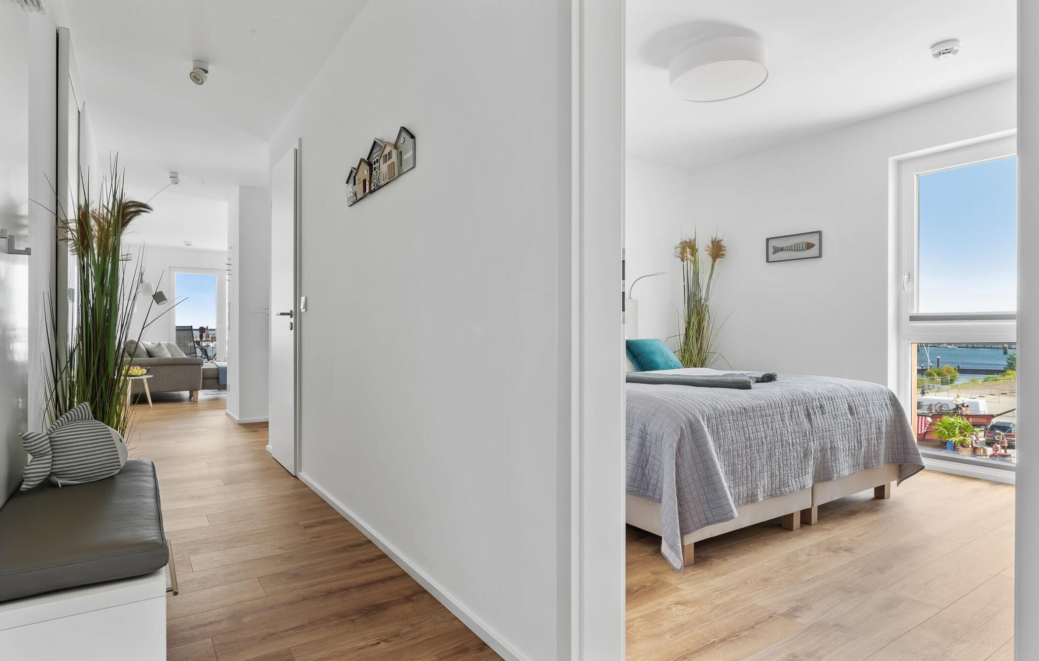 Schließt die Wohnungstür auf, tretet ein und fühlt euch einfach nur wohl! Euer Blick fällt direkt durch die bodentiefen Fenster über den Balkon auf den Hafen und Wasser bis zum Horizont: Der Alltag ist bereits vergessen.