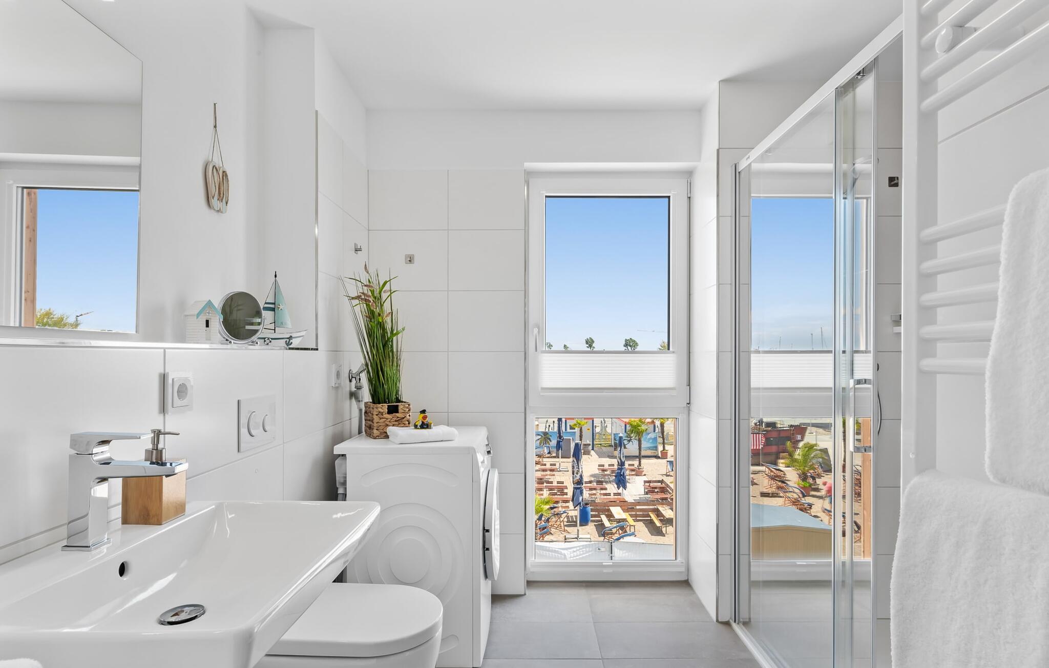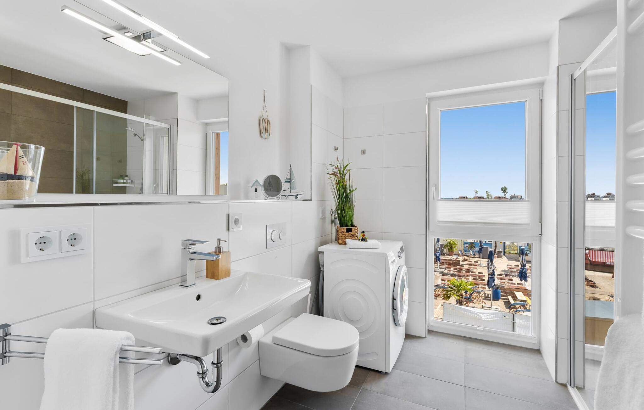 Im Badezimmer mit Tageslicht befindet sich neben allem Nützlichen eine bodengleiche Dusche für den gelungenen Start in einen neuen Urlaubstag.