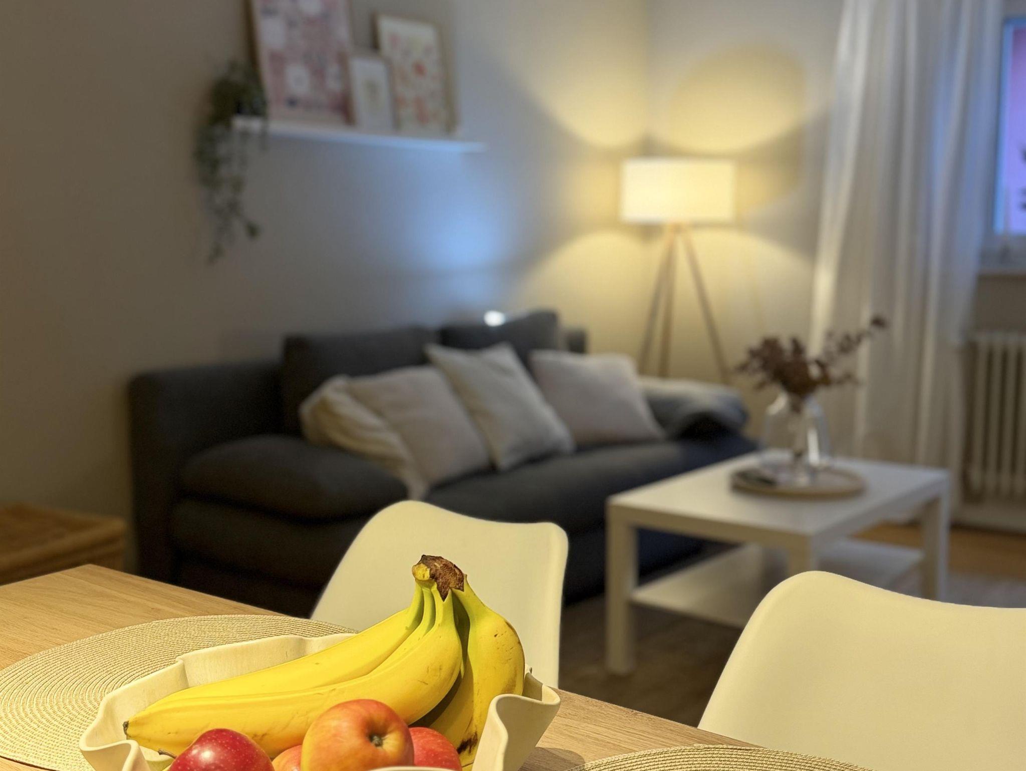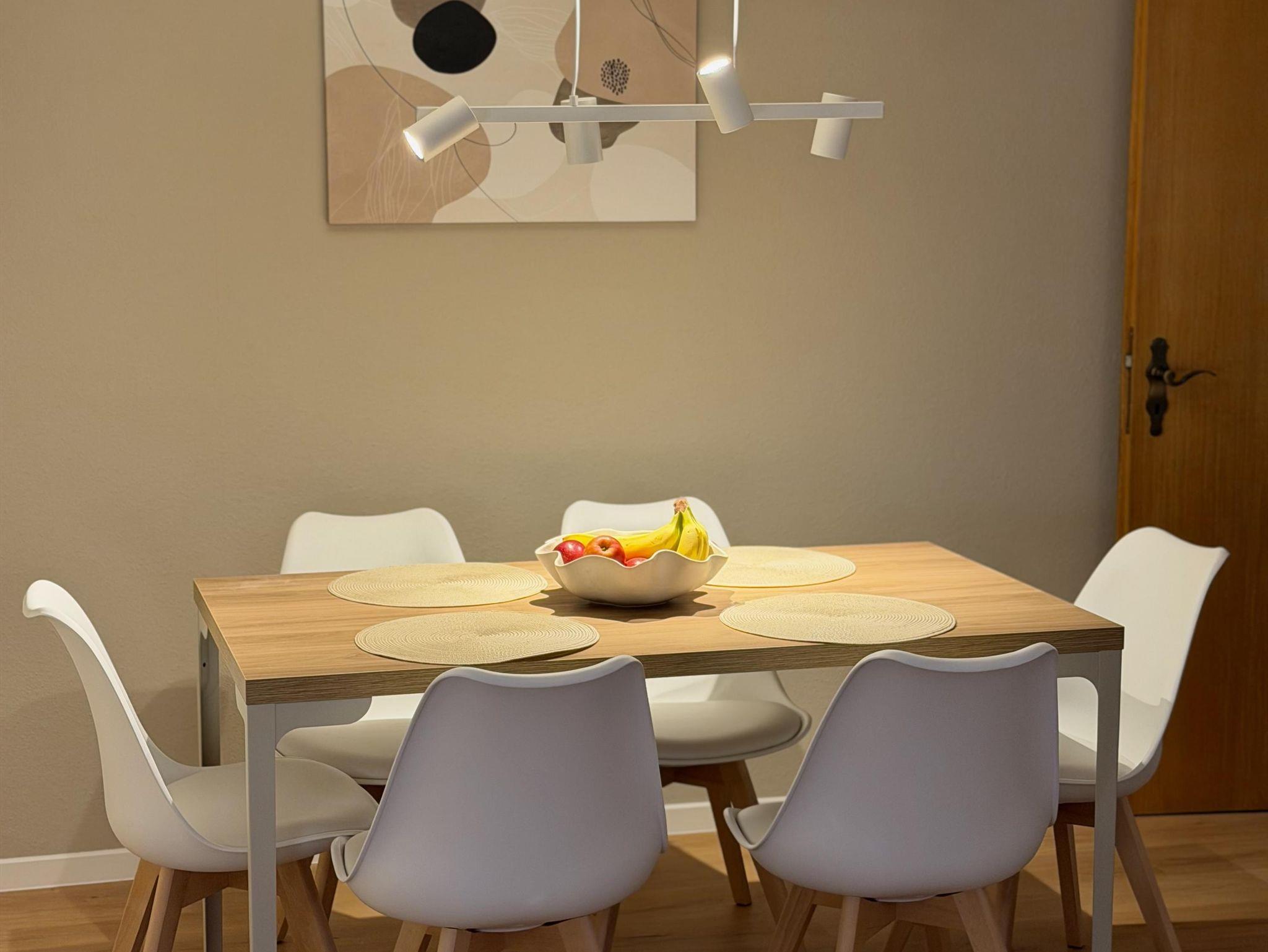 • Wohn- & Essbereich: Das Herzstück der Wohnung. Hier lädt ein großer Esstisch für 6 Personen zu gemeinsamen Mahlzeiten ein. Für Unterhaltung sorgen TV, Bücher und Spiele. Die komfortable Schlafcouch bietet bei Bedarf einen weiteren Schlafplatze (auf Anfrage).