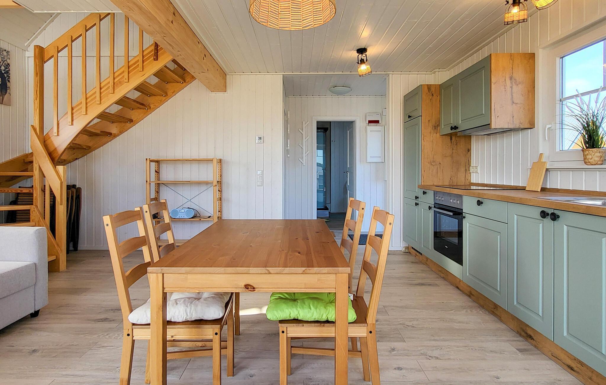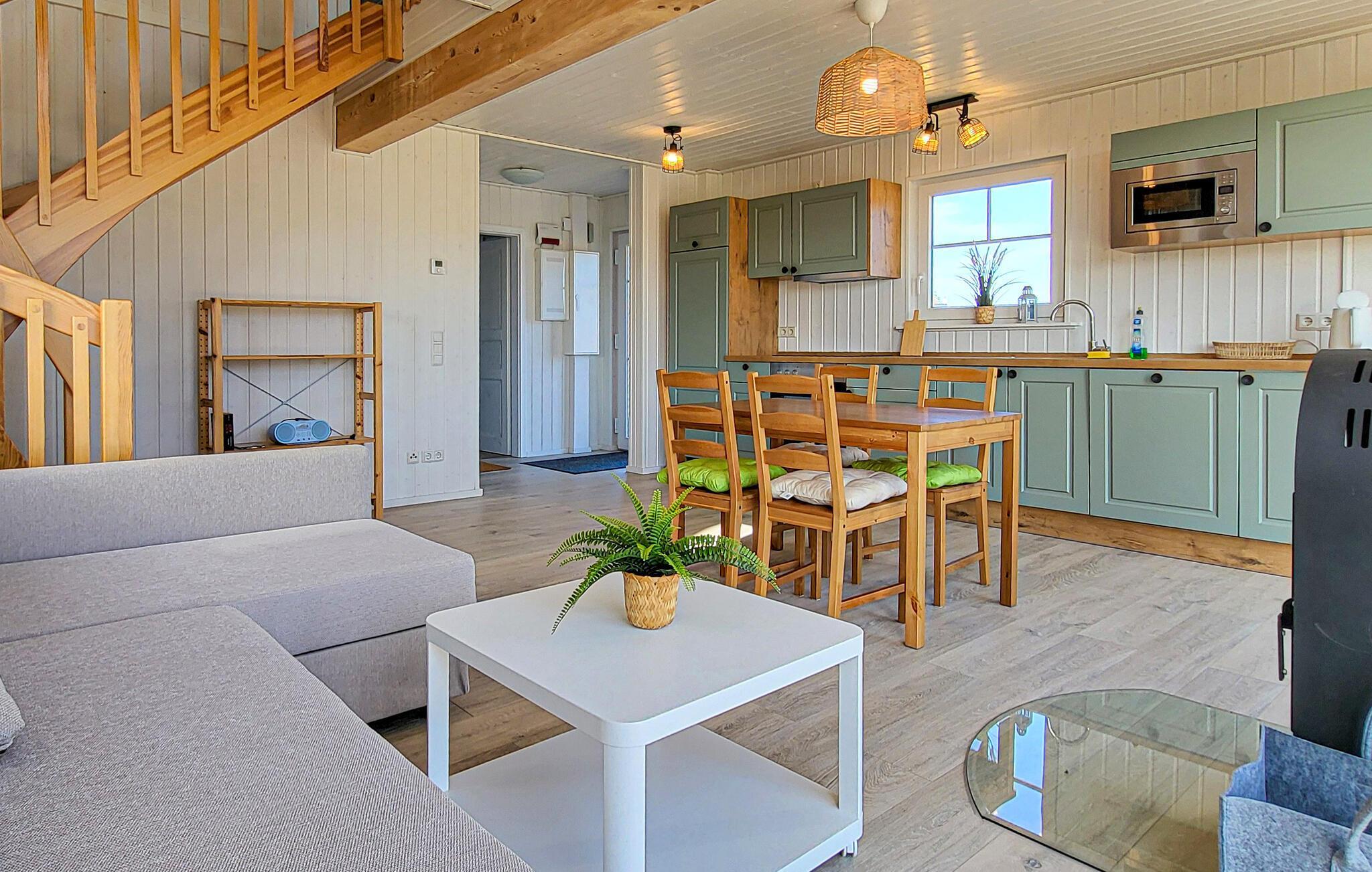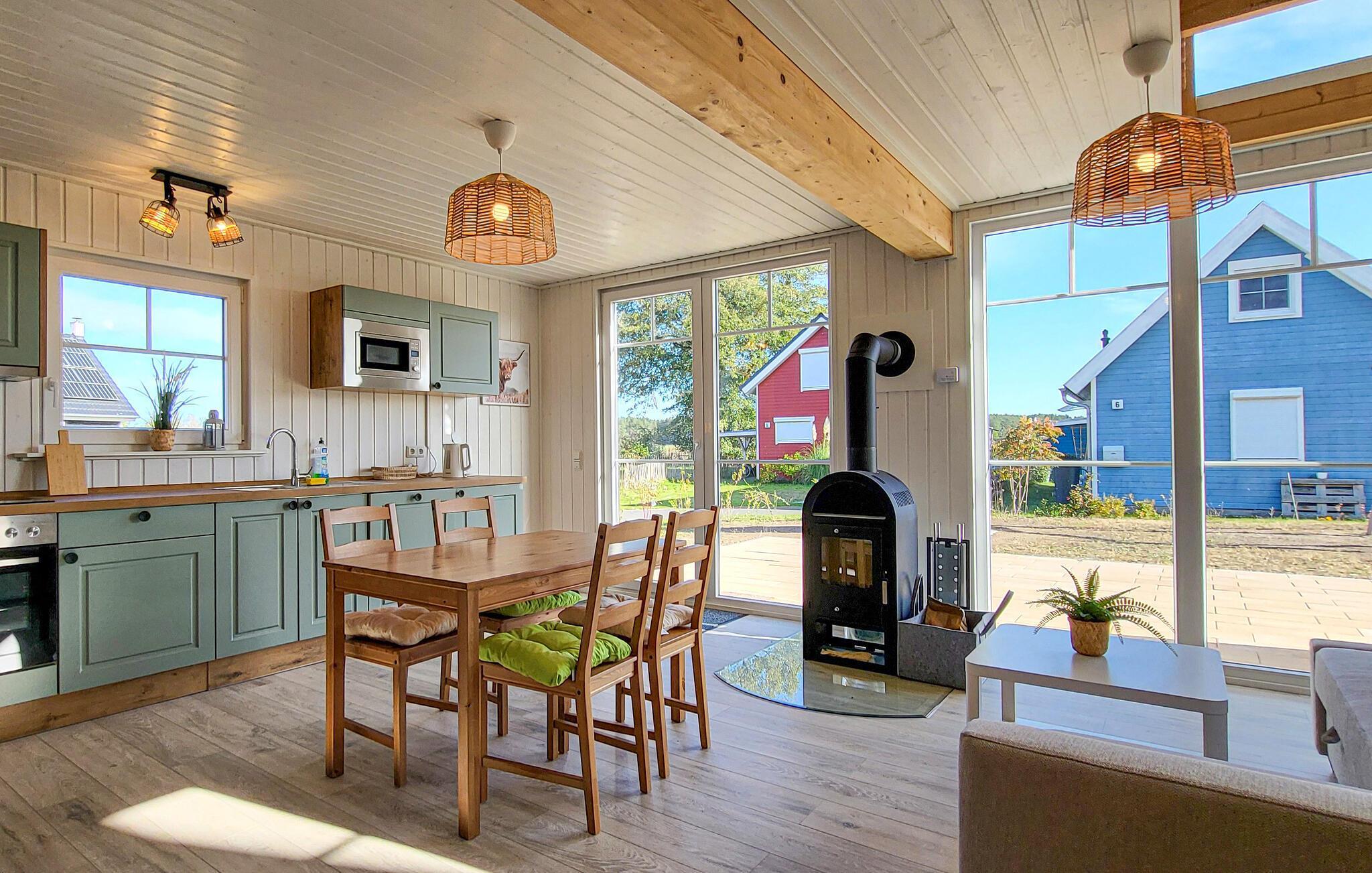 Das Ferienhaus liegt in ruhiger Lage im Feriendorf mit einem schönen Blick über Wiesen und Felder. Dank der galerieartig angelegten ersten Etage und der Panoramafenster, die sich vom Boden bis zum Dach erstrecken, ist das Haus besonders hell und freundlich. Zu jeder Jahreszeit können Sie es sich nach langen Tagen in der Natur im gemütlichen Wohnraum im Erdgeschoss gemütlich machen. Wenn die Temperaturen sinken, gibt es nicht behaglicheres als vor dem knisternden Kaminfeuer ein Buch zu lesen oder mit der Familie zu kochen oder Brettspiele zu spielen.