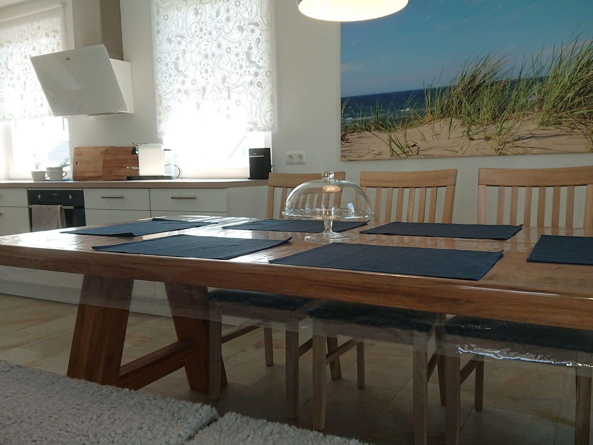 Hygge - das Glücksgefühl, das sich einstellt, wenn man mit Familie und Freunden gemeinsam Zeit verbringt, lacht, isst oder einfach mal in Ruhe die Natur genießt! Getreu nach diesem Motto freuen wir uns, Sie in unserem 2018 neu erbauten Reetdachferienhaus begrüßen zu dürfen. Eingebettet von einem typisch norddeutschen Steinwall mit im Sommer wunderbar duftenden Wildrosen und umgeben von einem schönen Garten, liegt das Ferienhaus nur wenige Minuten zu Fuß vom Meer entfernt. Bereits beim Durchschreiten des weißen Gartentörchens werden Sie in Urlaubsstimmung versetzt. Das gesamte Haus ist im nordisch, leichten Scandi - Style eingerichtet. Im großzügigen, ebenerdigen Wohn- u. Essbereich mit kompl. eingerichteter Küche, lässt es sich wunderbar entspannt u. ausgiebig frühstücken, stundenlang spielen oder genüsslich chillen - Internet-TV (mit Netflix) und Musikanlage vorhanden! Sauna mit Wellnessdusche, separates WC mit Fenster u. Hauswirtschaftsraum mit Waschmaschine, Wäscheständer, Bügeleisen u. -brett befinden sich ebenfalls im Erdgeschoss.