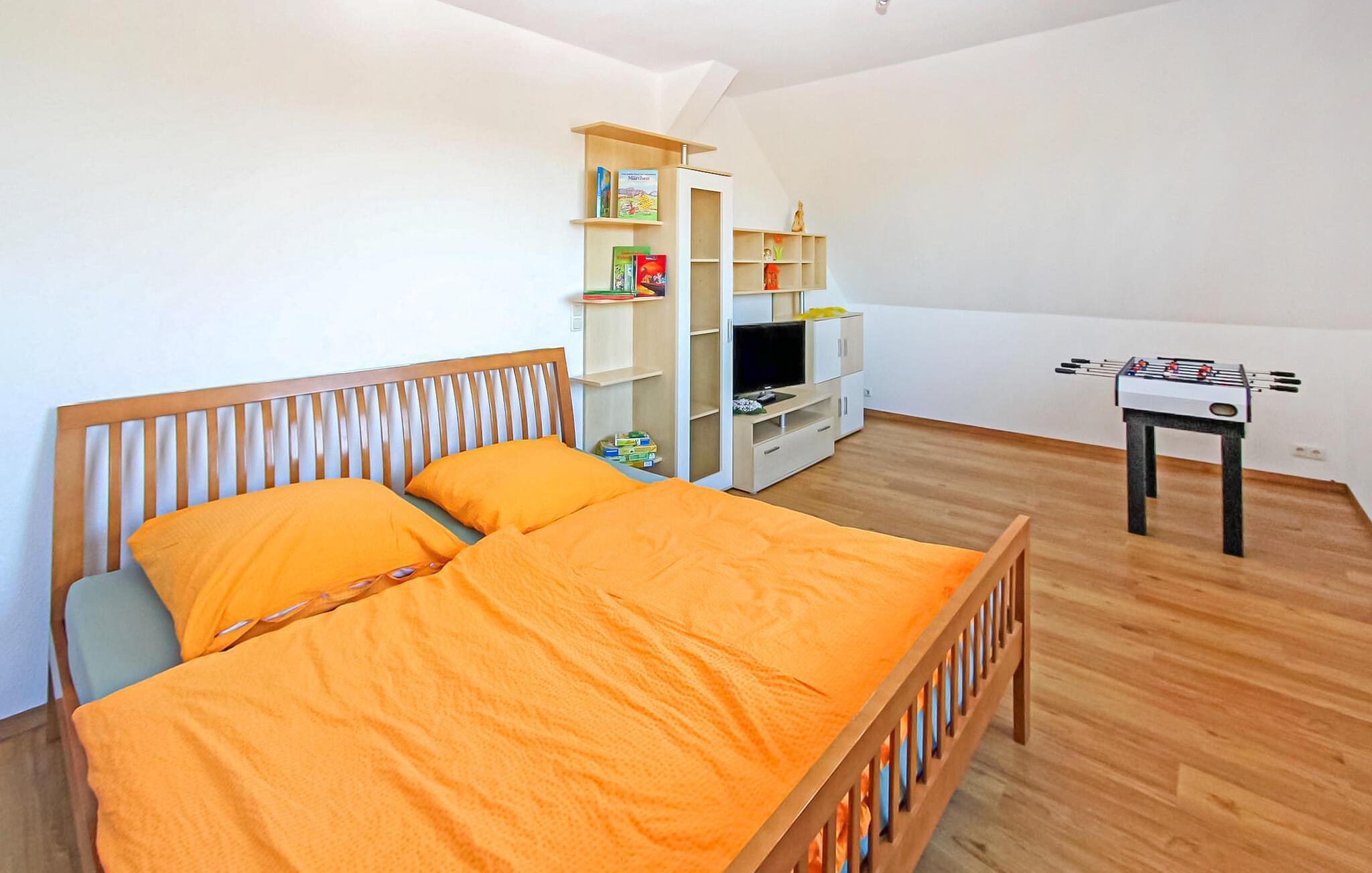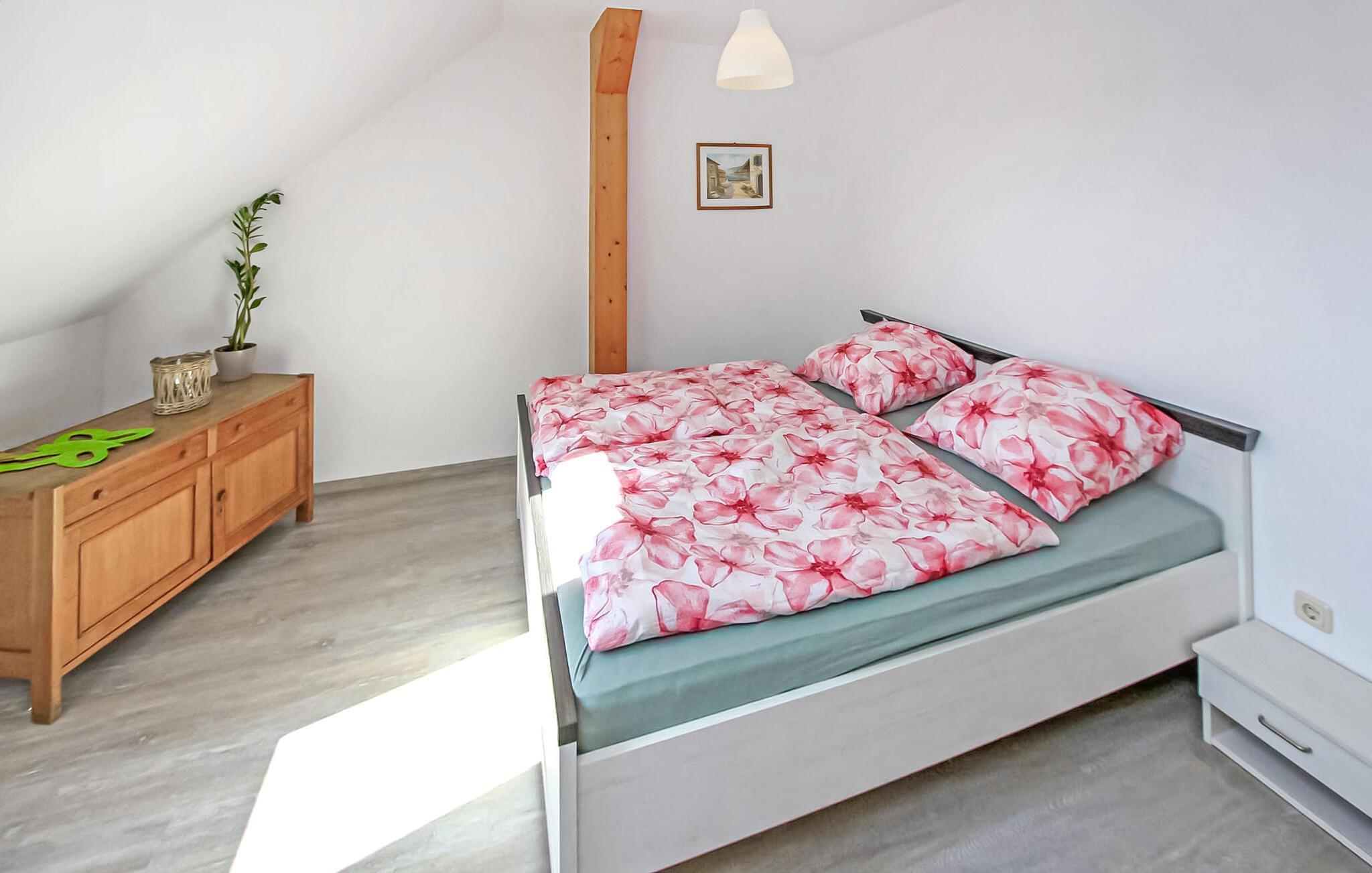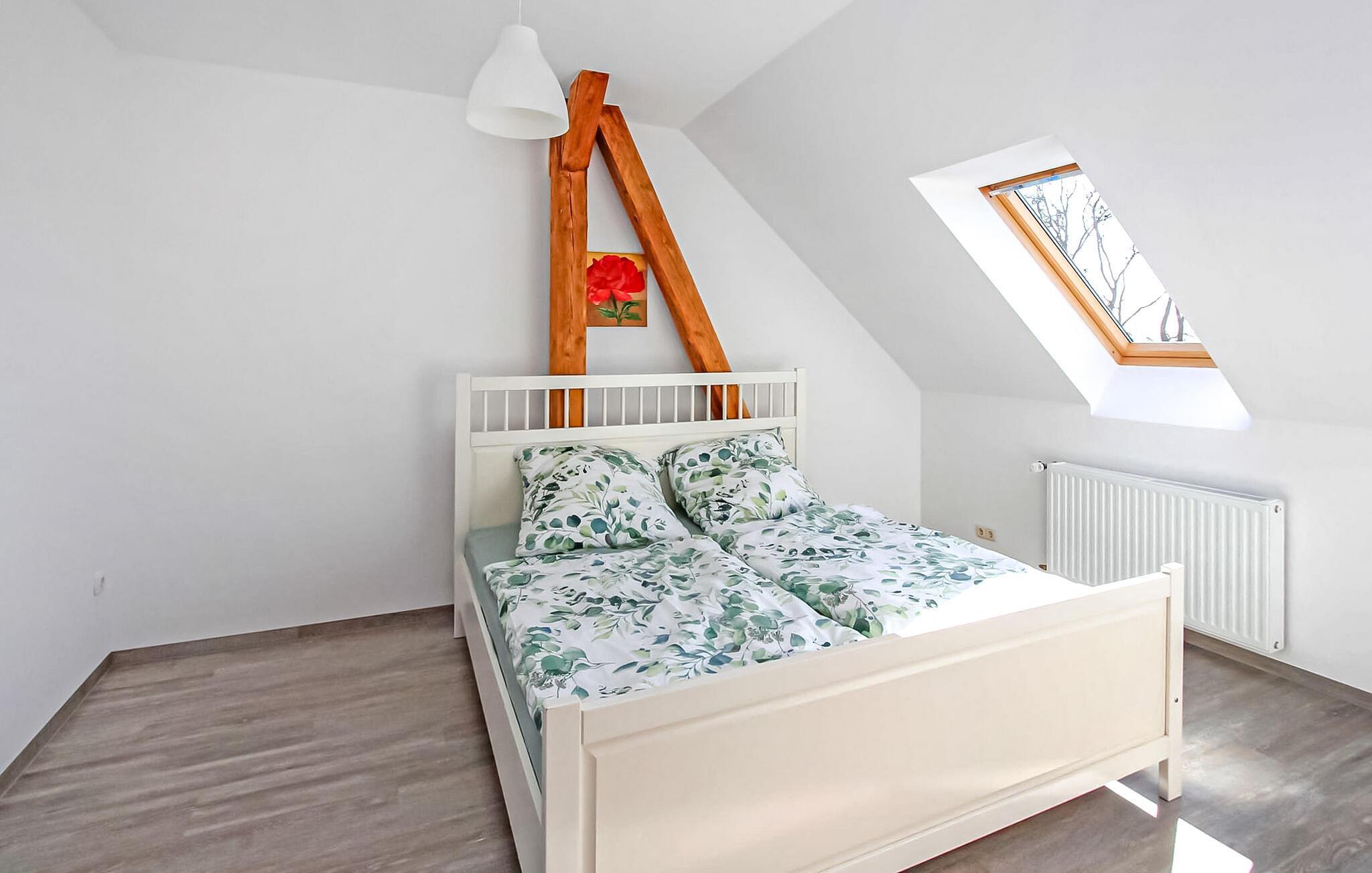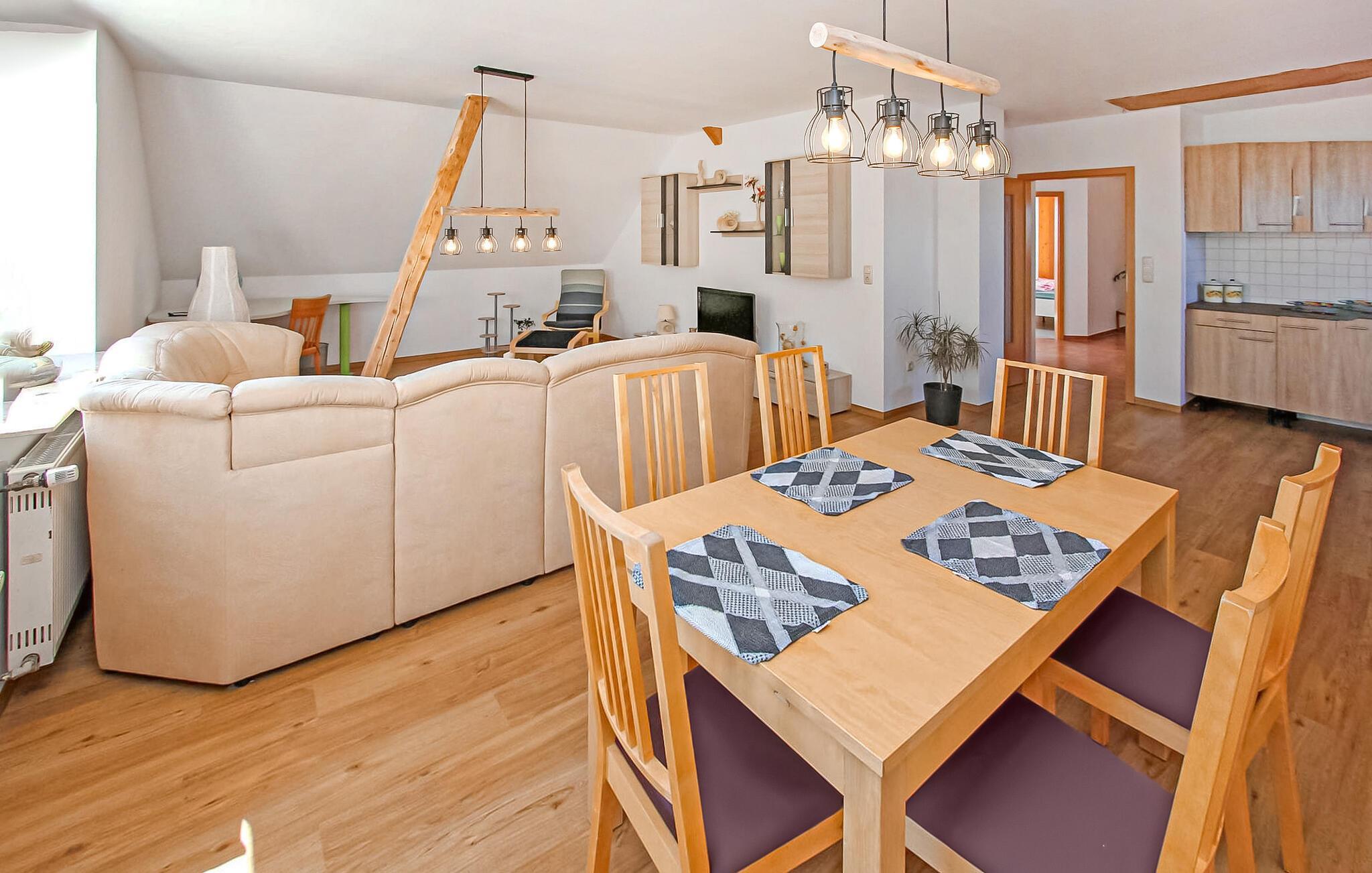 Umgeben von Feldern und Wiesen befindet sich auf einem ca. 3000 qm großen, komplett umzäunten Grundstück mit eigener Zufahrt die 135 qm große, ruhig gelegene Ferienwohnung für bis zu 8 Personen im Obergeschoss eines Wohnhauses. Der im Erdgeschoss wohnende Eigentümer ist für gewöhnlich nur an Wochenenden vor Ort. Die großräumige Wohnung wurde im Jahre 2021 komplett saniert und neu ausgestattet. Erstbezug Frühjahr 2021. Vorhanden sind ein großer Wohnbereich (Couchgarnitur, Sessel, Schreibtisch, Esstisch, Flachbild-TV, Radio, CD-Player, DVD) mit offener Küche (E-Herd, Backofen, Geschirrspüler, Kühlschrank, Mikrowelle, div. Küchengeräte), ein kombinierter Wohn-/Schlafraum (Doppelbett, Flachbild-TV, Sitzecke), 2 weitere Schlafräume (je Doppelbett) sowie ein Bad (Dusche, zwei Waschtische, WC). Im Eingangsbereich befindet sich zudem ein Gäste-WC. Für Kleinkinder stehen ein Kinderbett und ein Hochstuhl bereit. W-LAN ist ebenfalls vorhanden. Weiterhin stehen zur Verfügung: eine überdachte Sitzecke im Freien mit Kühlschrank und Grill, Sonnenliegen, ein kleiner Kinderspielplatz sowie Parkplatz auf dem Grundstück.