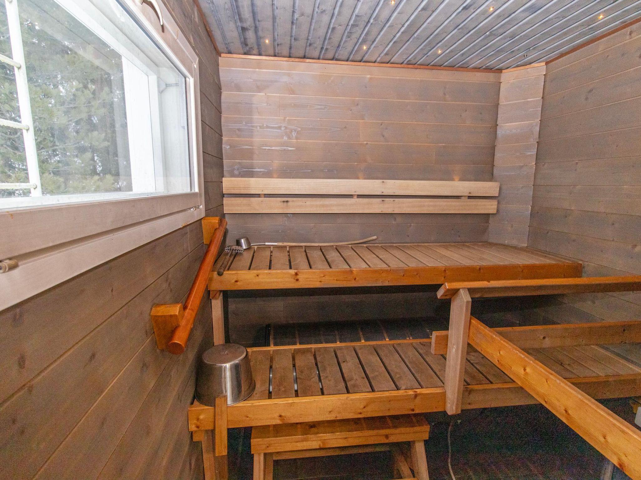 The lakeside sauna was completed in 2019. The sauna measures 28 m² + loft and features a wood-heated sauna, a spacious bathroom with a shower and WC, a cozy living area with a 140 cm wide pull-out sofa bed, a kitchenette, and a heat-storing fireplace. The stairs lead to the loft, where there are two mattresses.
