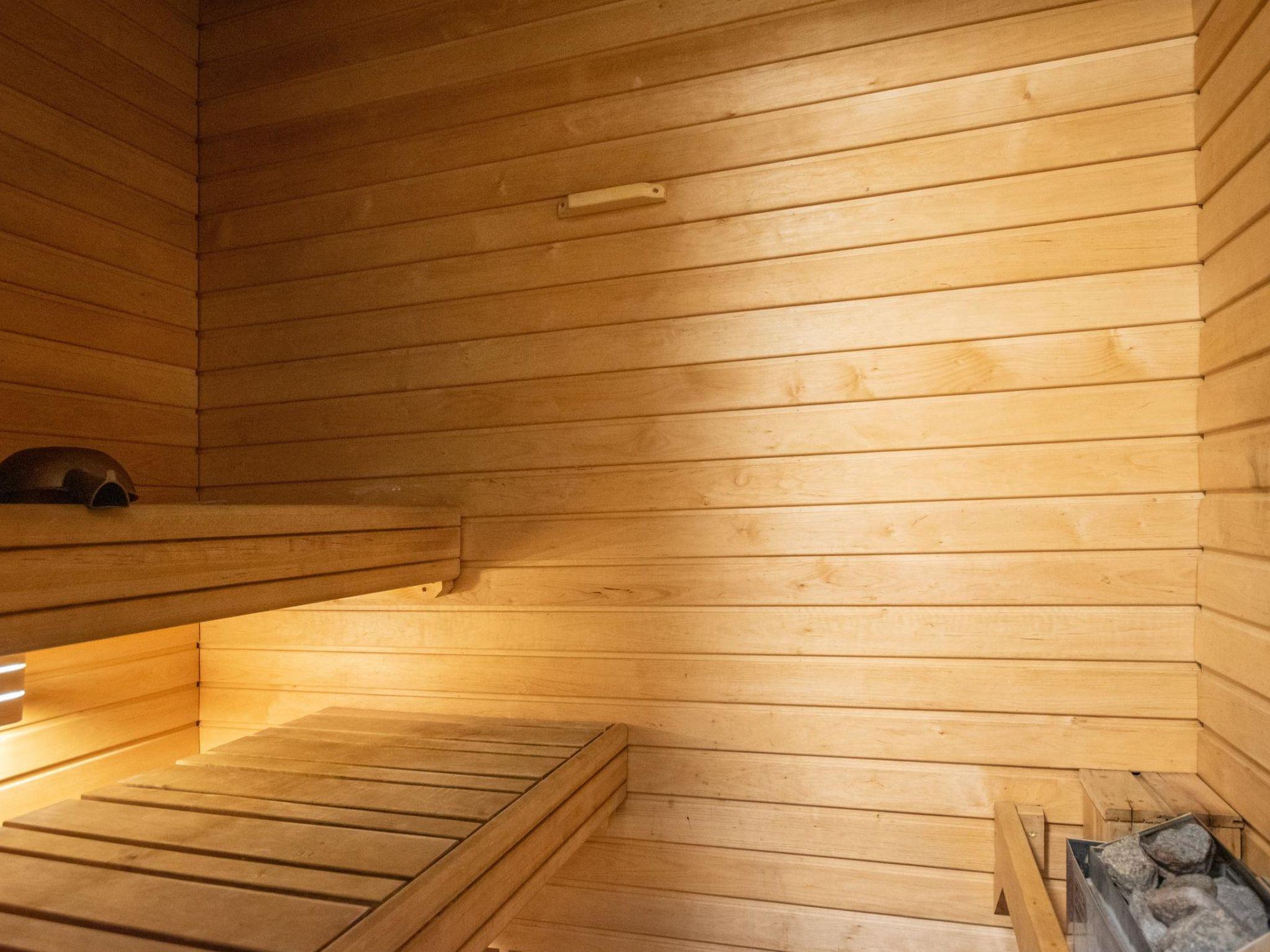 The washroom includes a WC and a shower. The apartment also has a private sauna with an electric sauna stove.
