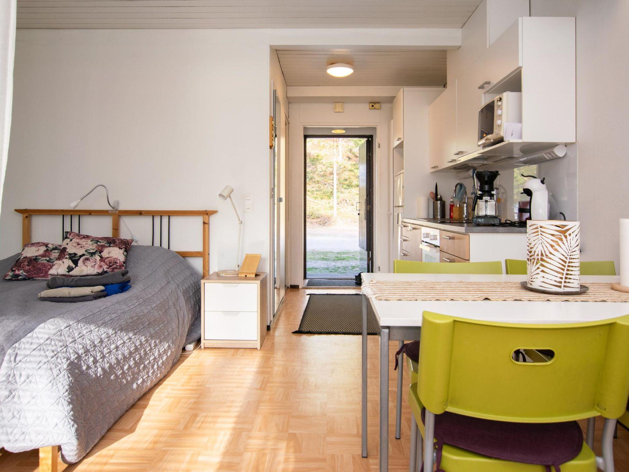 Log-panelled row house apartment built in 1975. Living room/kitchen, entrance hall, living room with a 140×200 cm double bed and a sofa bed that opens into a 140×200 cm extra bed for two.