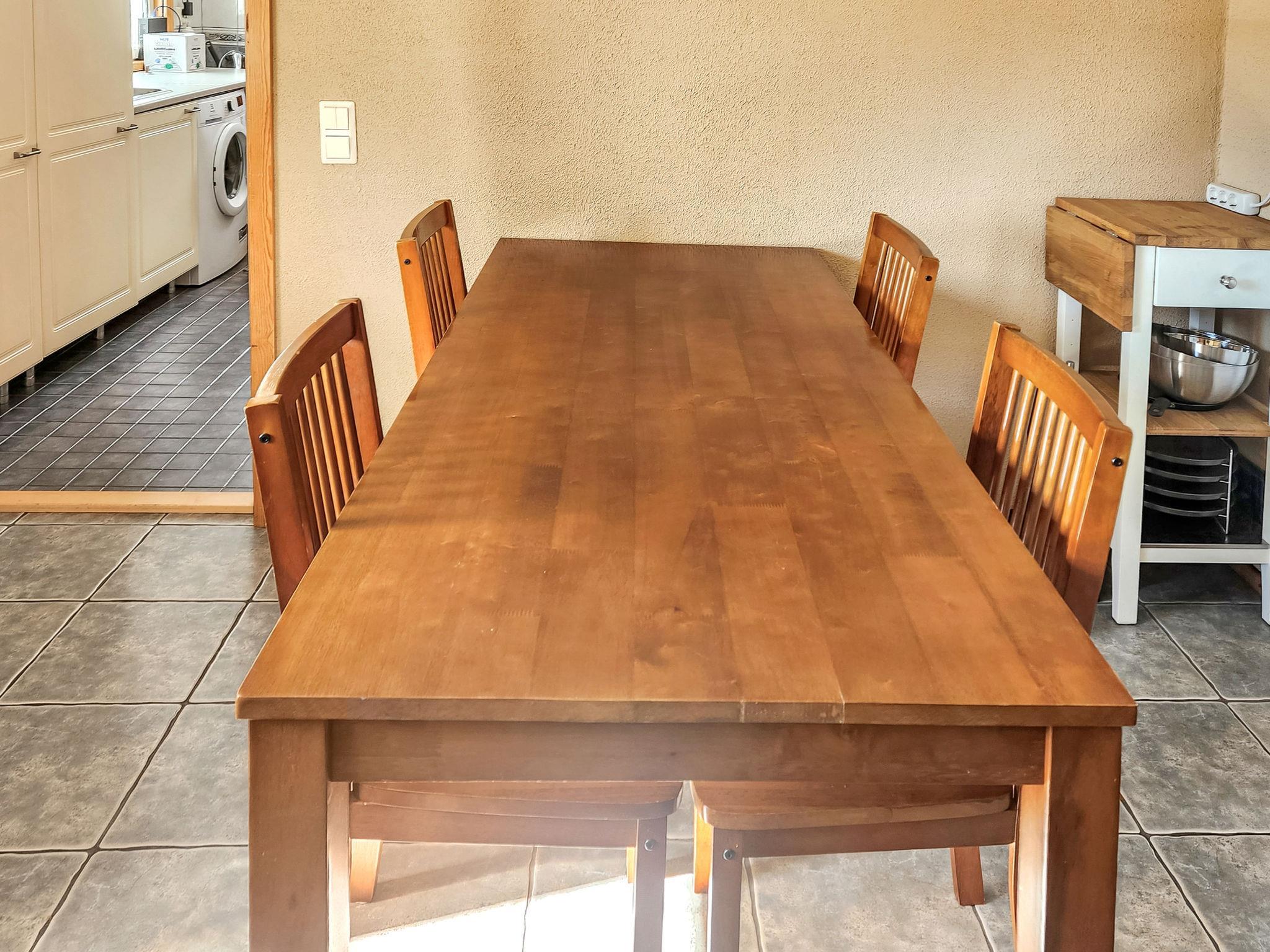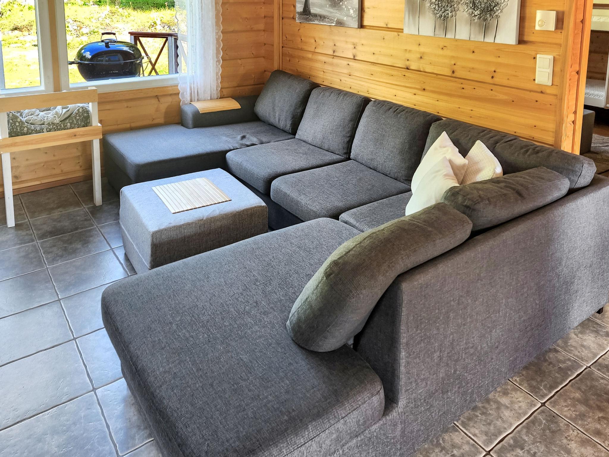 The spacious living room/kitchen features a large sofa set, a large Smart TV, and a heat-storing fireplace. The kitchen area is equipped with everything needed for cooking and dining. The wood burning oven in the kitchen is not available to the clients.