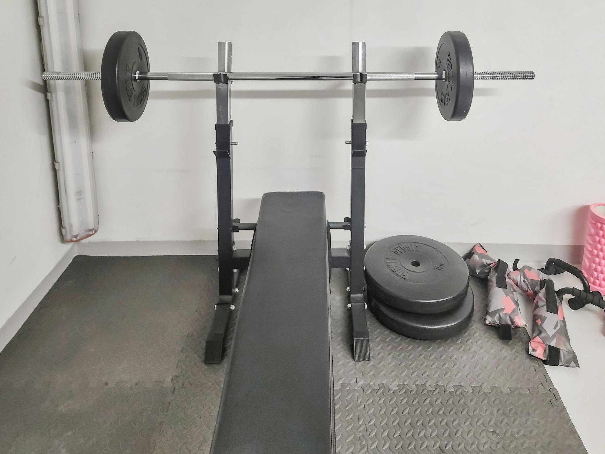 A separate outbuilding houses a small home gym with a bench and weights for light workouts, as well as a table tennis table and table curling.