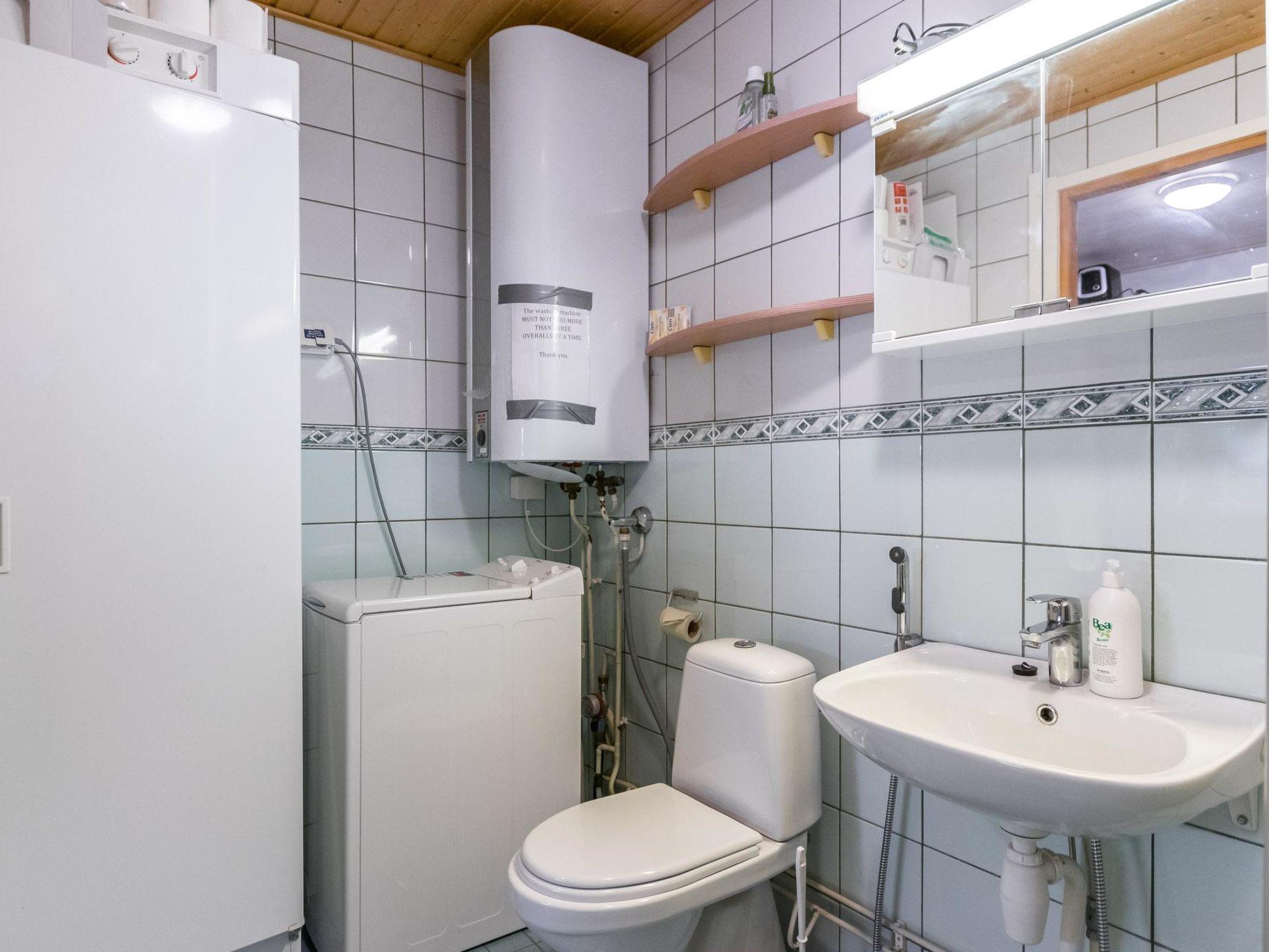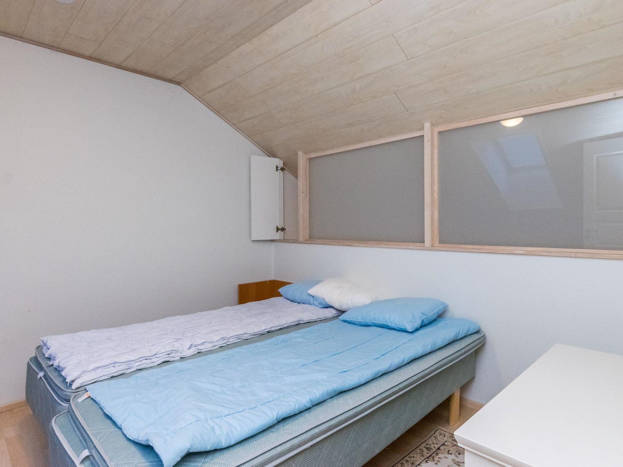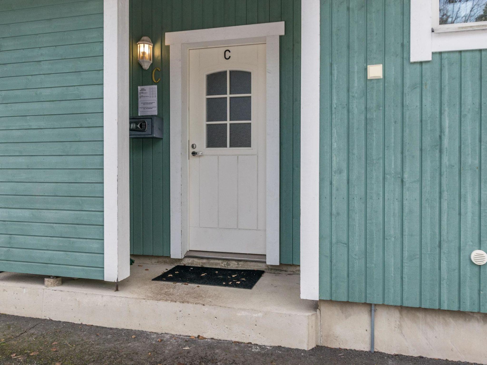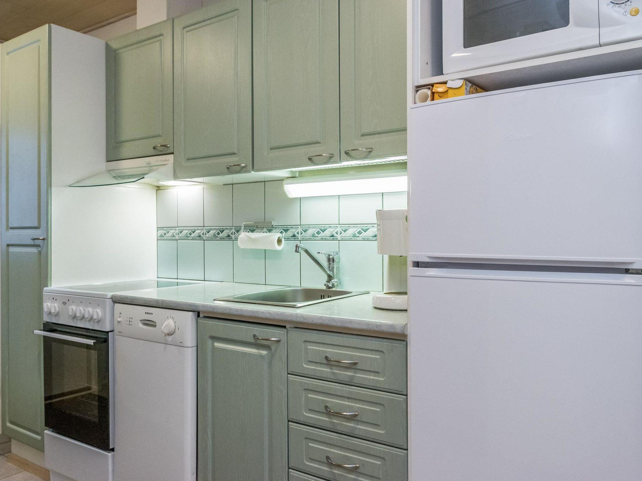 An apartment in a row house, built in 2002. The ground floor has an open-plan kitchen/living area with a double bed, a bathroom with a WC and shower, and a sauna with an electric sauna stove. The back terrace features a charcoal grill.