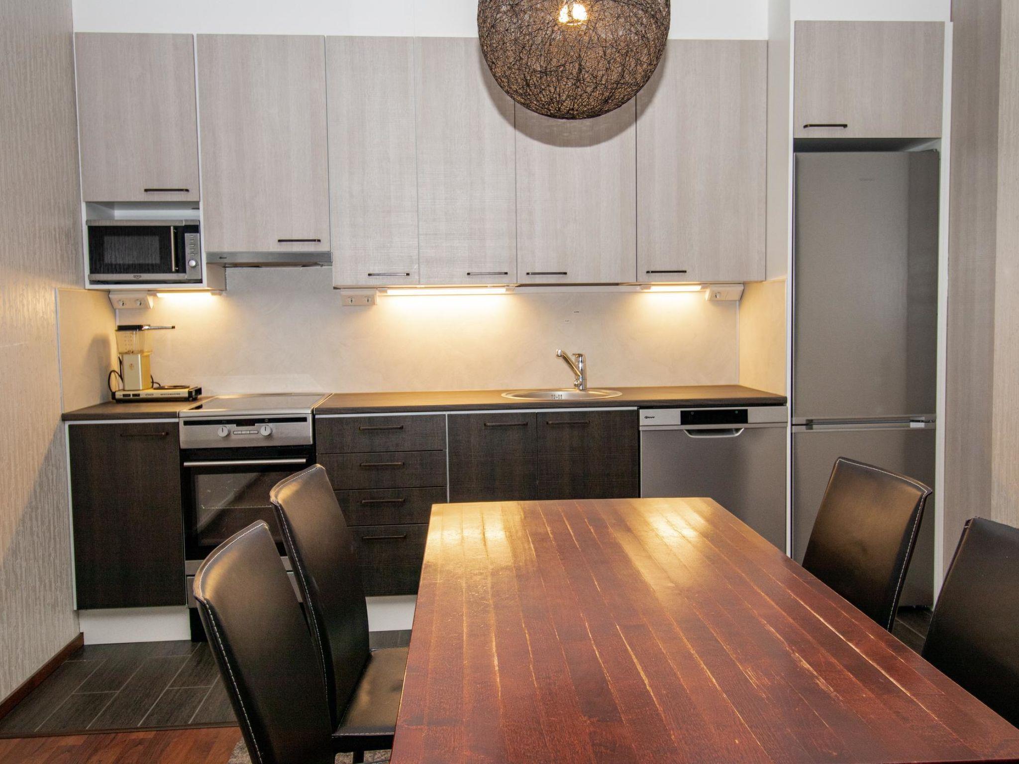 This apartment includes one room with a well-equipped kitchen, a separate dining area, two beds, and a bathroom with a WC and shower.