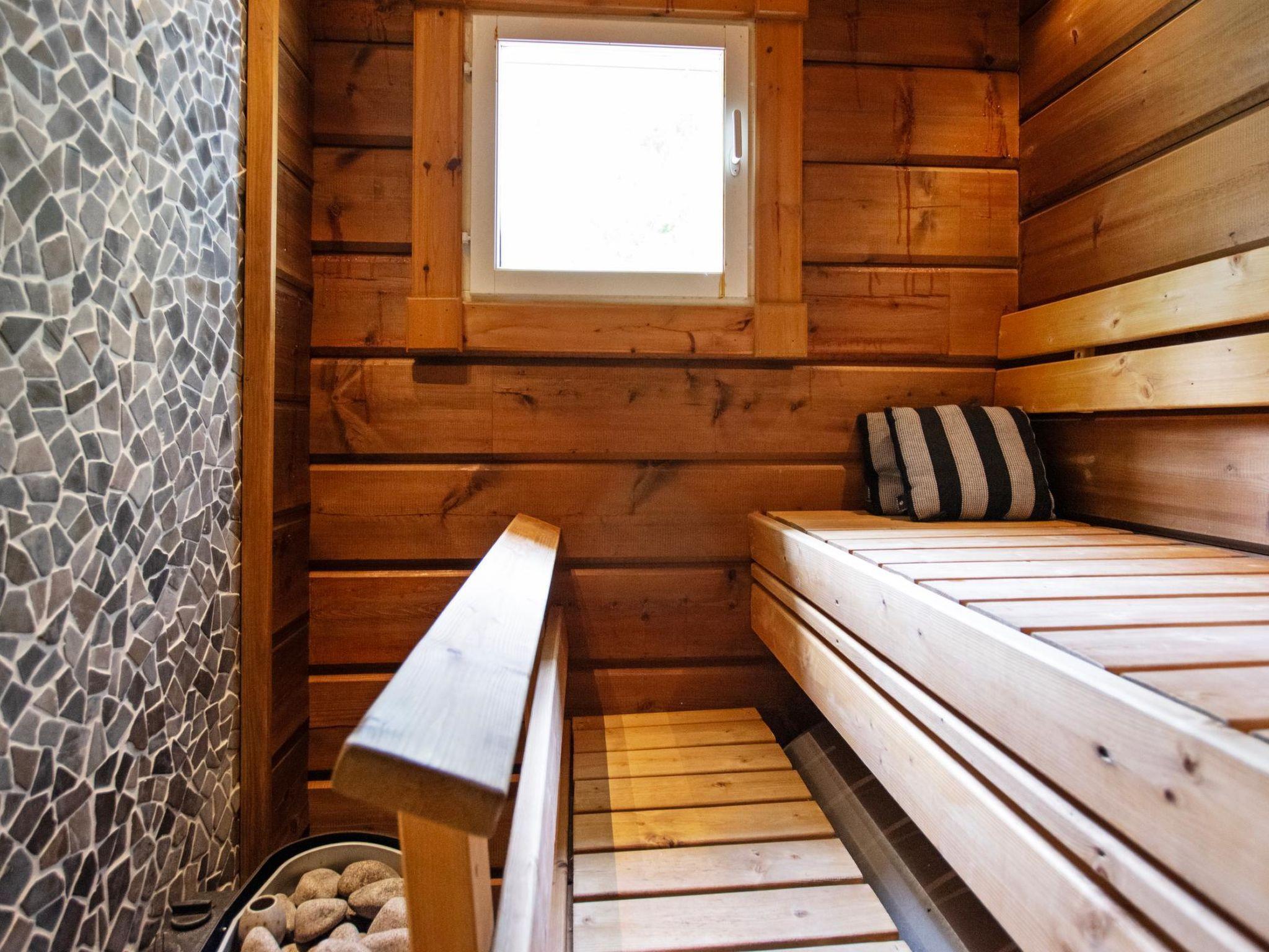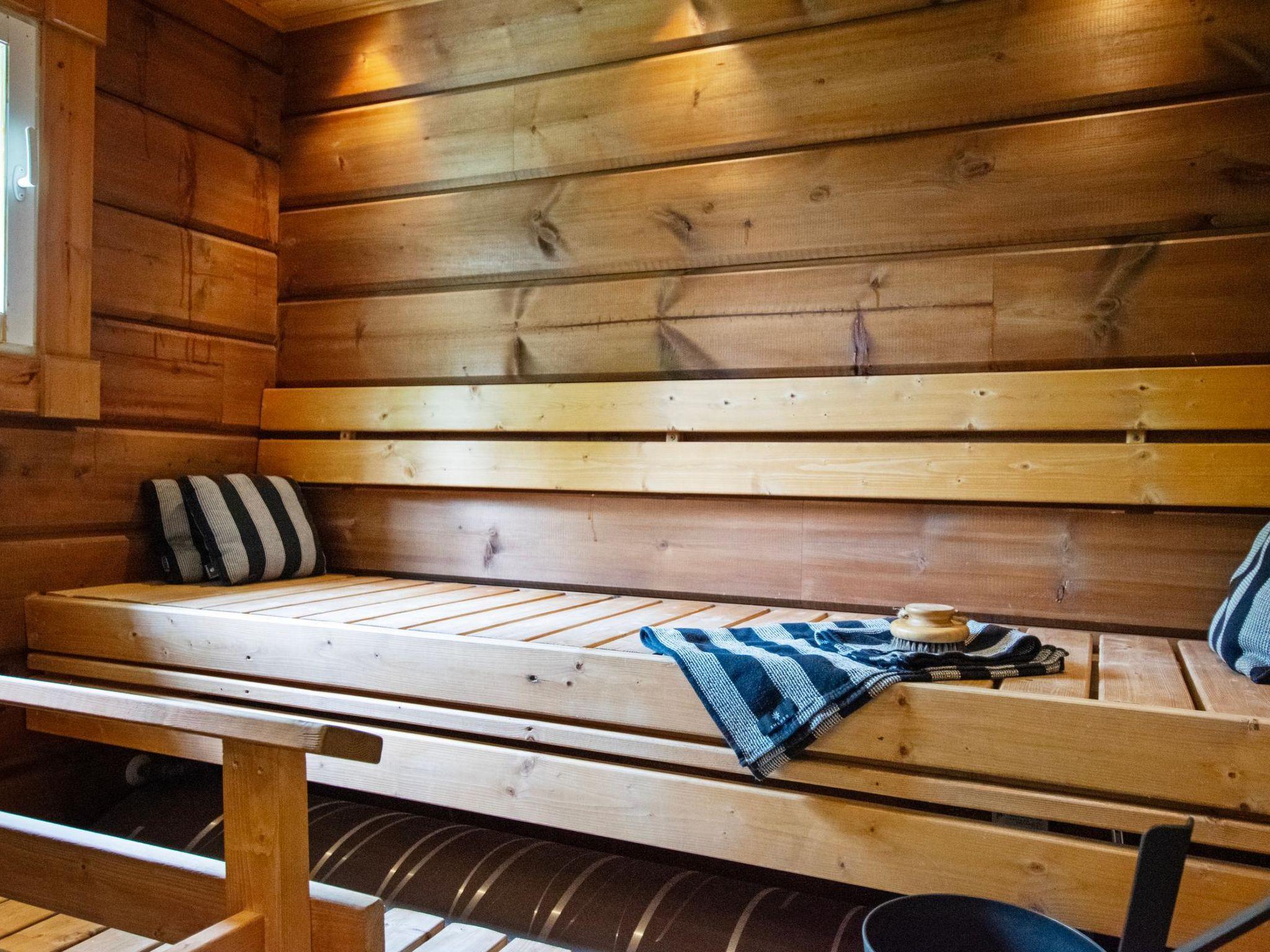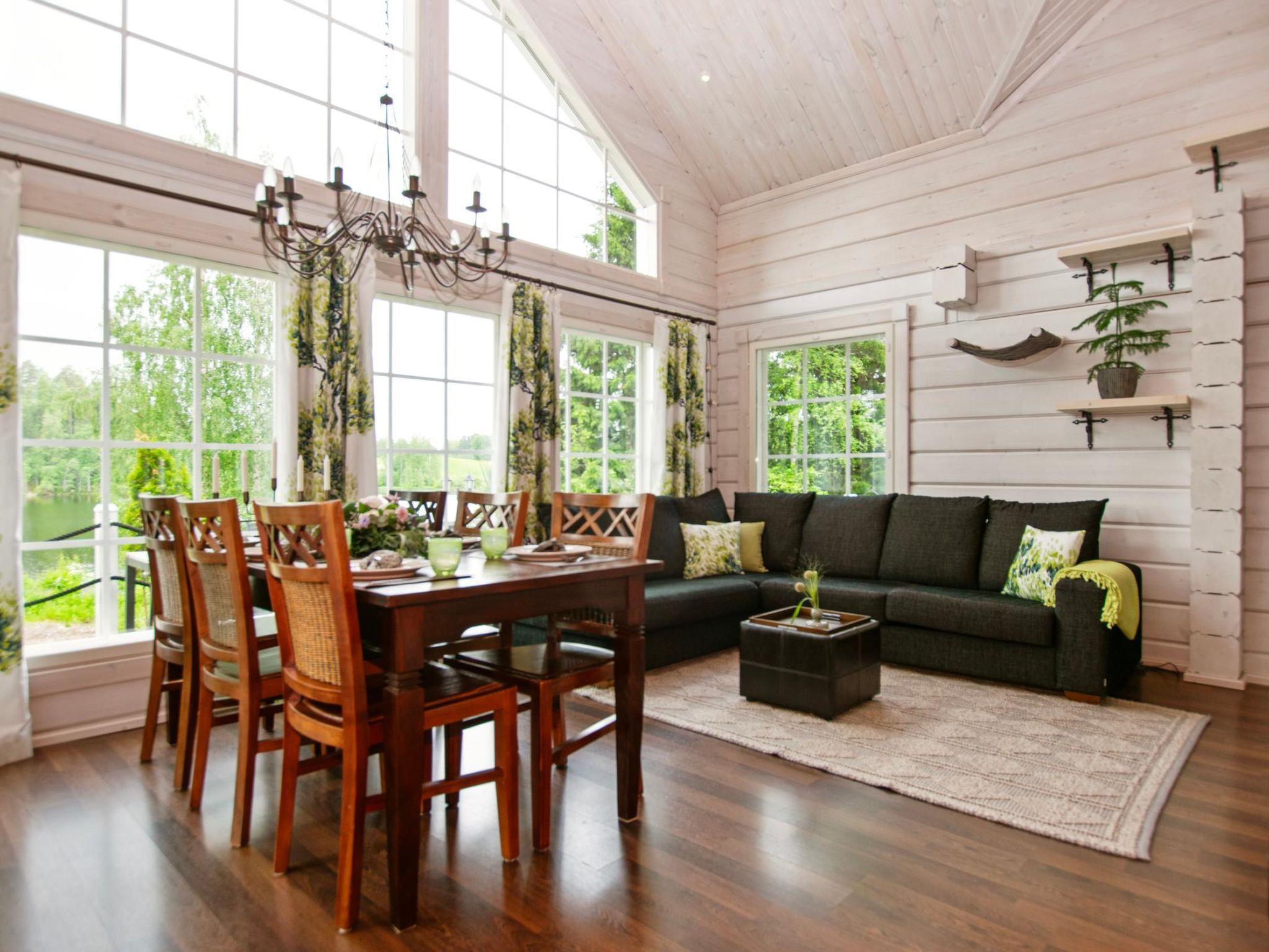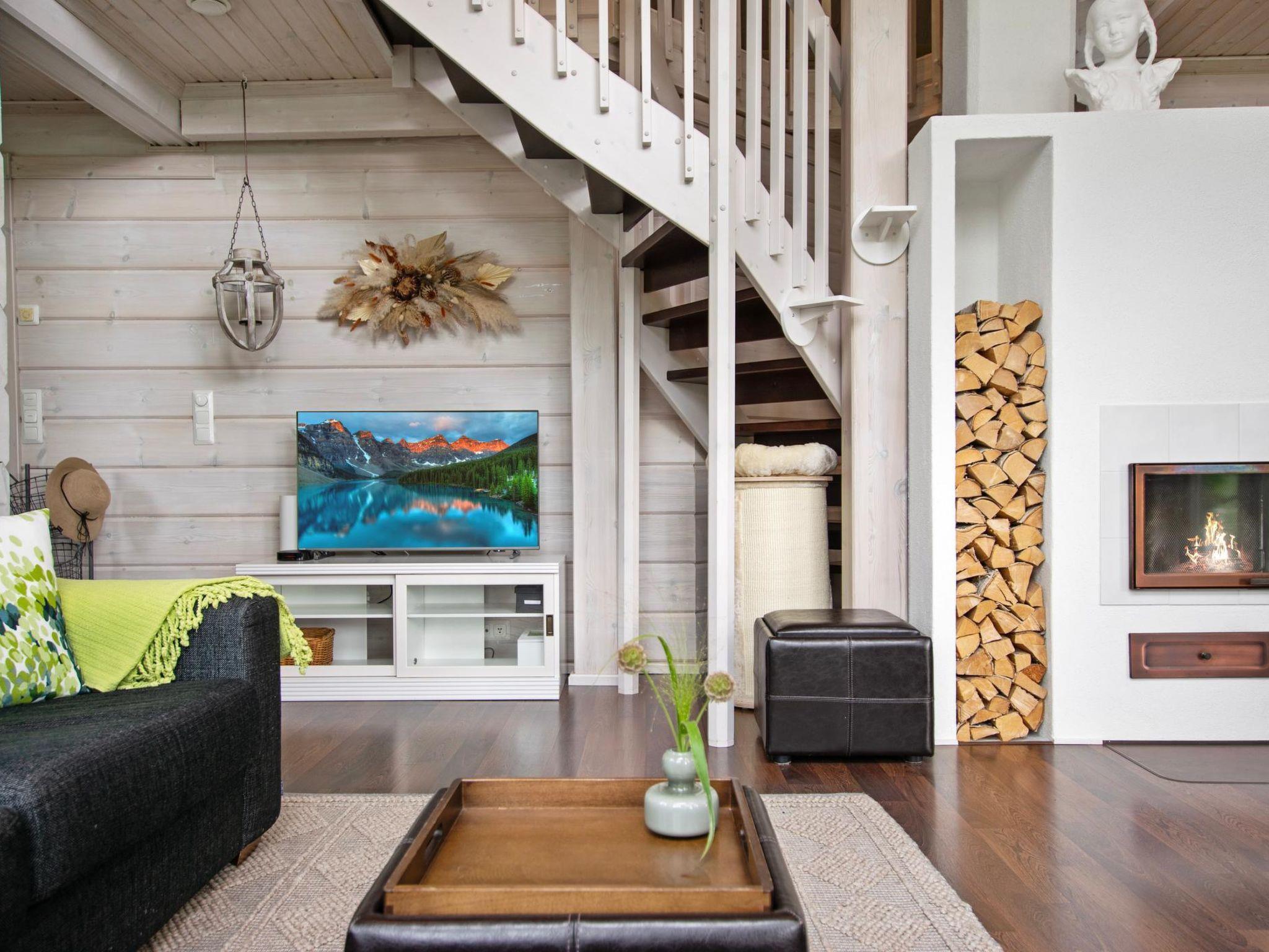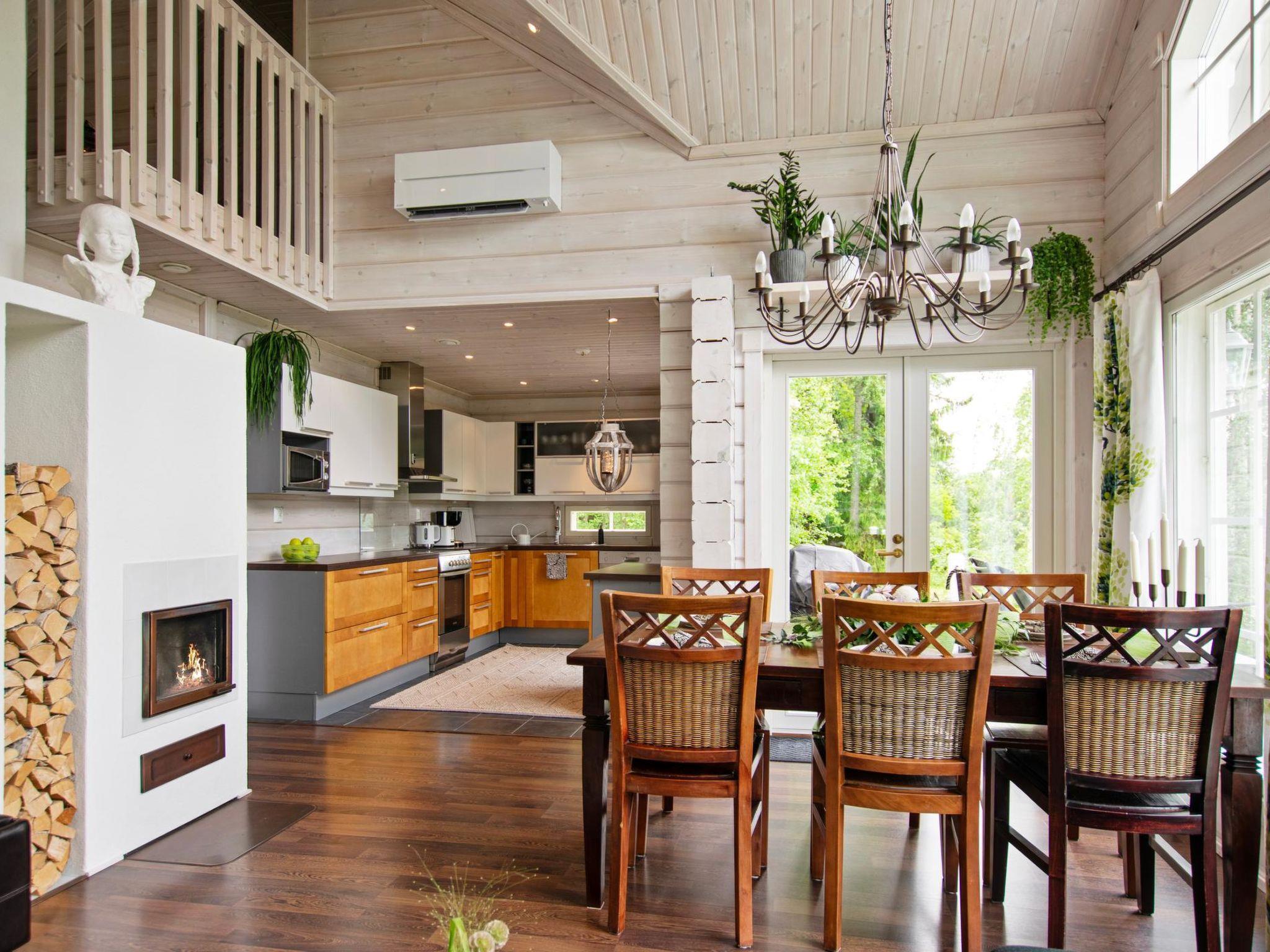 This log-built villa (2009) features a spacious living room with a comfortable seating area, a heat-storing fireplace, and a large dining table. The kitchen is well-equipped for meal preparation. There is a separate WC and a utility room with a washing machine. The washroom includes a shower and a sauna with an electric sauna stove.