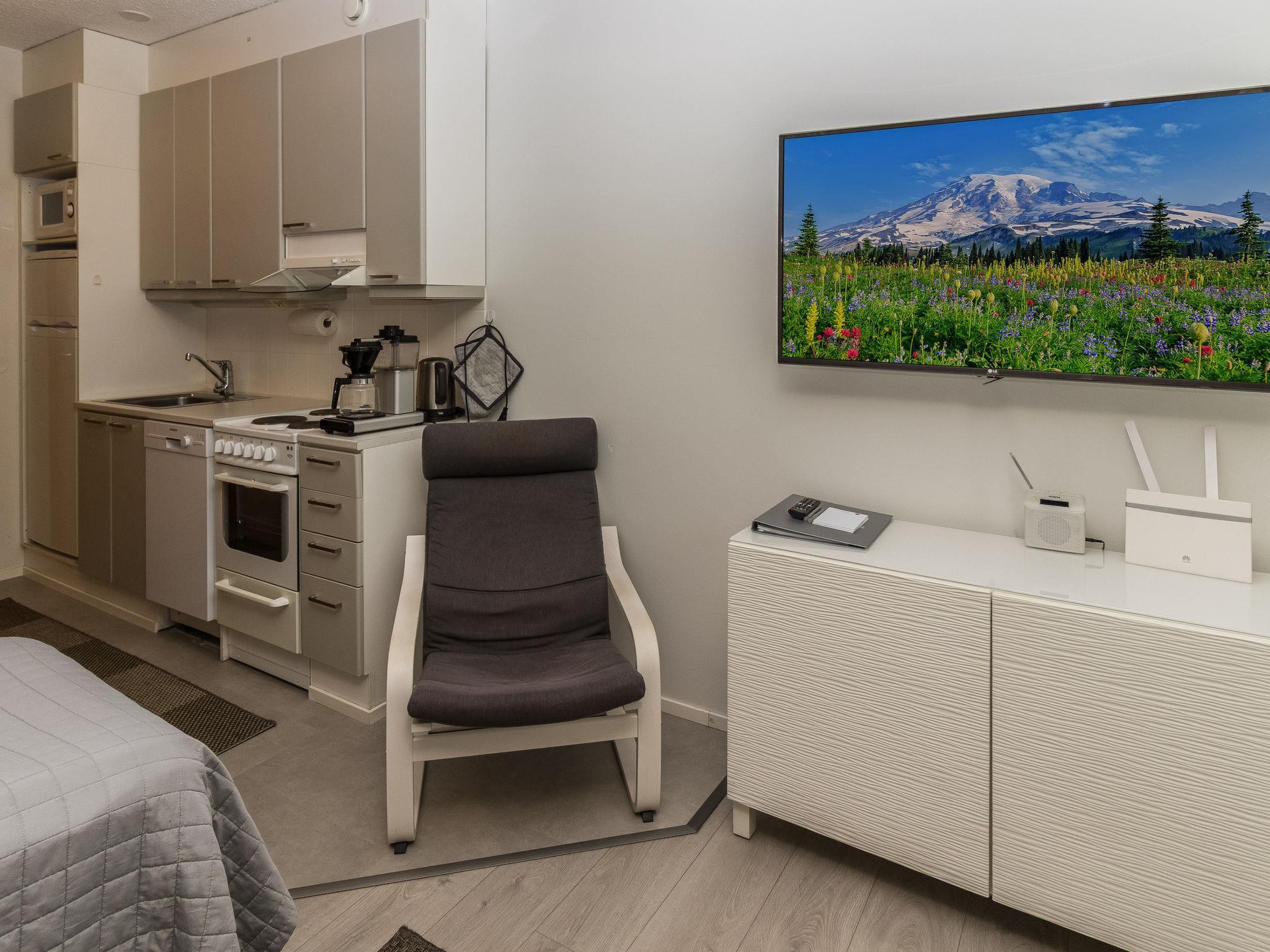 The apartment has its own corner for cooking. The living area combines a dining area and a sleeping area with two separate beds for relaxing sleep.