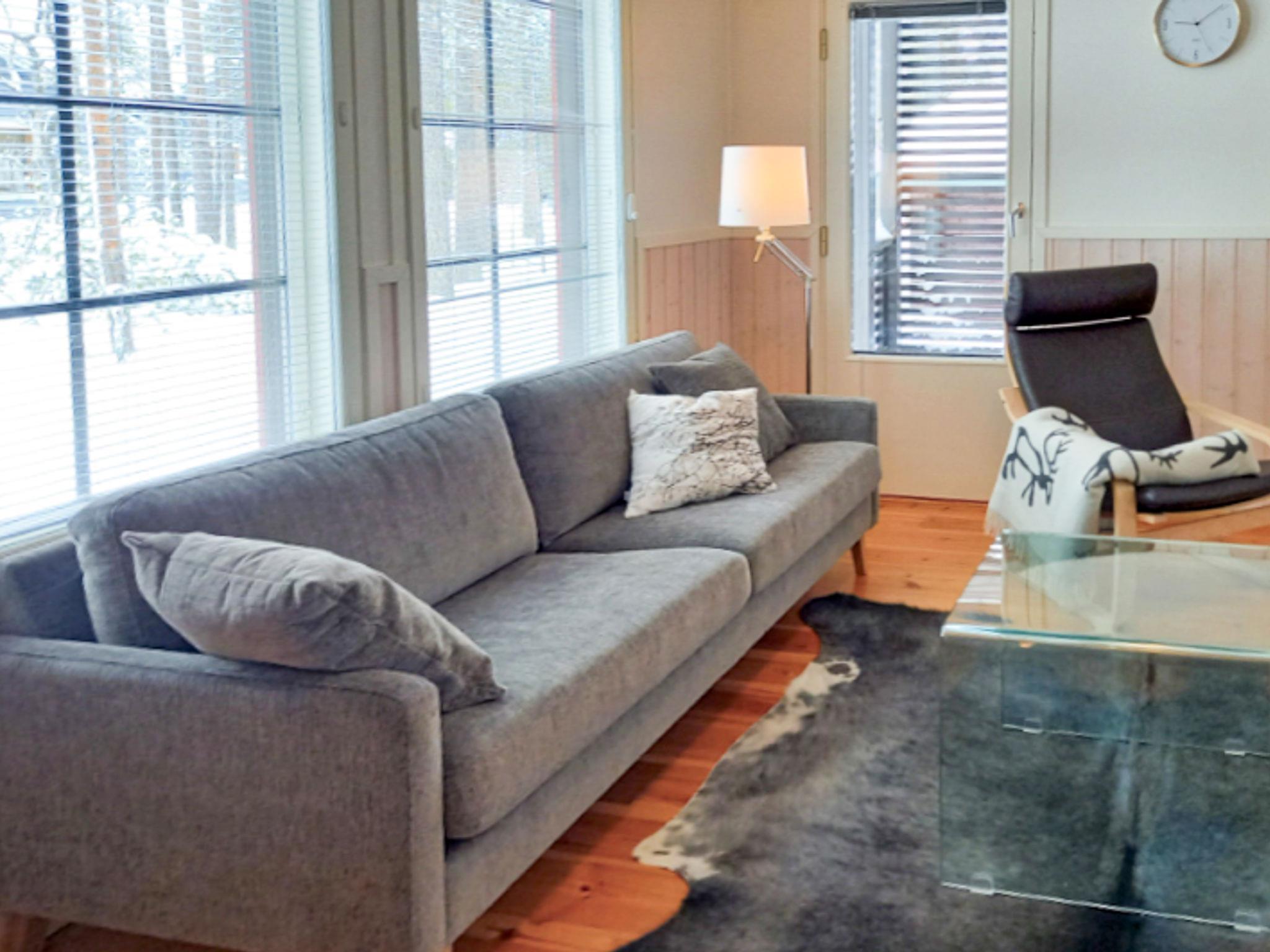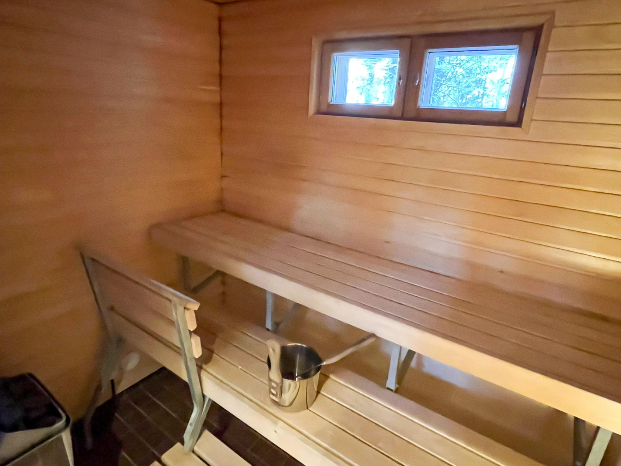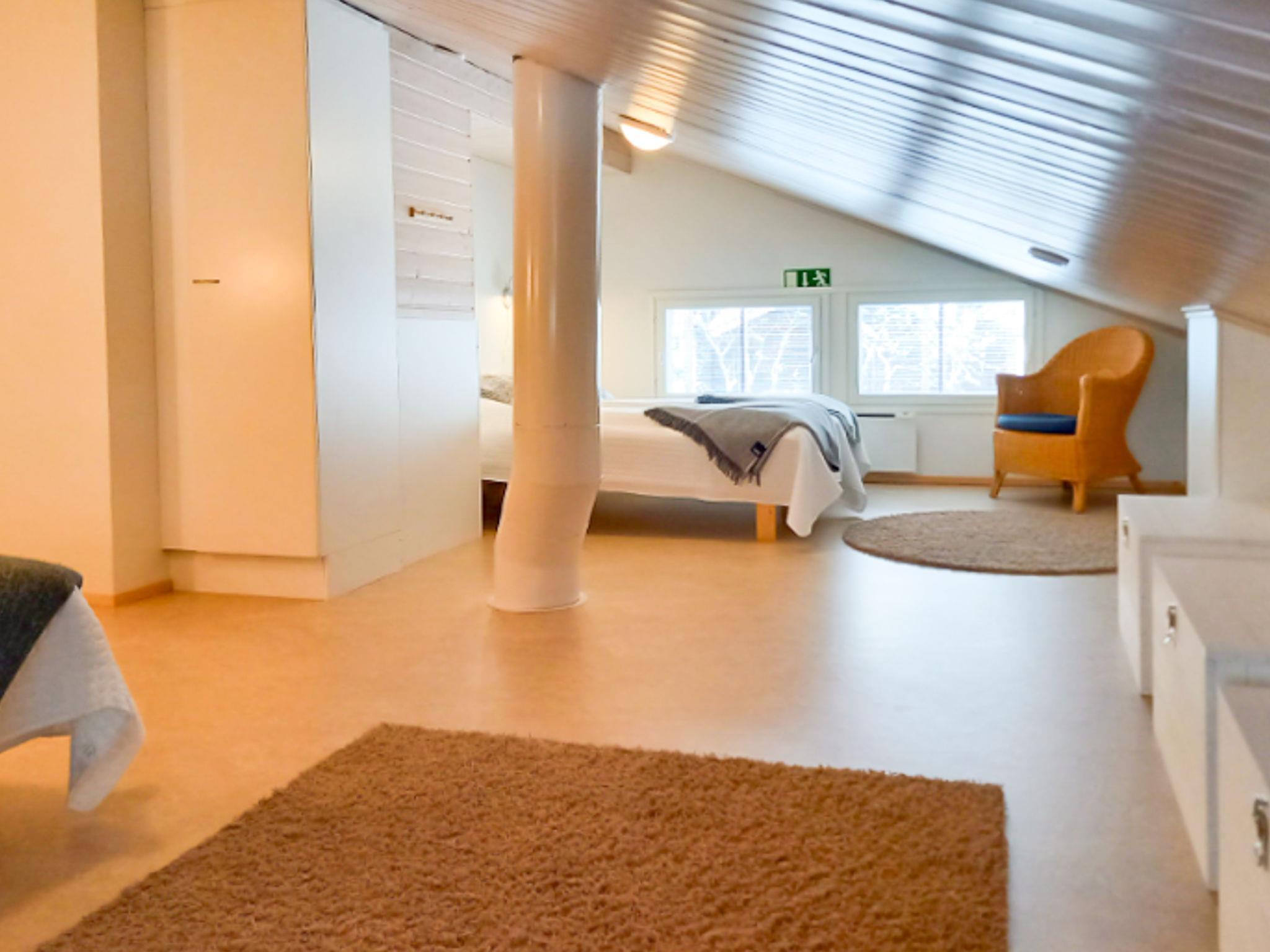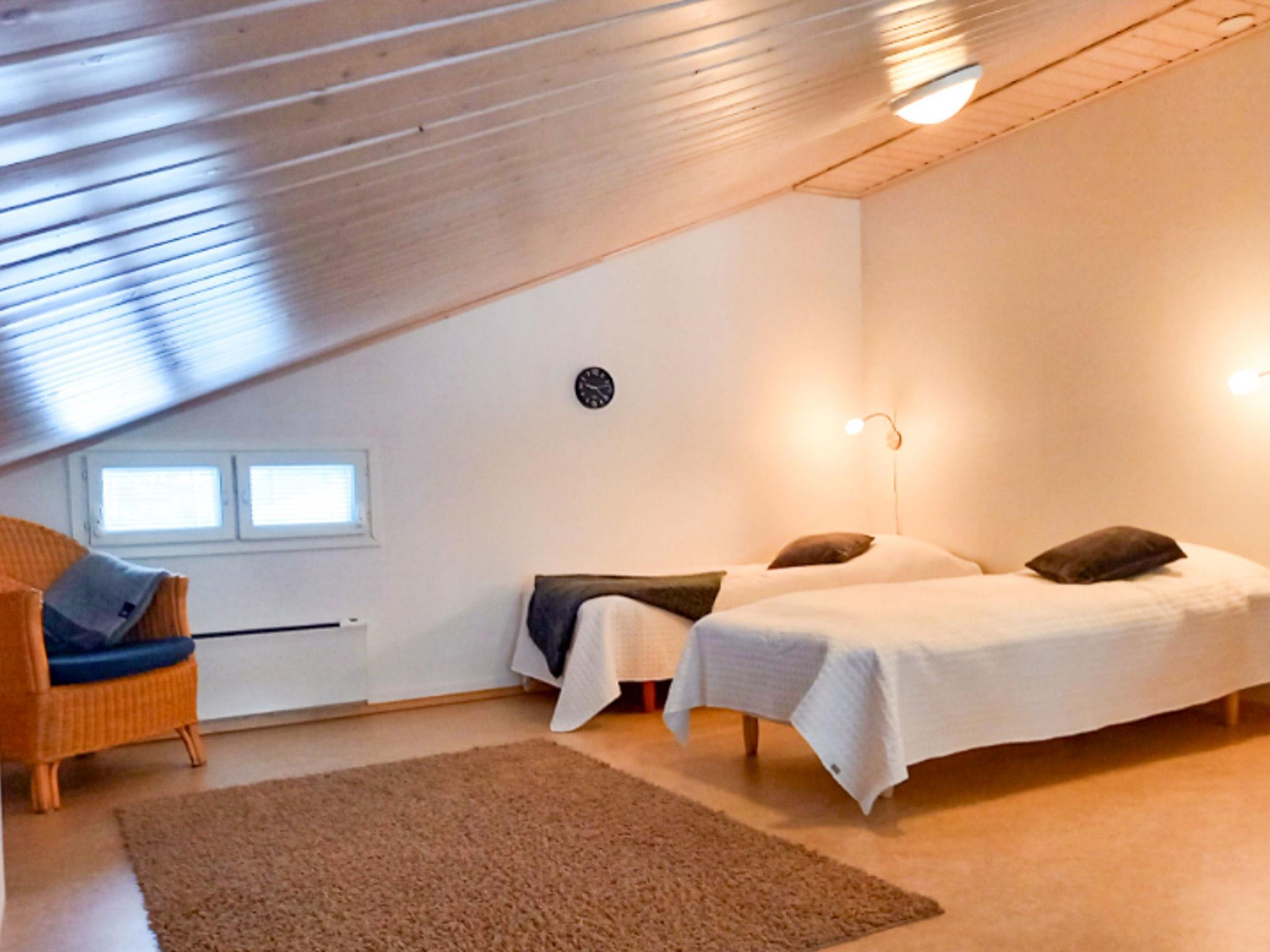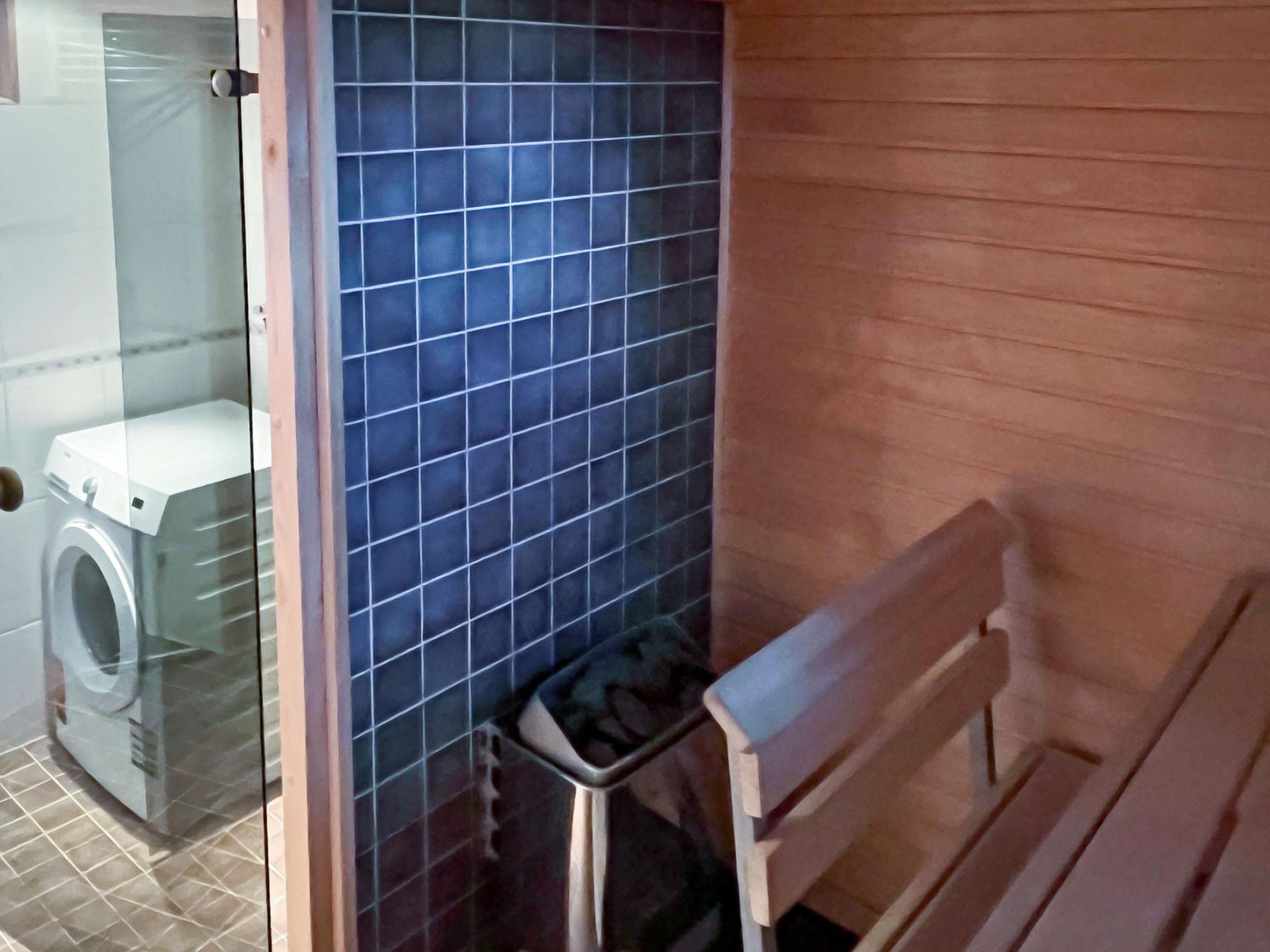 The area of ??the apartment is 84.5 m², on the ground floor there is a kitchen, sauna, washroom, toilet, bedroom and terrace. Separate beds for 2 in the bedroom. Upstairs, the large bedroom with a pitched roof has beds for four in two separate sections. The second bedroom upstairs has a double bed and access to the balcony. Vacationing is facilitated by another toilet in the lobby upstairs.