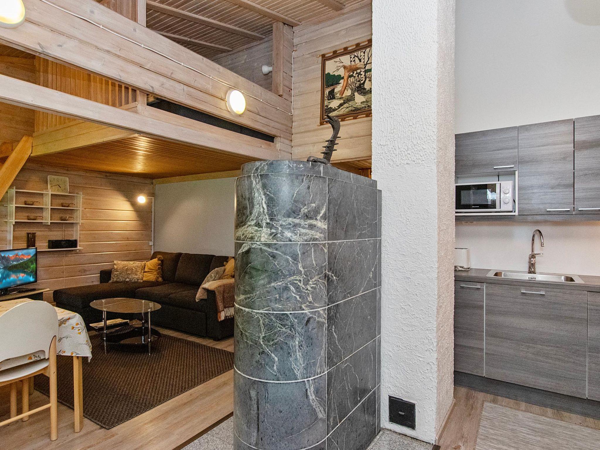 The well-equipped apartment's kitchen-living room has its own corner for cooking. The apartment's fireplace creates a cosy atmosphere, and divides the kitchenette from the living area.