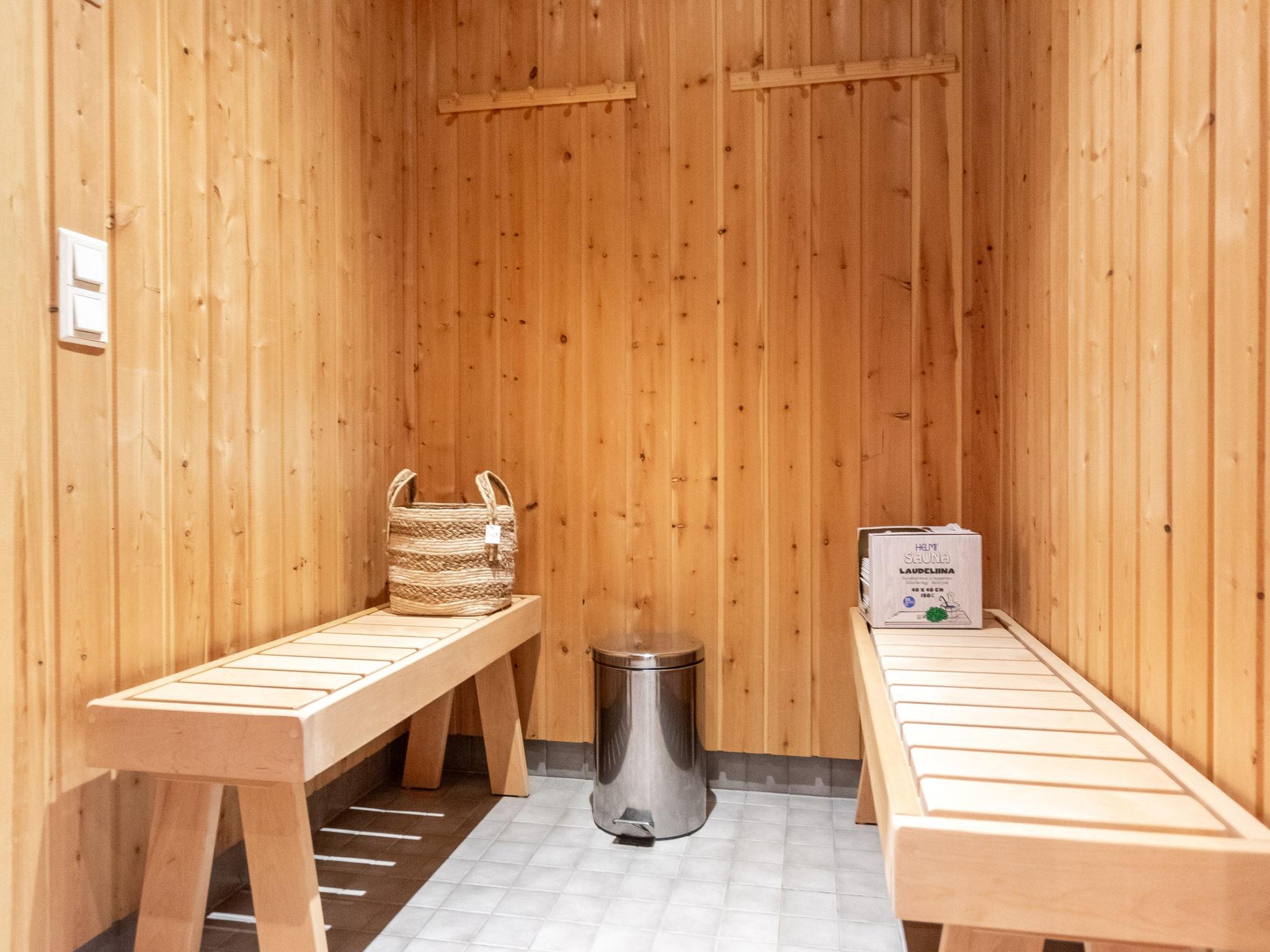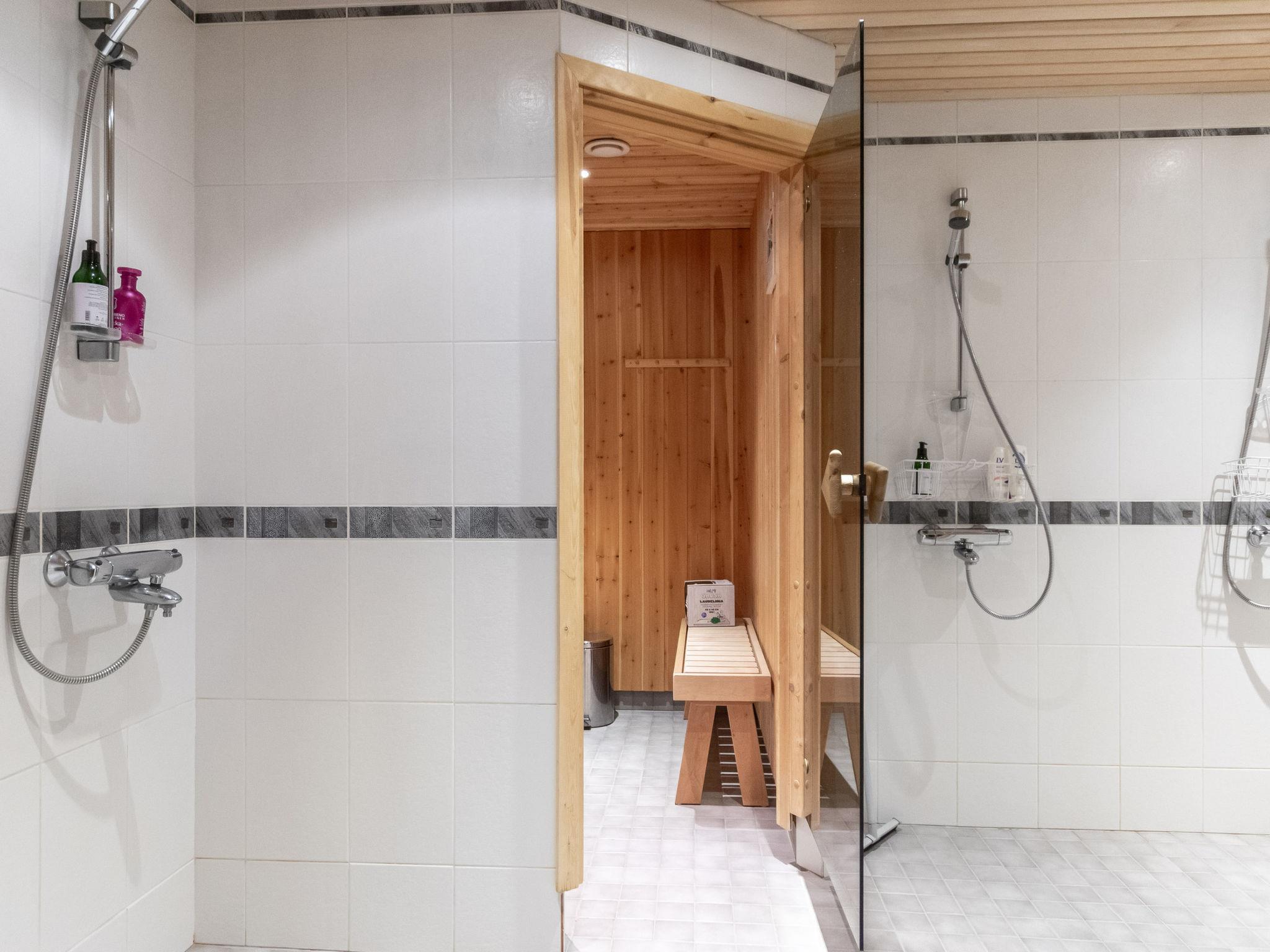 The entrance floor has also a kitchen and a 90-square-meter living area with a dining table for 14 people and a fireplace. Downstairs there is also a fireplace room/meeting roomand a sauna section.